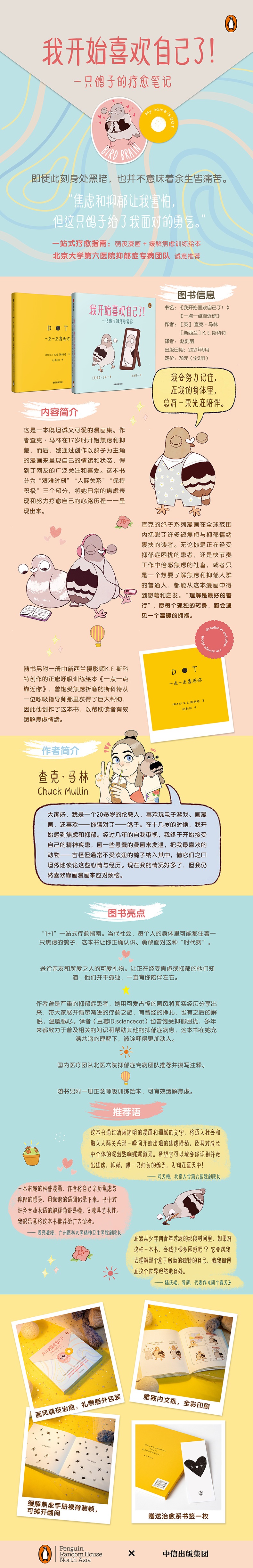 焦虑如同一场冒险。虽然通常人们觉得情绪障碍患者只会整天坐在那儿哭。的确,有不少人是这样的,但并不是所有患者都会这样。毕竟,我有时边哭还边到处跑呢。 还有一连串复杂的情绪和感受跟焦虑相伴相生——紧张,恐惧,短暂得如同偷来的快乐,勉强维持社交的疲惫,永远怀疑自己是否值得拥有美好事物的纠结,等等等等——通常这些一言难尽的情绪和感受会携手出现,共同强喂给你一杯令人绝望的苦水,你却无力拒绝,只能咽下。 我第一次感受到焦虑是在十七岁左右,那时我正在申请大学(在大学里,除了当时的男友以外,我没能和其他任何人成为朋友),要开始独立生活,焦虑织成了一张密网,我被网在其中动弹不得,如同被蛆虫啃噬的腐尸。(友情提示:千万,千万,千万,千万,千万不要为了爱情放弃其他的一切——比如,因为一个爱人,就放弃自己亲友的陪伴,孤身到他所在的地方去上学,或者工作。这样的选择很难有好的结局。)起初我以为这只是在经历人生重要阶段时常见的紧张罢了,毕竟是在准备考大学,完全可以理解。这股紧张感渗透进了我的身体,突然间我就说不出完整的句子了,只能勉强吐出的破碎词汇让我显得更愚蠢,我痛恨这样的自己。 和室友一起参加大学迎新会的那个晚上,我突然觉得,一切都不对劲了。刚一踏进会场,就感觉自己仿佛被水淹没,无法呼吸。太多事物在刺激着我:太多强光,太多噪声,太多人!是的,太多人,我觉得自己好像骤然间被所有人同时注视着,我的一举一动、穿着打扮,甚至我这个人本身,都成了他们嘲笑我的理由。有趣的是,焦虑这种情绪居然能让你觉得自己是在场最举足轻重却又最没有价值的人。在此之前,我从没有经历过这种海啸一般席卷而来的情绪。我大概在门口站了一分钟左右,然后看似冷静地直接走到吸烟区,翻过用来防止别人偷偷溜进会场的安全门,落荒而逃,一路回到寝室,把自己埋进被子里。我是哭着睡着的。当时是晚上十点,我的大学生活才刚开始八小时。 在接下来的几年中,这样的场景上演的次数与日俱增,不只是那种人群密集的场合才会触发这种感觉,有时那种无足轻重的小事也一样。只是简单同别人交流几句,都会让我觉得自己是个水泵,噗噗往外冒汗。光是想到马上要进行社交,而我毫无准备,我的心就会狂跳到超速。 我鼓起勇气,试图去就医,并尝试接受心理咨询。但一道有如实体的屏障阻碍着我去接受任何来自外界的帮助。我不知道该如何描述我的感受,该从哪里开始说起——我甚至不知道为什么我会有这种该死的感觉。所以我只能用唯一看上去合理的方式来解决这个困境——把所有情绪都封存起来,压制在大脑最深处。 这种压抑居然带给我一种奇异的天赋,让我能假装像一个“正常人”那样生活。我表面上游刃有余地穿梭在各种社交场合之中,与此同时,内心却在尖叫,期待着可以逃回家埋进枕头里大哭的那一刻。我可能跟三四位密友谈到过这种感受,但也只是闲聊似的发个信息——从来没有当面说,除非我的情绪真的澎湃到失控,连撑出一张没事的笑脸都做不到了。 尽管我以为我已经不可能更加讨厌自己的生活了,但随着大学毕业,我还是对自己的未来越发幻灭。我觉得我好像被困在了工作岗位上——作为一个销售,面对的客户们都是富人区里傲慢得趾高气扬的蠢货,他们随时随地都是一副“给我把你们经理喊来”的派头。 我一直都热爱画画,当发现这可以成为我释放压力的出口时,我开始涂鸦一些傻气的漫画,试图用这种方式来描述我那噩梦般的生活。我没有专业的扫描仪,也没有专业的绘图软件,所以我就只是把画在纸上的漫画拍成画质糟糕的照片上传到汤博乐(Tumblr)和脸书(Facebook)主页上。 有一天,我在市中心等一个朋友,无所事事地看一只鸽子在地上啄来啄去。一对中年夫妻走过,立刻开始抱怨他们有多讨厌鸽子,还管它们叫“长翅膀的脏耗子”。 我一直很爱鸽子,我觉得它们可爱又古怪,但它们一直以来都被污名化了。人们以前用鸽子传递信件,在一些运动中也会用到它们,还把鸽子当成一种宝贵的食物来源,那时它们是备受推崇的。然而一旦出现更好的替代品,人们就会把自己驯养的大量鸽子“放生”——这就是城市里有那么多鸽子的原因。我开始想象,如果一只鸽子能听懂那对中年夫妇对它们的羞辱,它会不会因此厌弃自己?这让我感到难过。回家后,我画了一张关于此事的漫画。很多网友好像都非常喜欢。 大家的积极反馈鼓舞了我,我开始用鸽子来代表自己,去表达那些跟精神健康有关的题材。说起来有点儿奇怪,但把自己投射到一种容易被人轻视的东西上,还能得到积极的回应,这能给我安慰。即使你烦人的大脑在拼命说服你“人们都讨厌你”,你还是会觉得,如果人们连对关于我的这种古怪描述都能喜欢,那应该 也会喜欢完整的我吧。 你可能会奇怪,为什么我画的鸽子,眼睛有时是飘出去的。答案很简单,因为我觉得这很有趣。为什么不呢?为什么人们会做他们所做的那些事呢?别担心这个,怎样都是可以的,不需要有“理由”。 当我做出画鸽子的决定,并且真的画了很多鸽子漫画之后,现在的我开始写这篇序言。我要出书了,这是一本真正的书!在这本书里,我所描绘的是我自己。我想看起来很淡定,但这不现实,事实上我觉得我激动得骨头都快抖到皮肤外面去了!谢谢你们,谢谢喜欢我