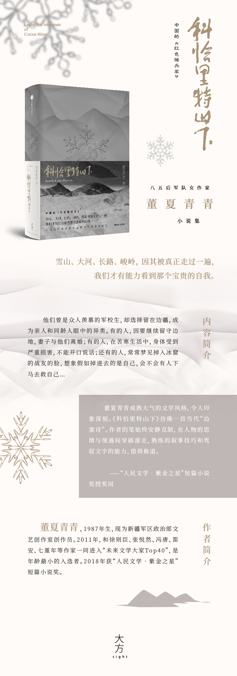 董夏青青,1987年生,现为新疆军区政治部文艺创作室创作员。1997年举办个人书法展,2002年获“纪念沈从文诞辰100周年”征文大赛一等奖,黄永玉为其颁奖。先后在《人民文学》《当代》《芙蓉》《青年文学》等多家报刊发表数十万字的作品。人民日报、中国青年报、湖南卫视等多家媒体对其进行过报道。2011年,入选《人民文学》杂志和盛大文学联合评选“未来文学大家Top40”。2018年获得“人民文学·紫金之星”短篇小说奖。《科恰里特山下》是其首部小说集。