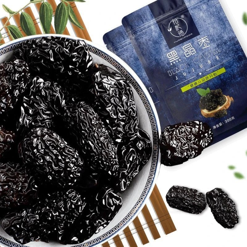 300g*2袋19.9,三蒸三晒黑晶枣 宁夏鲜骏枣手工柴火蒸制 2斤鲜枣出1斤黑晶枣 肉厚饱满 软糯香甜 配料表只有红枣基地直邮