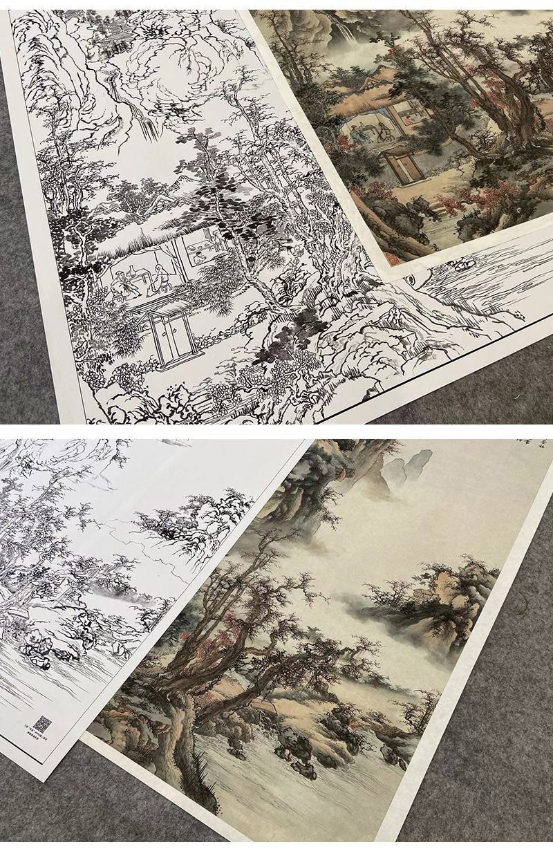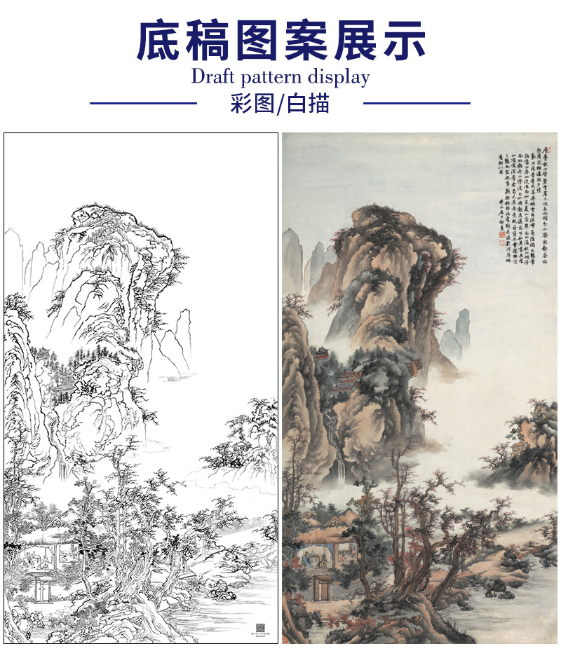 【大彩图】祁昆工笔画白描底稿《山水轴》临摹勾线高清打印稿A647