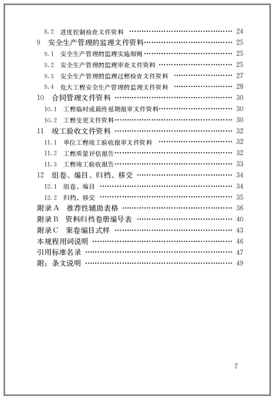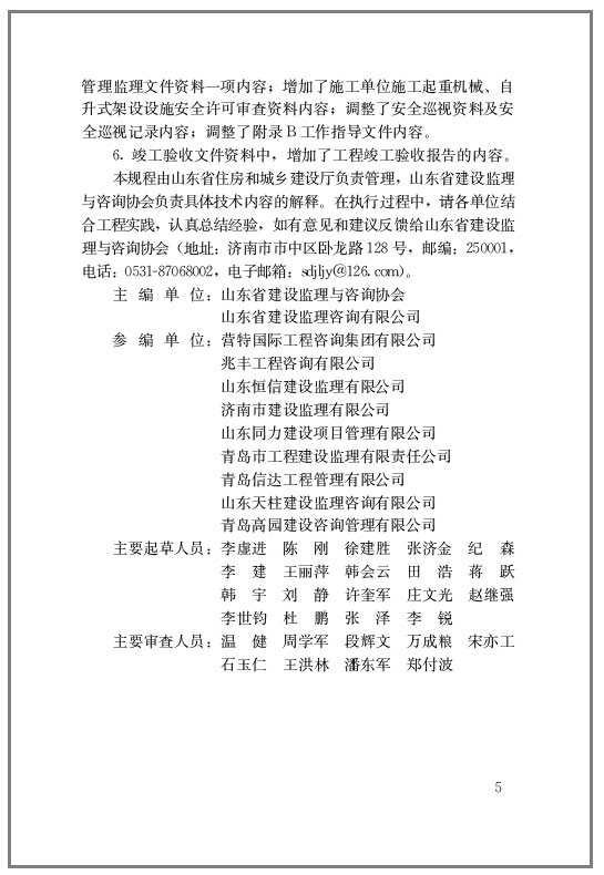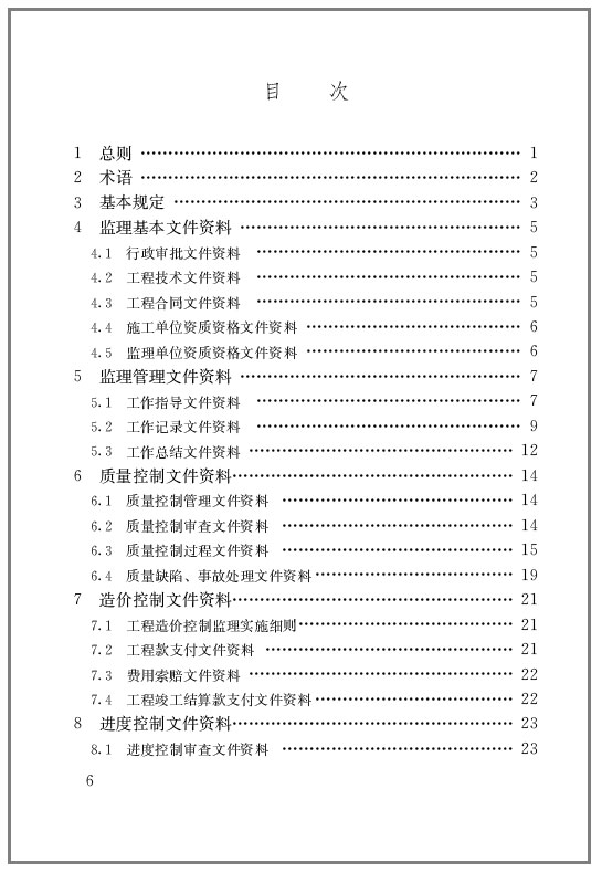 本规程是在国家法律、法规、规范基础上,结合山东省的相关法规、政策规定的实际情况进行了细化和延伸,规范监理文件资料的编制和管理工作,确保资料的真实、完整和可追溯性,保证监理工作成果文件的质量。本规程的主要内容有:1.总则;2.术语;3.基本规定;4.监理基本文件资料;5.监理管理文件资料;6.质量控制文件资料;7.造价控制文件资料;8.进度控制文件资料;9.安全生产管理的监理文件资料;10.合同管理文件资料;11.竣工验收文件资料;12.组卷、编目、归档、移交;附录。本规程的主要内容有:1.总则;2.术语;3.基本规定;4.监理基本文件资料;5.监理管理文件资料;6.质量控制文件资料;7.造价控制文件资料;8.进度控制文件资料;9.安全生产管理的监理文件资料;10.合同管理文件资料;11.竣工验收文件资料;12.组卷、编目、归档、移交;附录。