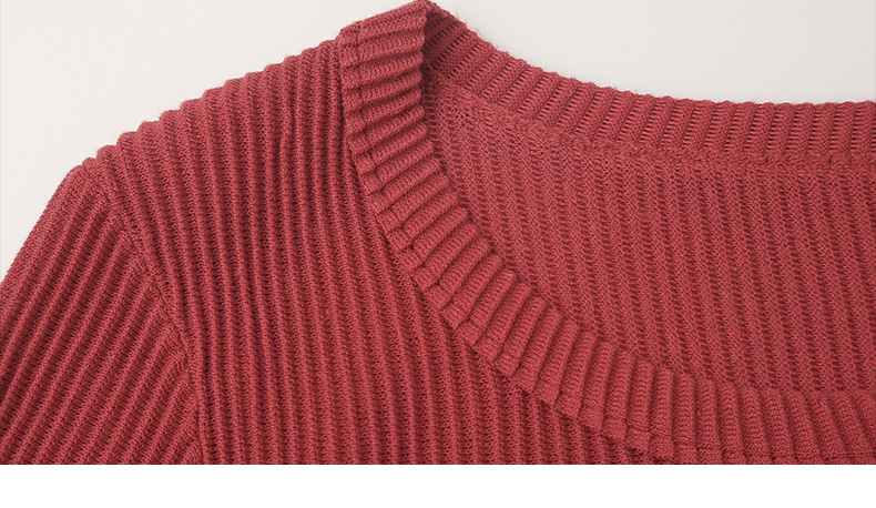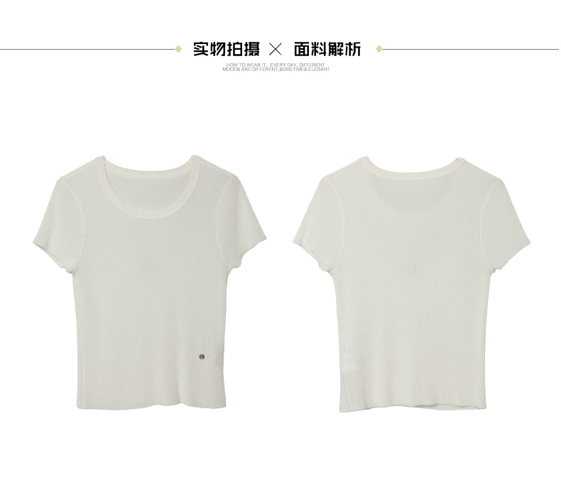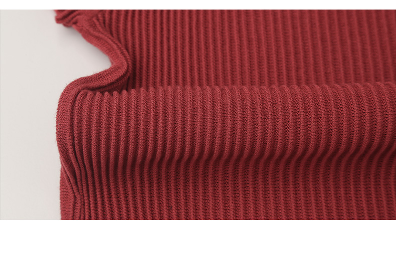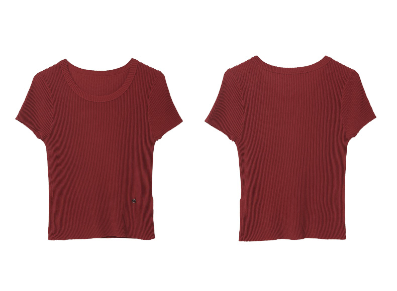酒红色坑条针织短袖 T 恤女 夏季修身显瘦圆领薄款百搭弹力打底上衣