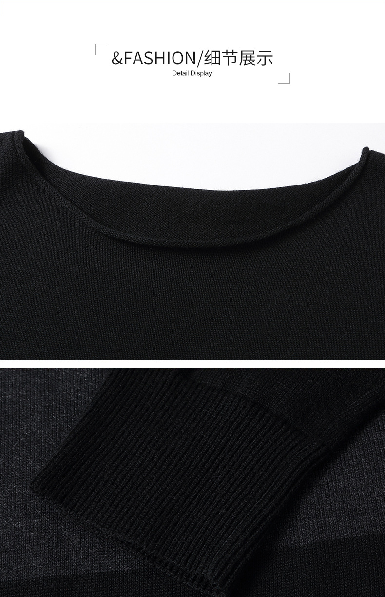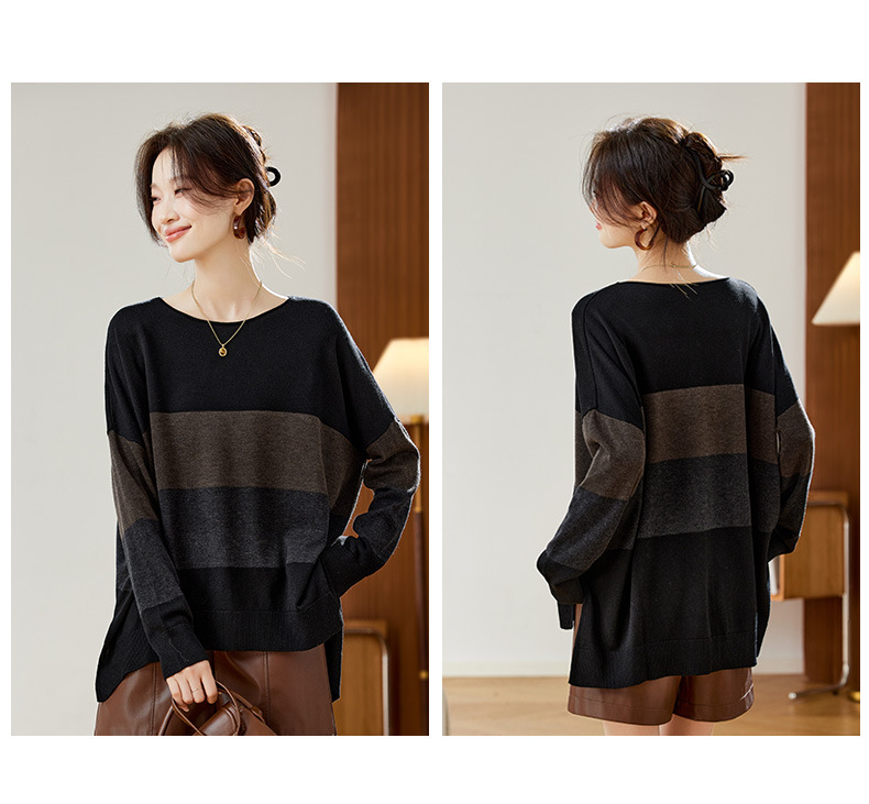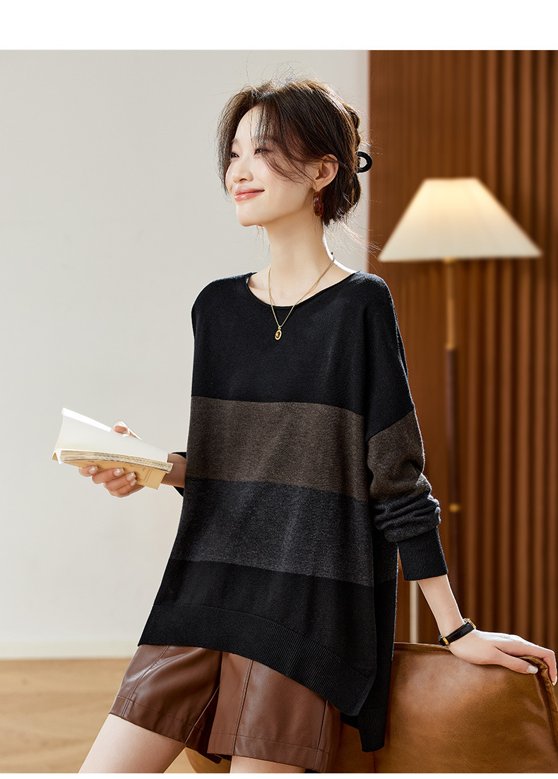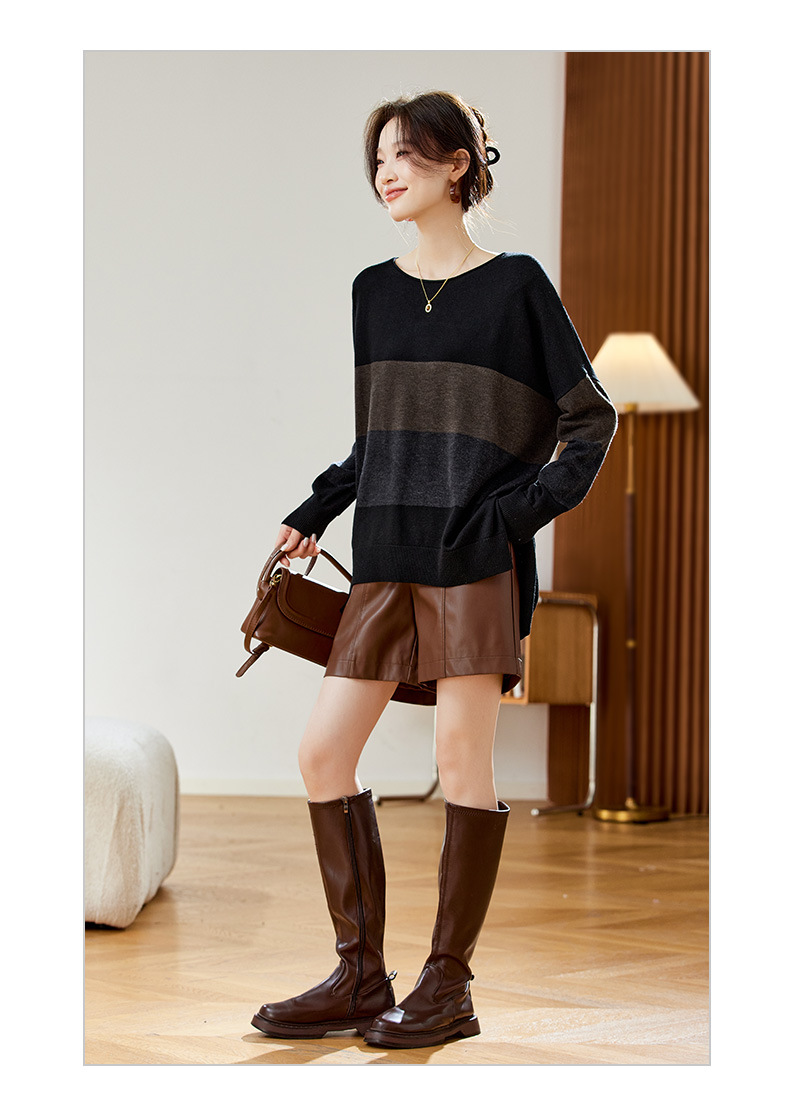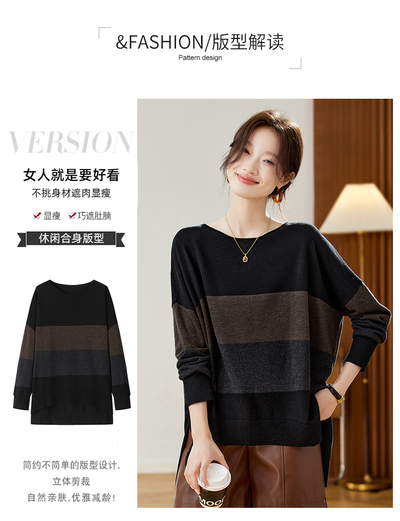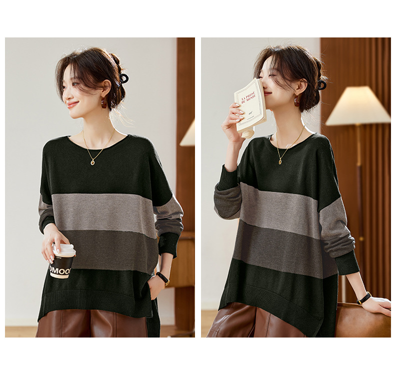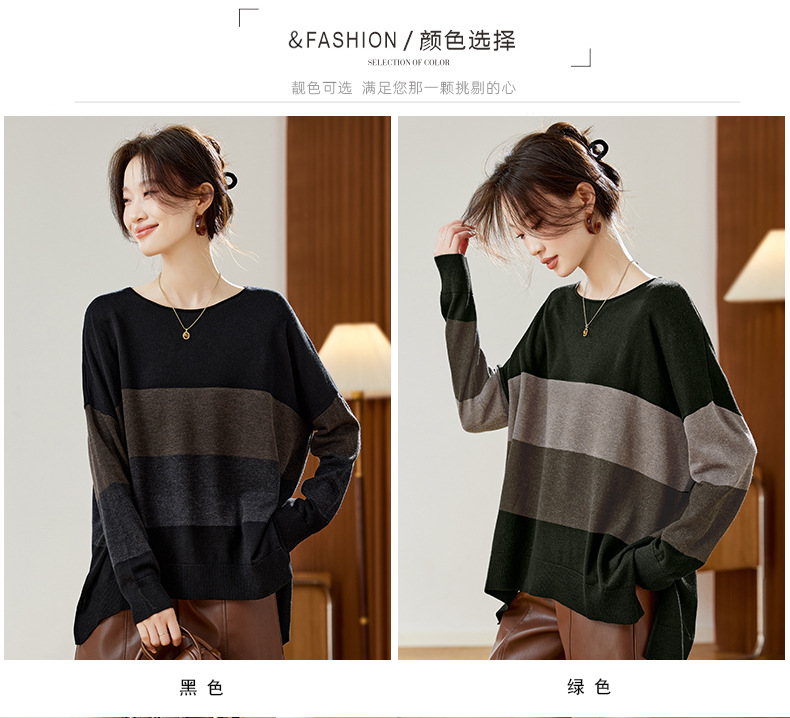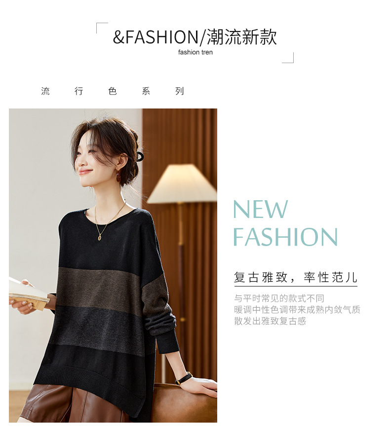 QDJD3036圆领条纹毛衣女秋冬2025新款宽松慵懒风小 个子针织打底衫上衣