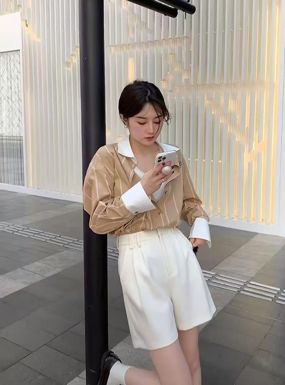 【诗铭洛可】W924衬衫撞色条纹100%棉长袖衬衫B21-3