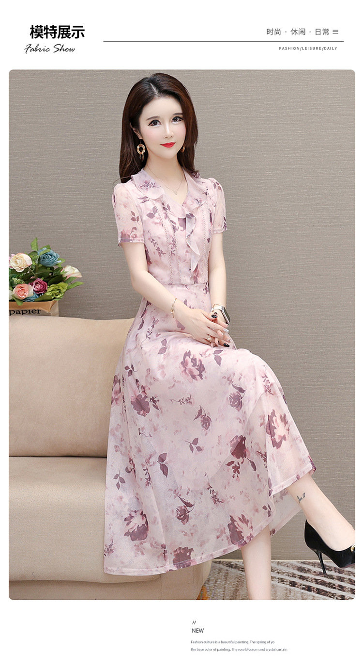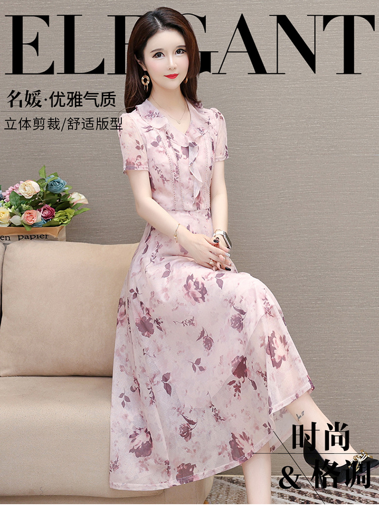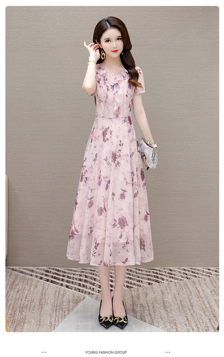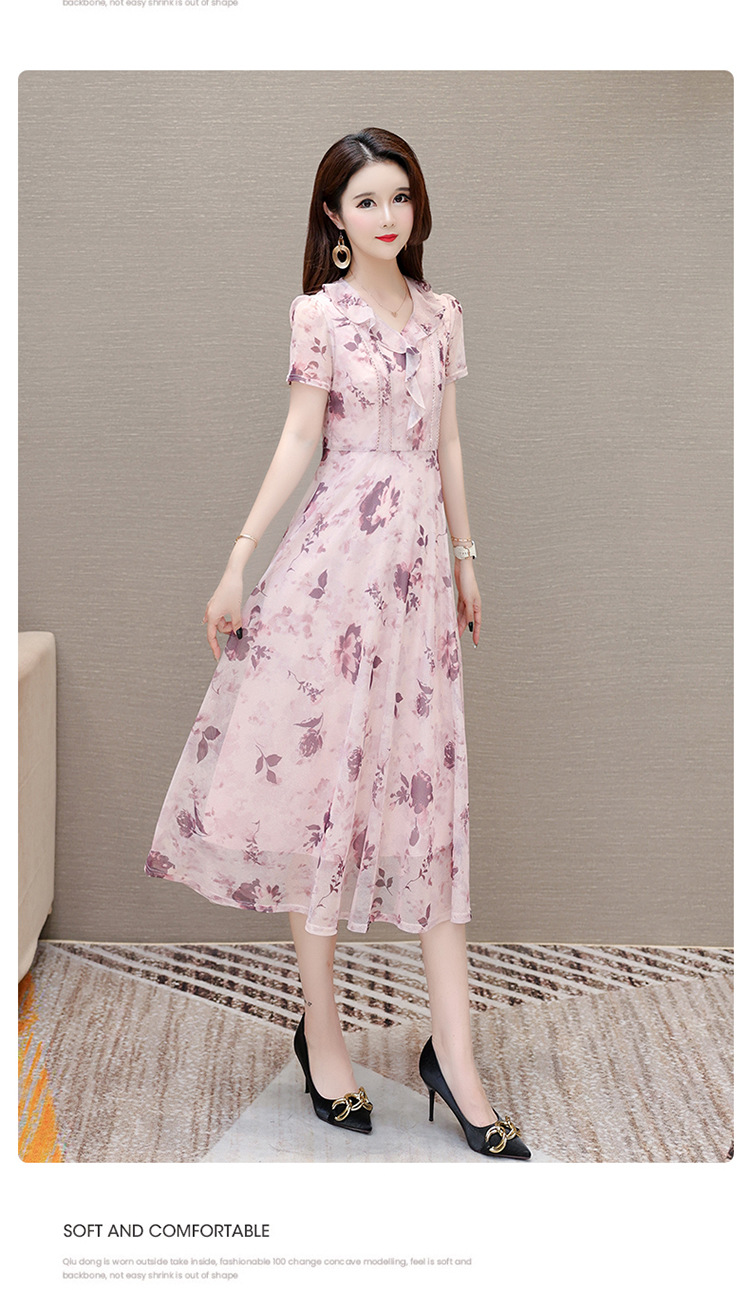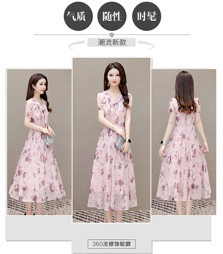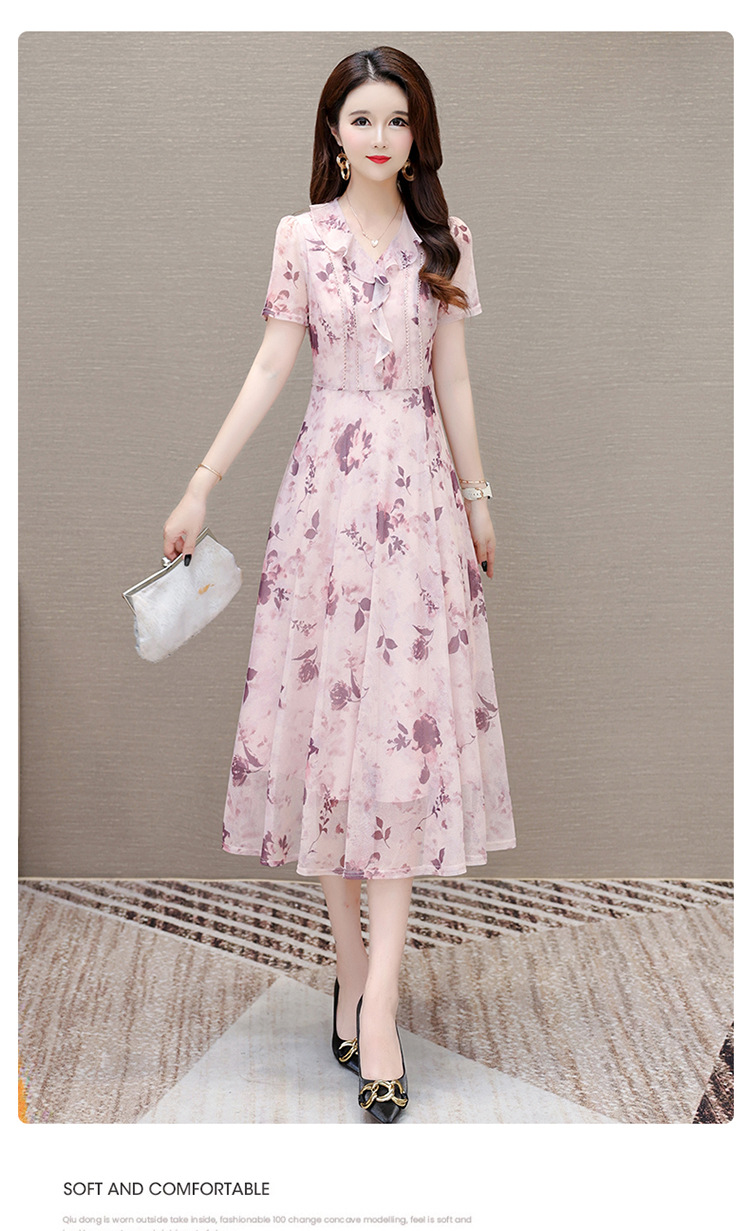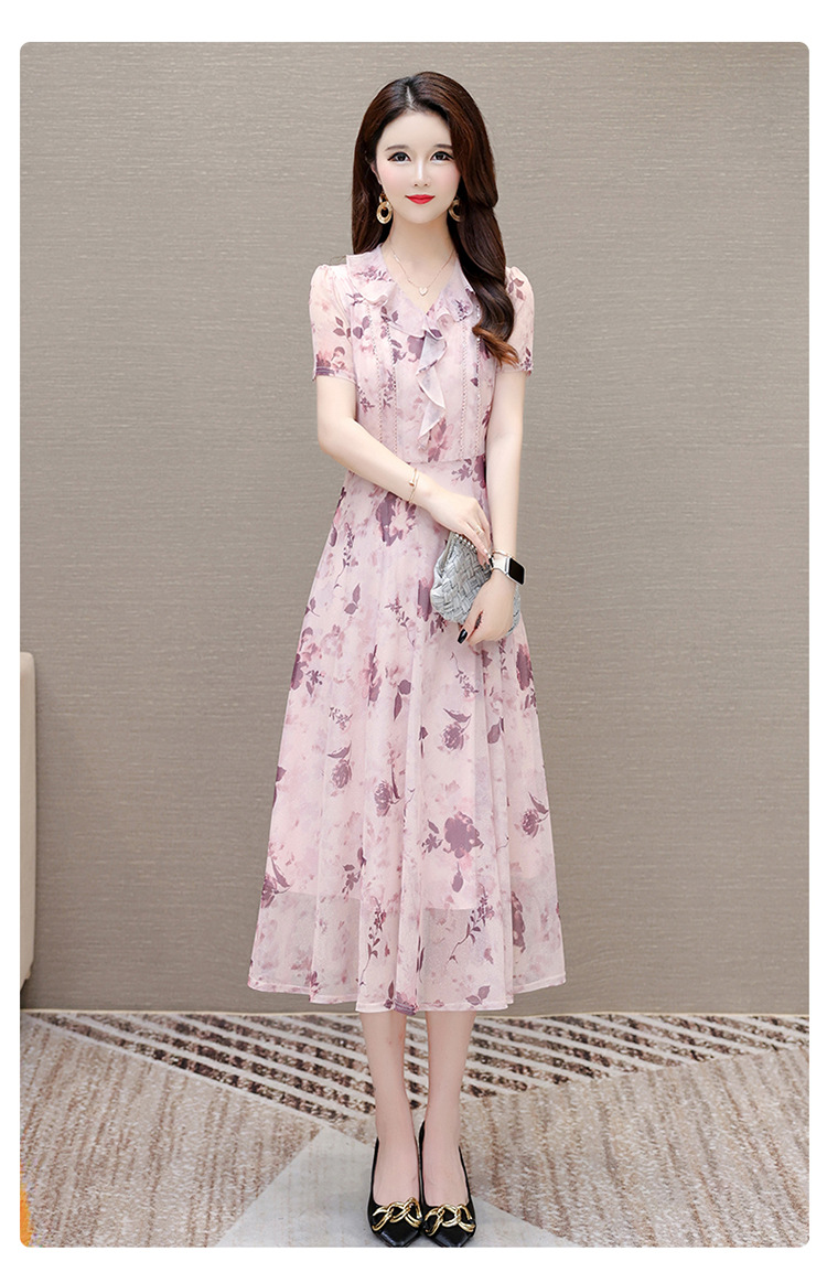 印花雪纺修身时尚连衣裙,荷叶边V领短袖洋气休闲A字裙QYM-XQD-54B2423-L