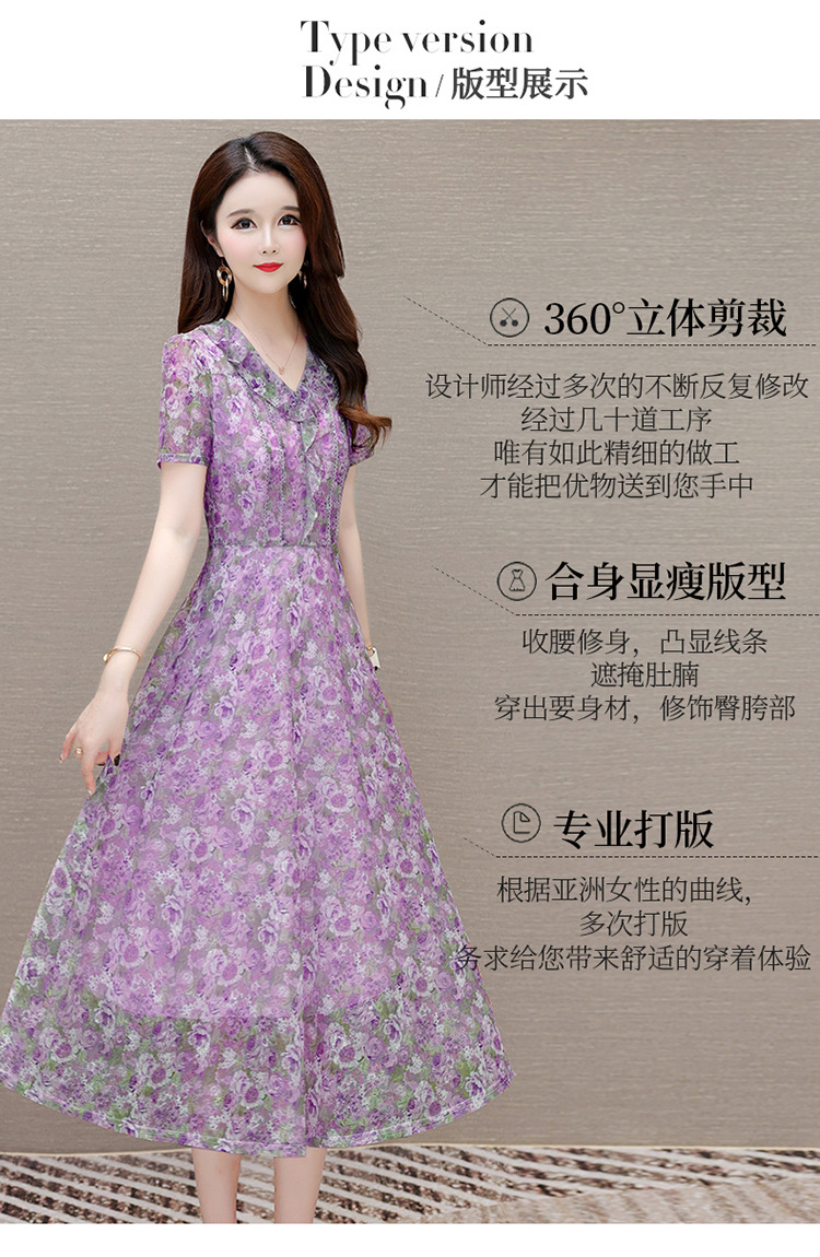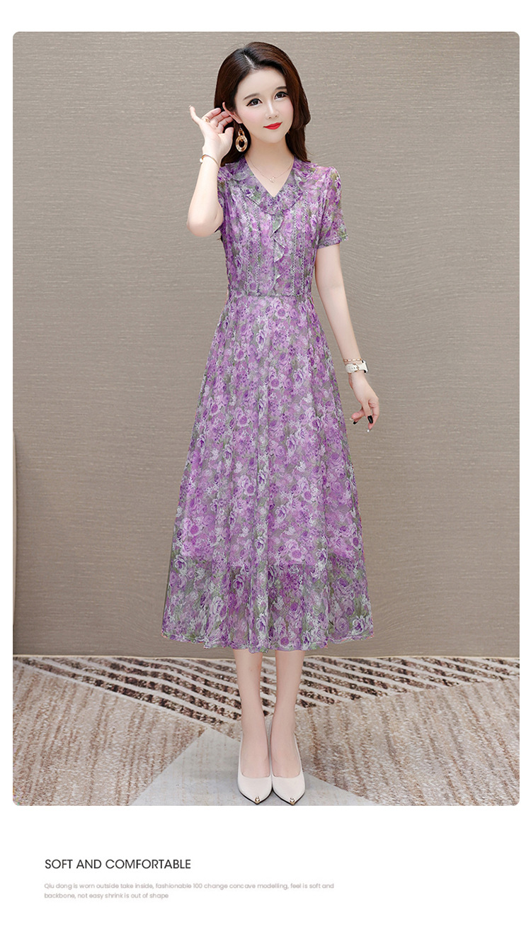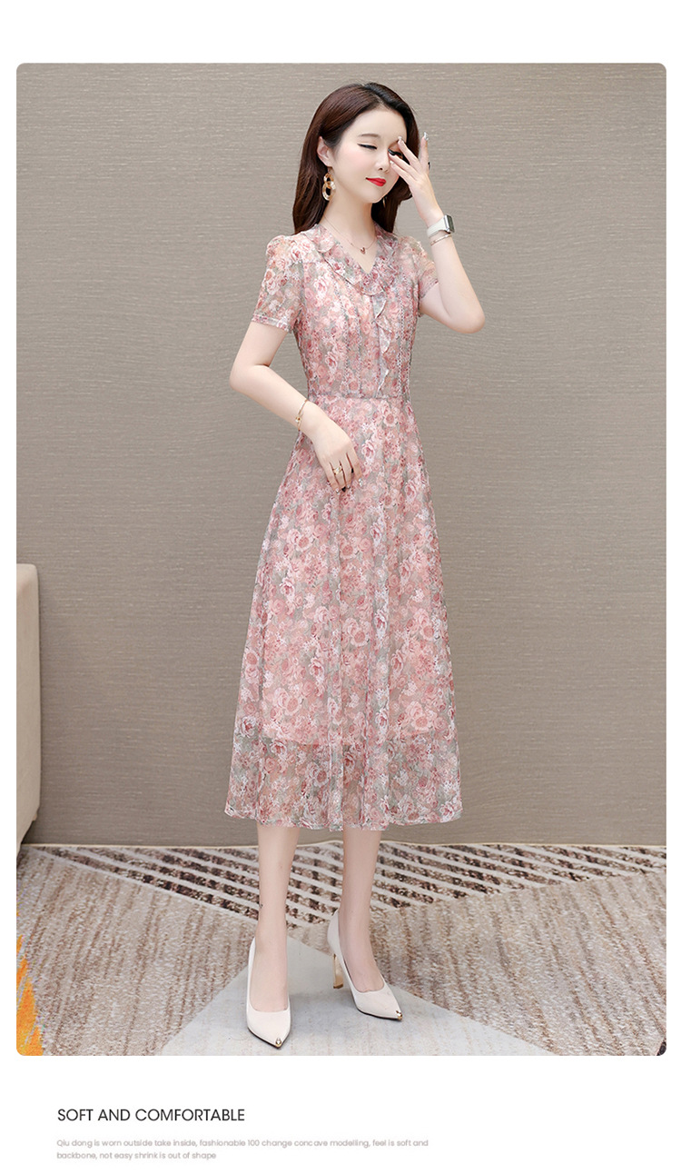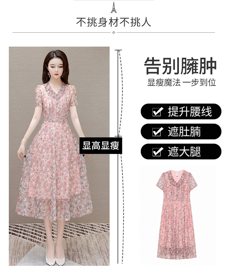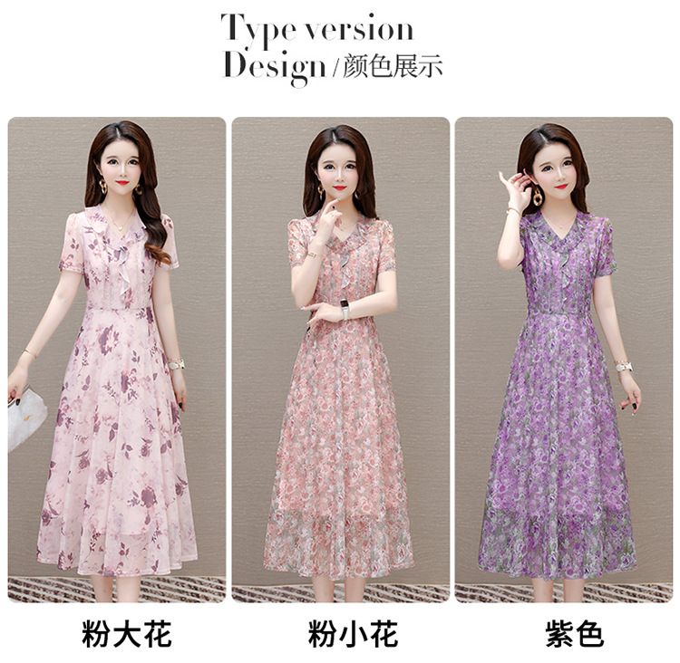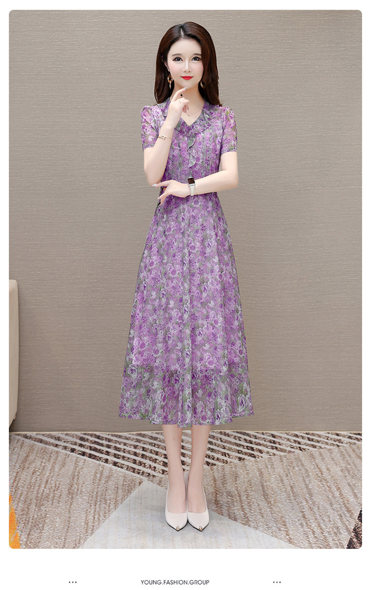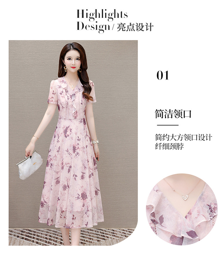 印花雪纺修身时尚连衣裙,荷叶边V领短袖洋气休闲A字裙QYM-XQD-54B2423-L