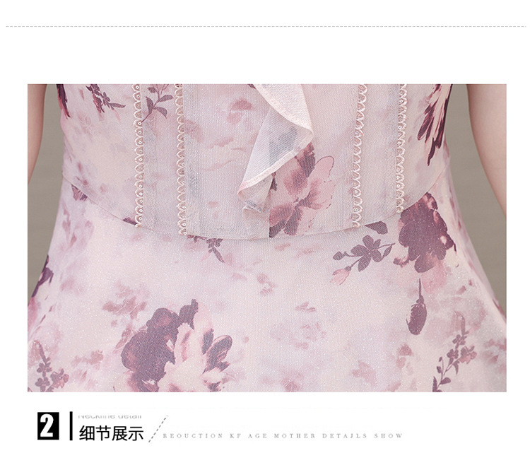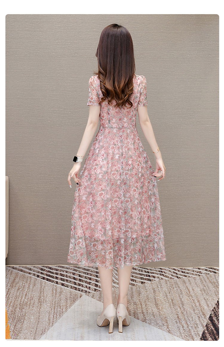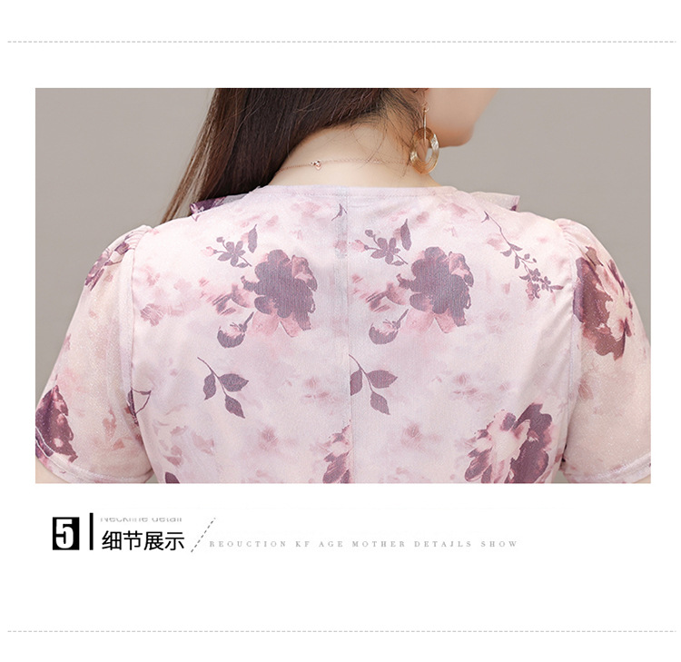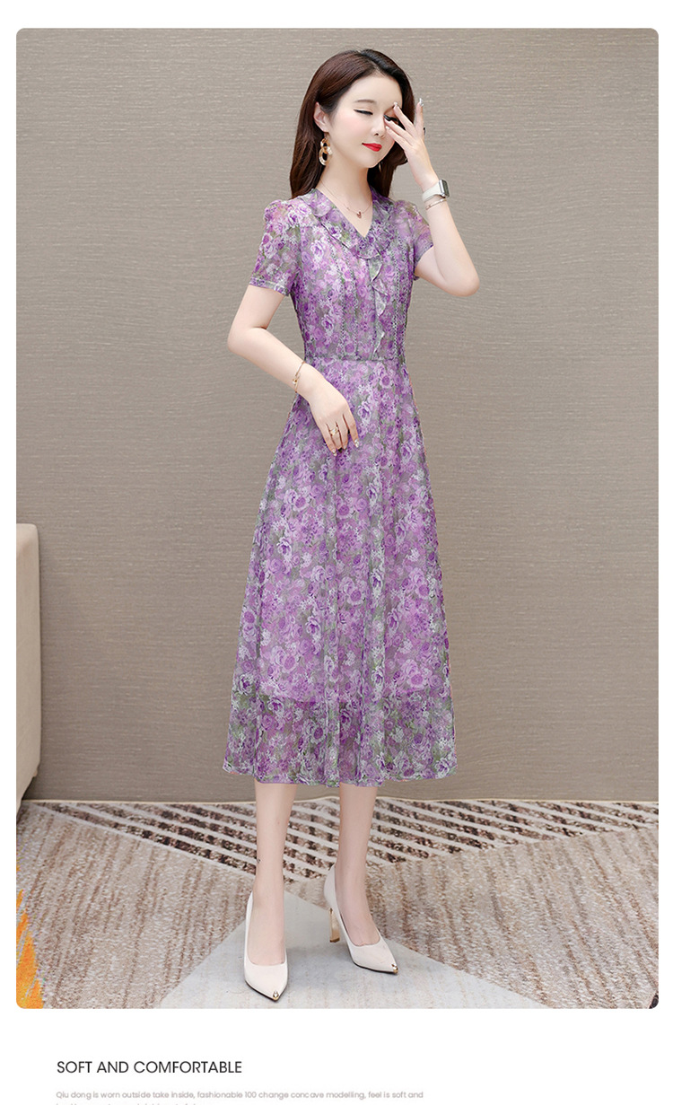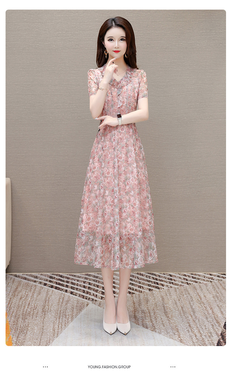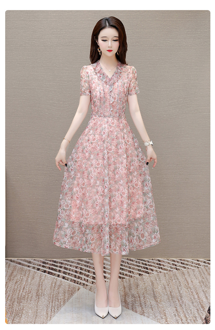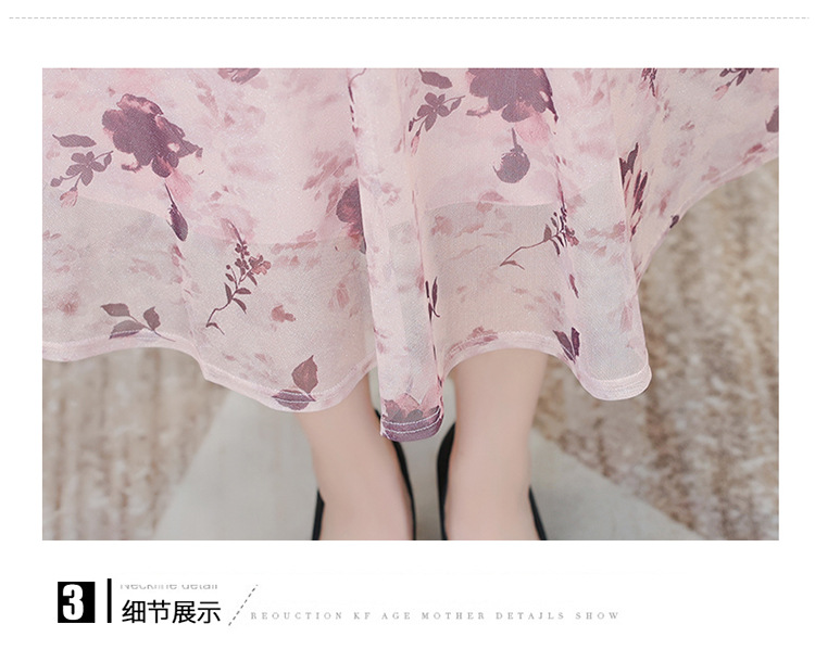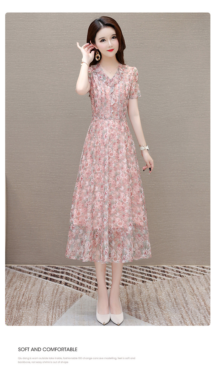 印花雪纺修身时尚连衣裙,荷叶边V领短袖洋气休闲A字裙QYM-XQD-54B2423-L