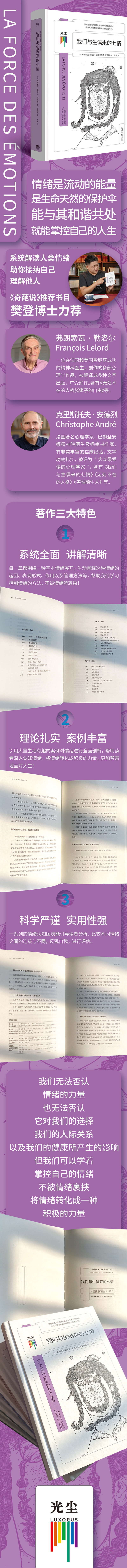 随后,本书的每一章都围绕一种基本情绪展开:愤怒、羡慕、喜悦、悲伤、羞耻、嫉妒、恐惧,还有爱。每章除了对某种基本情绪的剖析以外,还会阐释与此相近或相关的情绪状态, 例如,在“喜悦”部分,书中将谈到快乐、满足以及幸福。