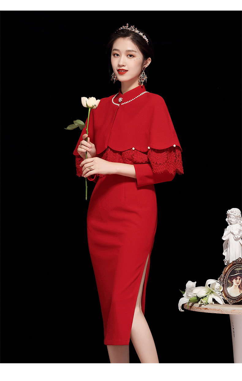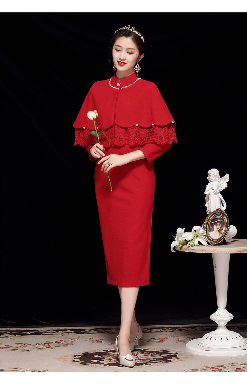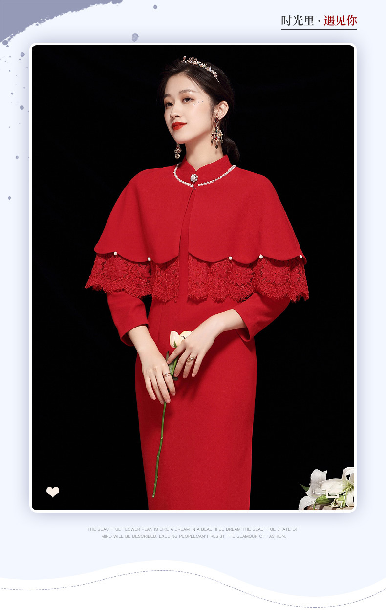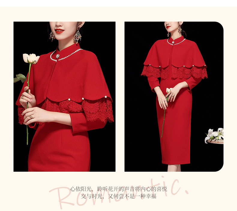 宴会旗袍,钉珠荷叶边流苏斗篷连衣裙两件套 OY-21176