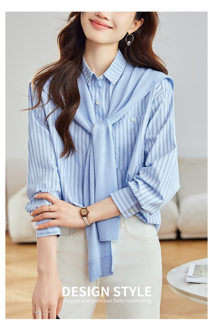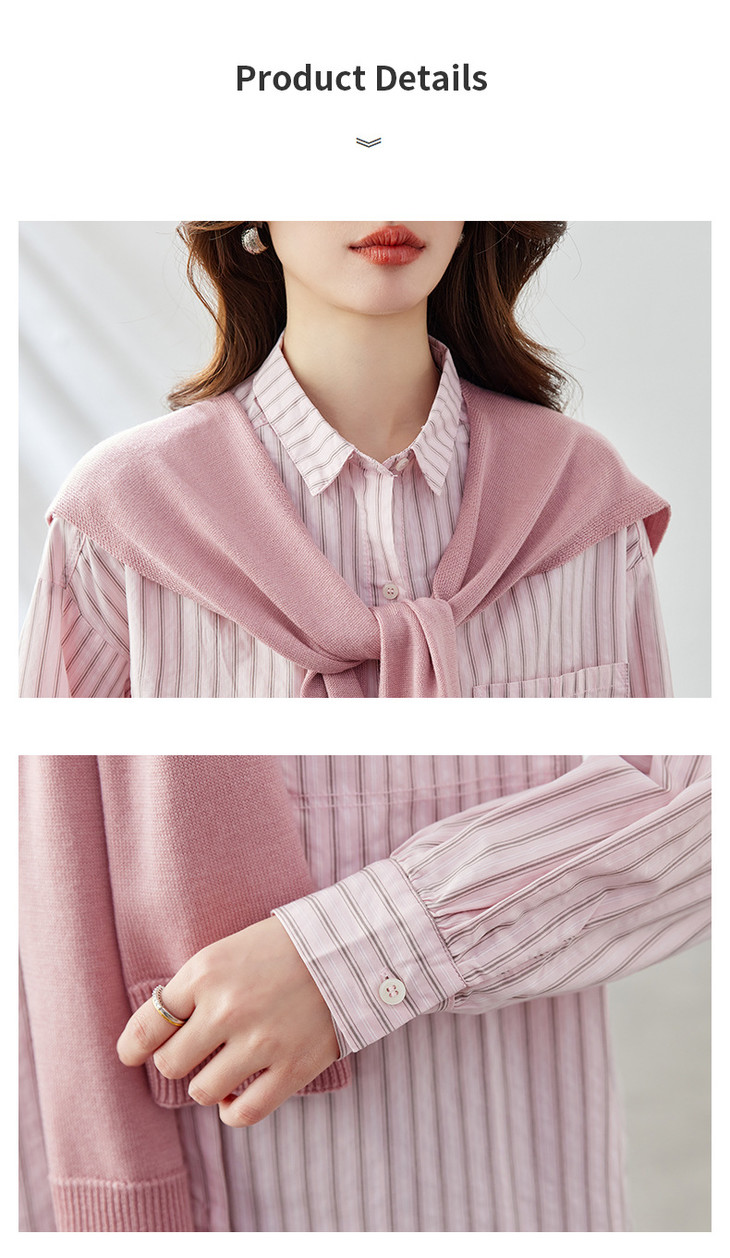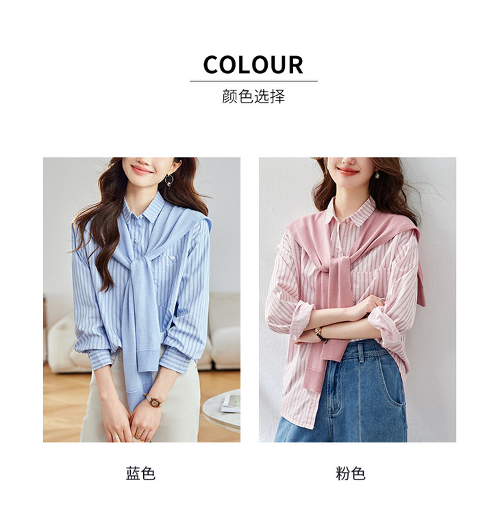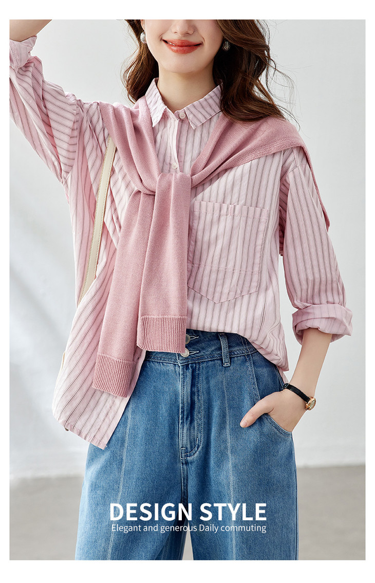 针织披肩条纹衬衫,长袖洋气上衣粉色翻领衬衣MJ-51076