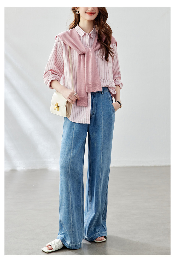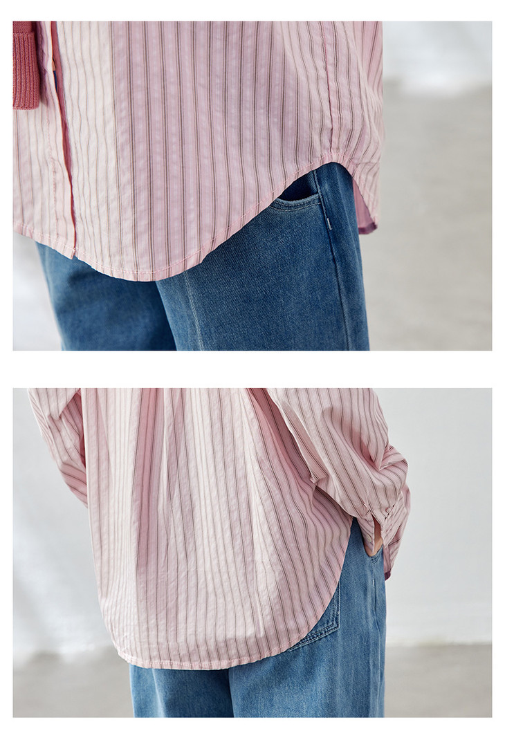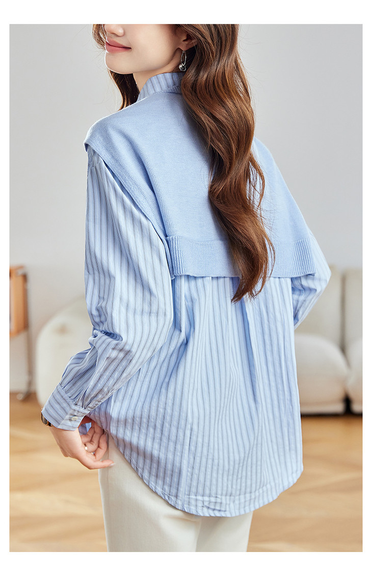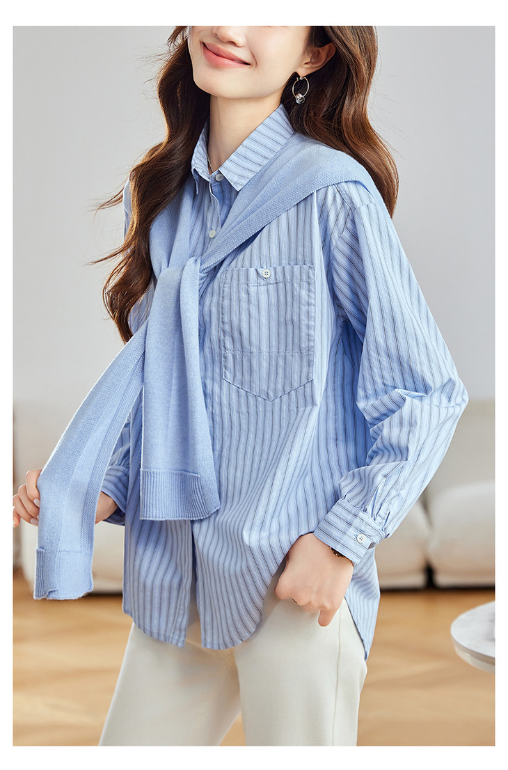针织披肩条纹衬衫,长袖洋气上衣粉色翻领衬衣MJ-51076