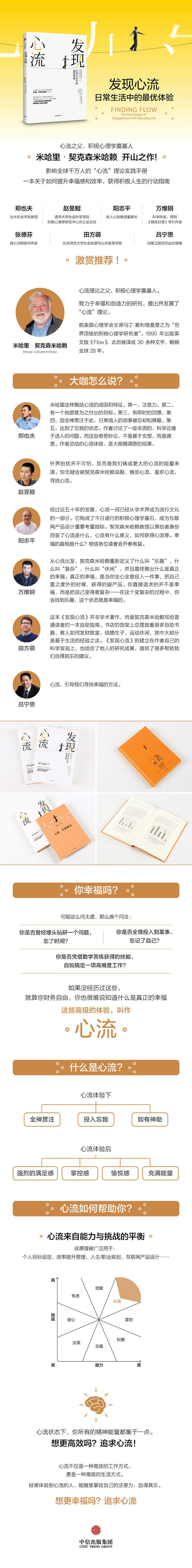 经过近五十年的发展,心流一词已经从学术界成为流行文化的一部分。它构成了今日盛行的积极心理学基石,成为互联网产品设计重要考量指标。契克森米哈赖教授以原创者身份回答了心流是什么,心流有什么意义,如何获得心流等。幸福的真相是什么?相信各位读者会开卷有益。