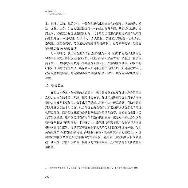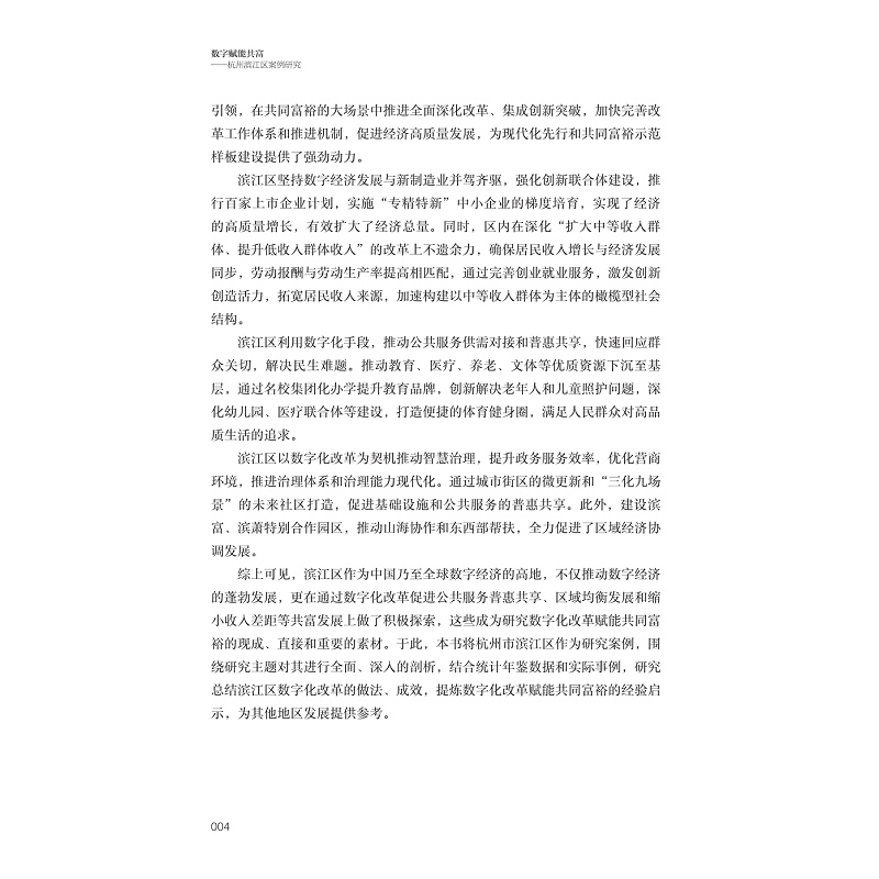 “共同富裕的探索与实践——浙江案例研究”丛书之一。 该书基于数字化改革推进共同富裕的理论基础,以杭州市滨江区为例,通过数字化在产业发展、公共服务、政府治理、未来社区建设、区域协调发展等领域的生动改革和应用场景,剖析数字化改革对共同富裕产生的积极影响,集中展示数字化改革赋能浙江经济高质量发展、生活富裕富足、环境宜居宜业、社会和谐和睦、公共服务普及普惠的共富新实践和新成就,从而系统总结浙江以数字化改革促进共同富裕示范区建设的创新经验。