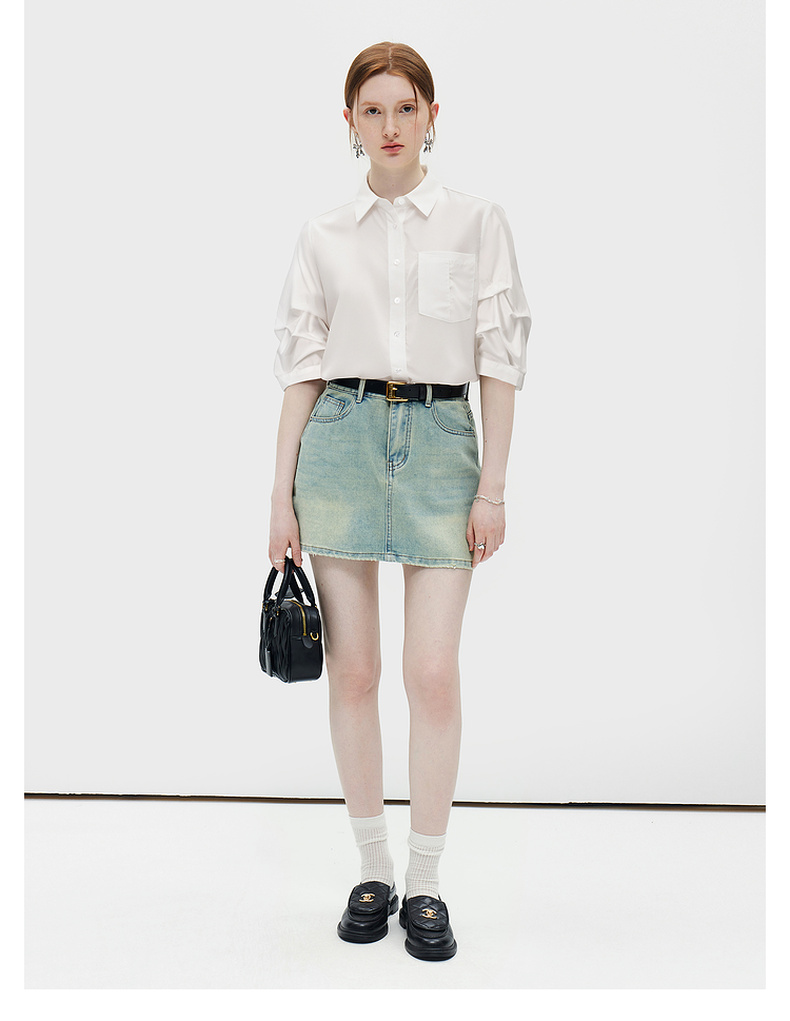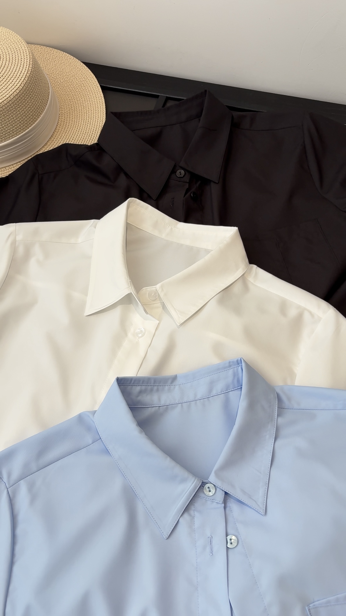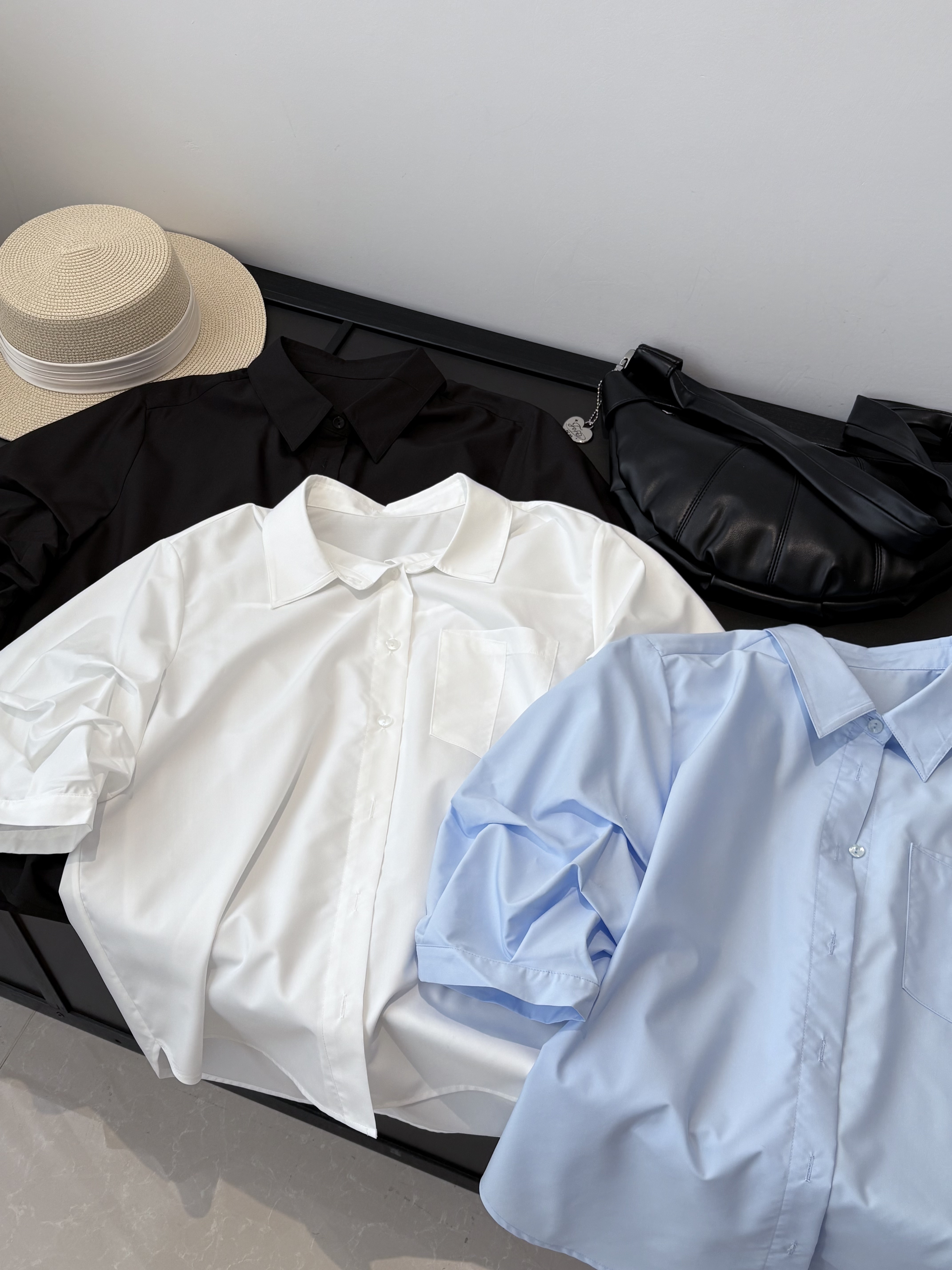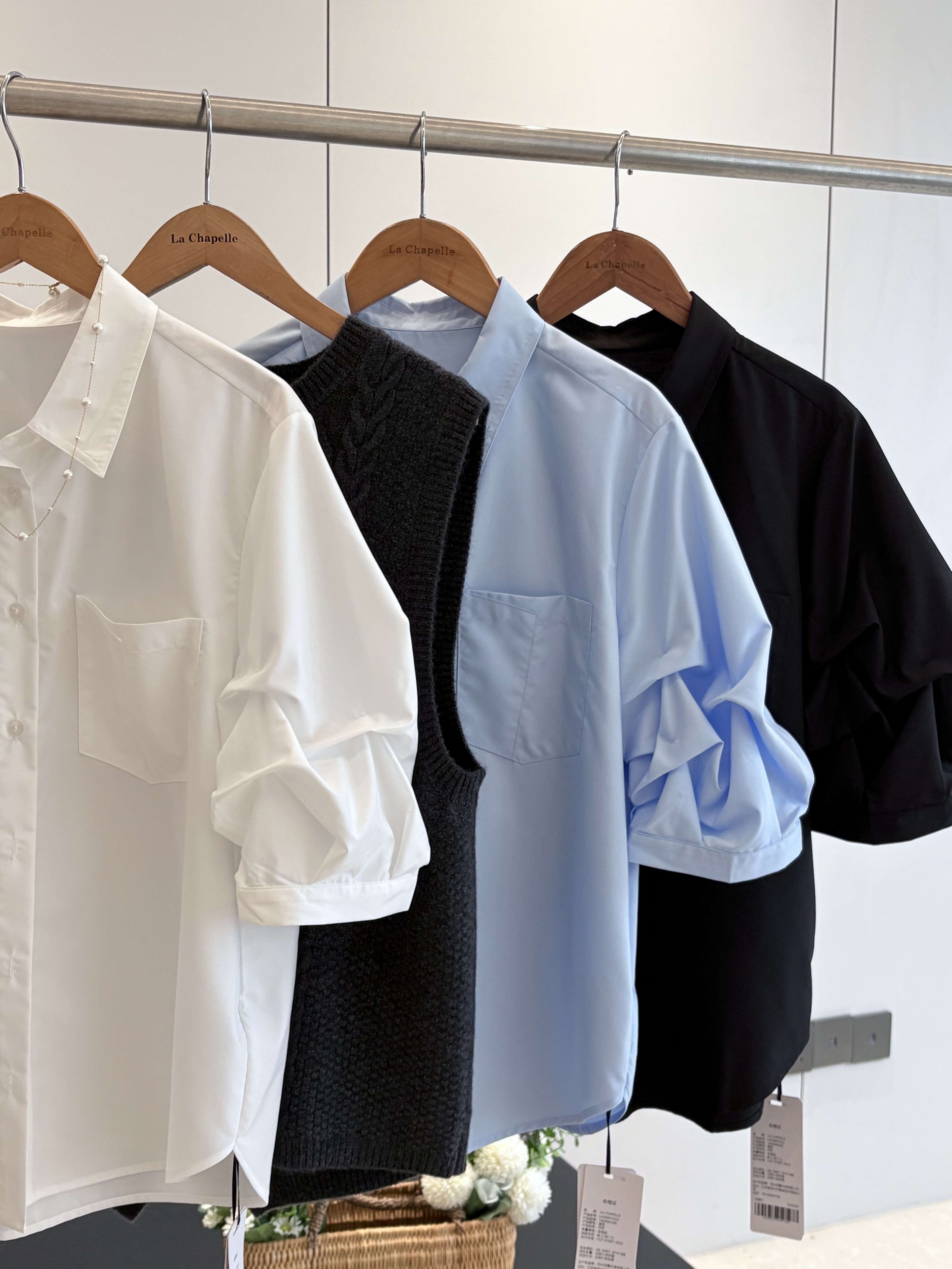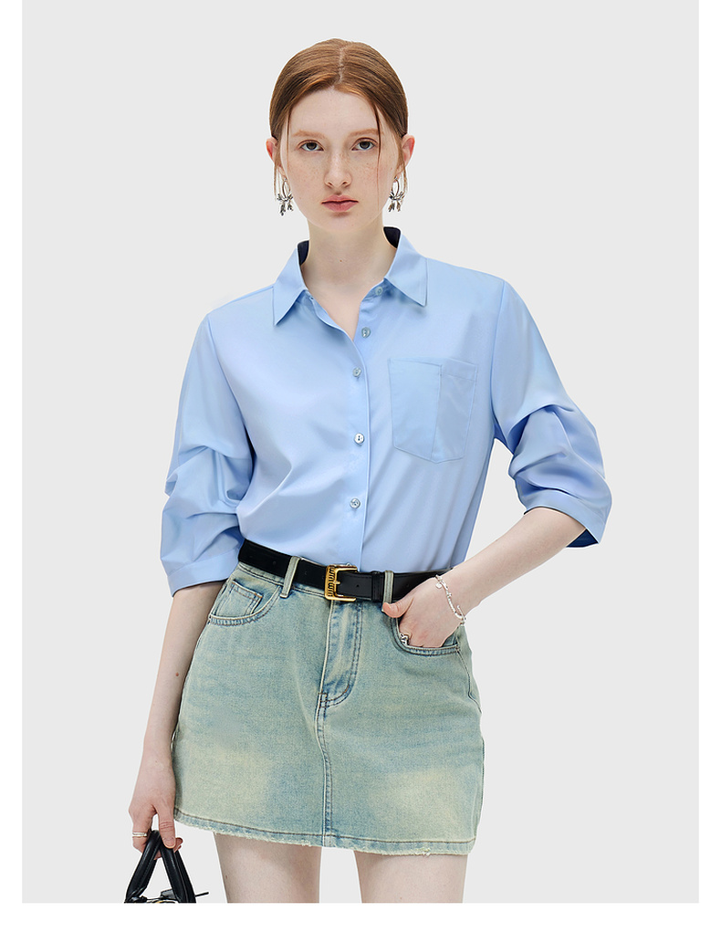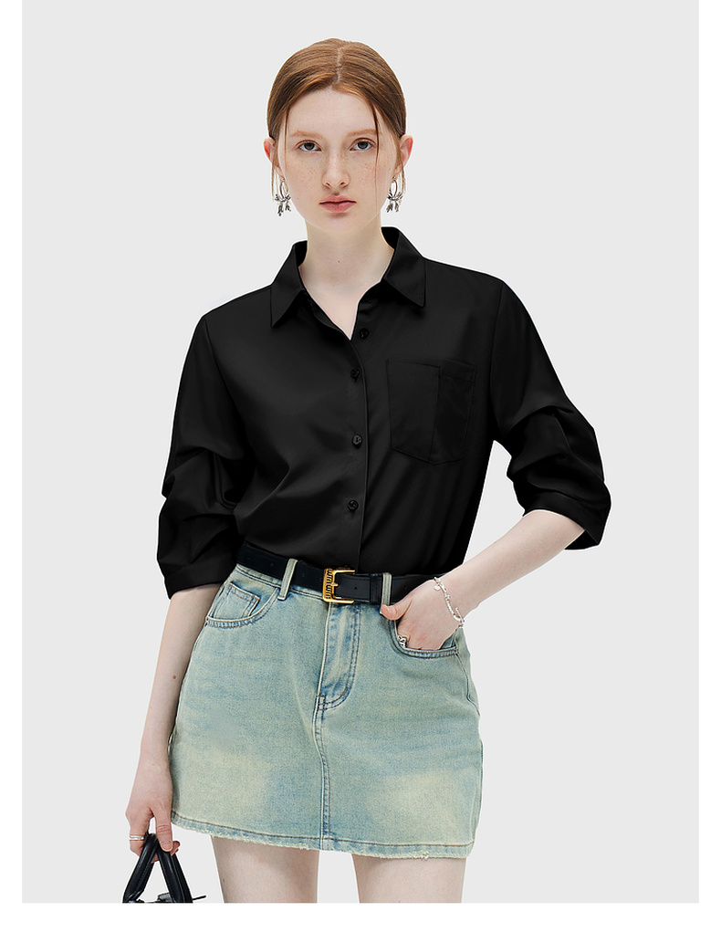 会员福利【丝滑、抗皱+垂坠】拉夏贝尔/La Chapelle翻领单口袋褶皱衬衫女纯色简约高级感休闲宽松通勤衬衣秋
