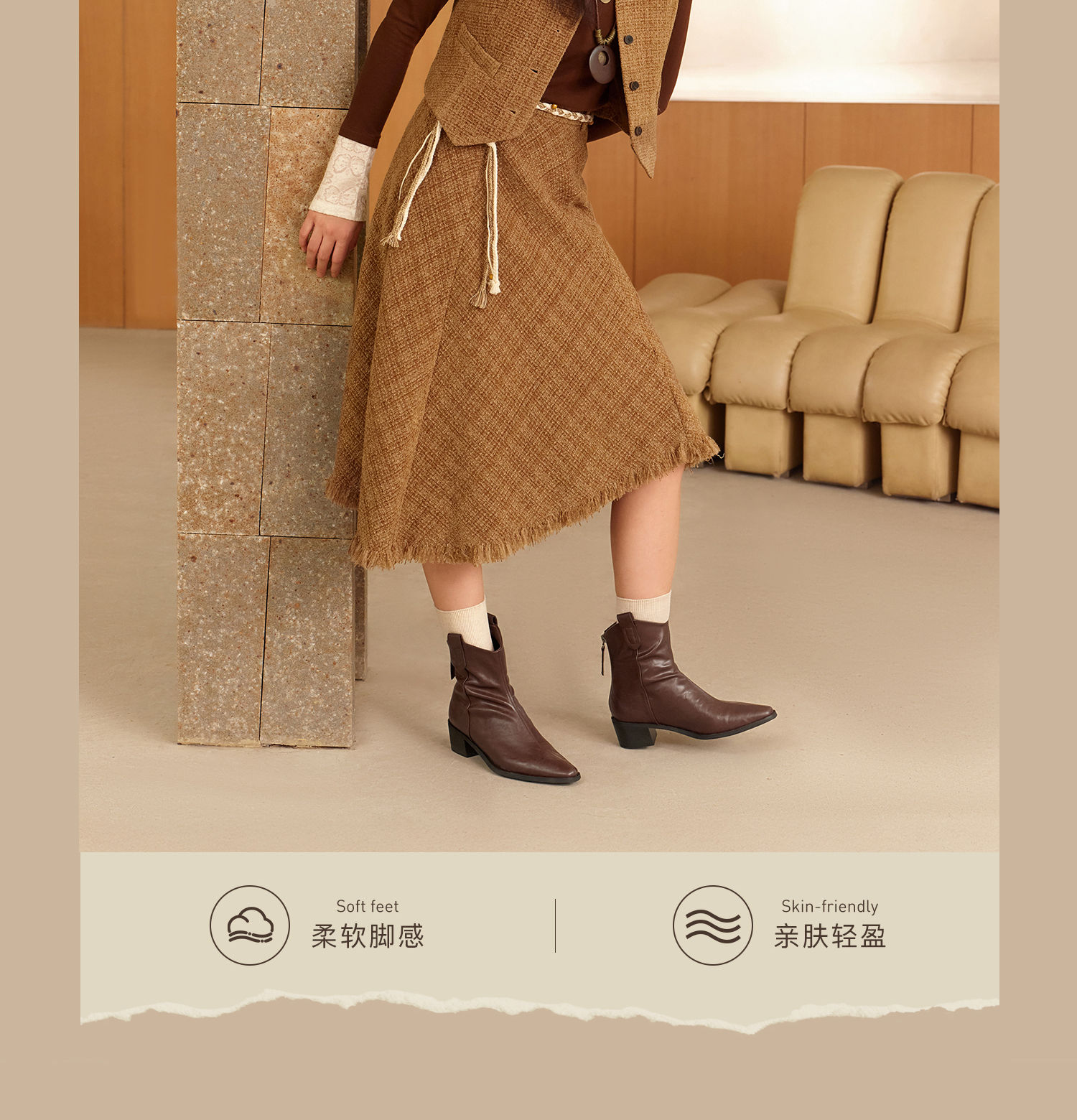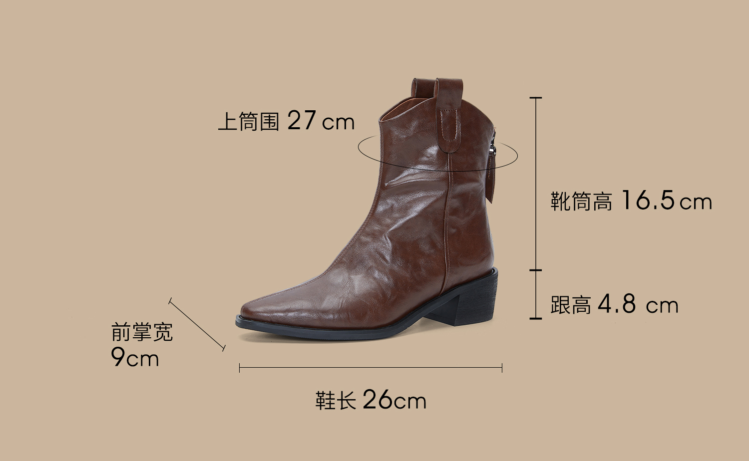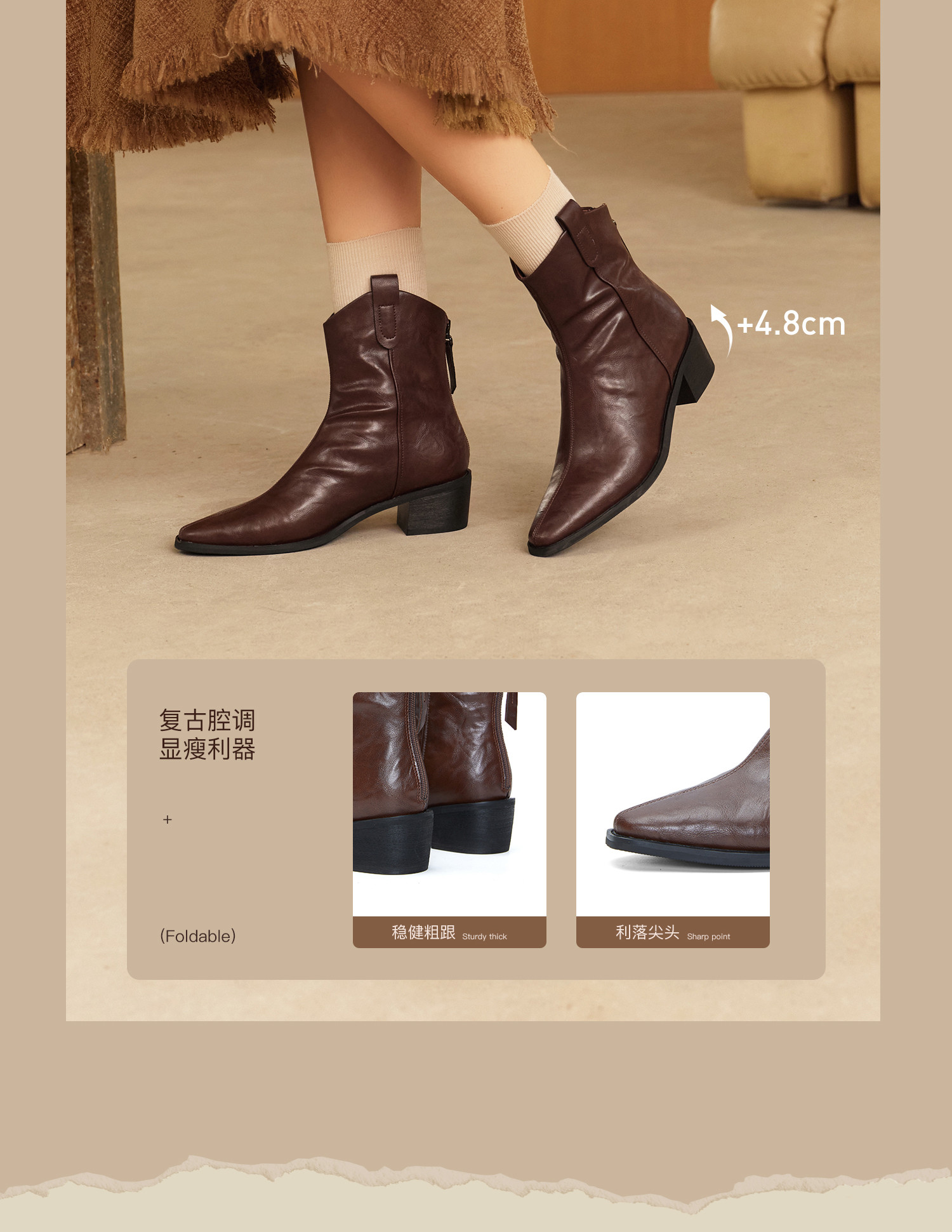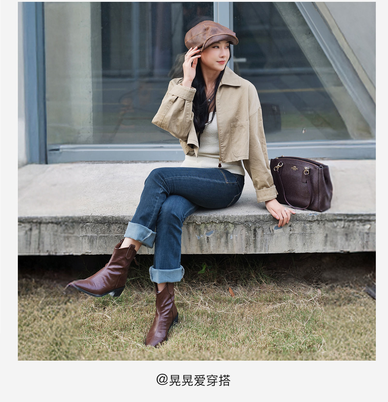 【土豆妈同款】百田森PYQ2C936西部牛仔靴女小短靴真皮尖头靴子美拉德