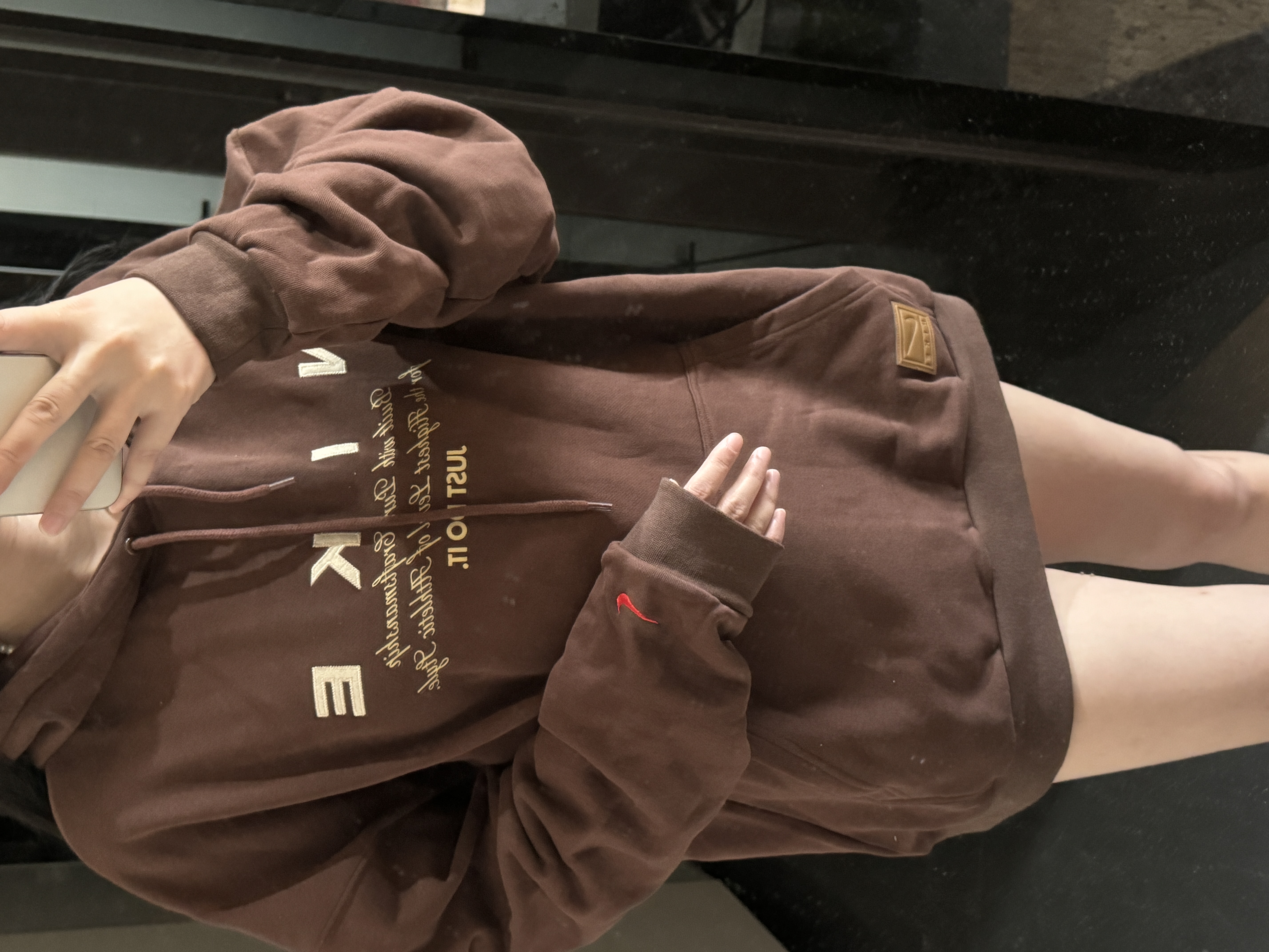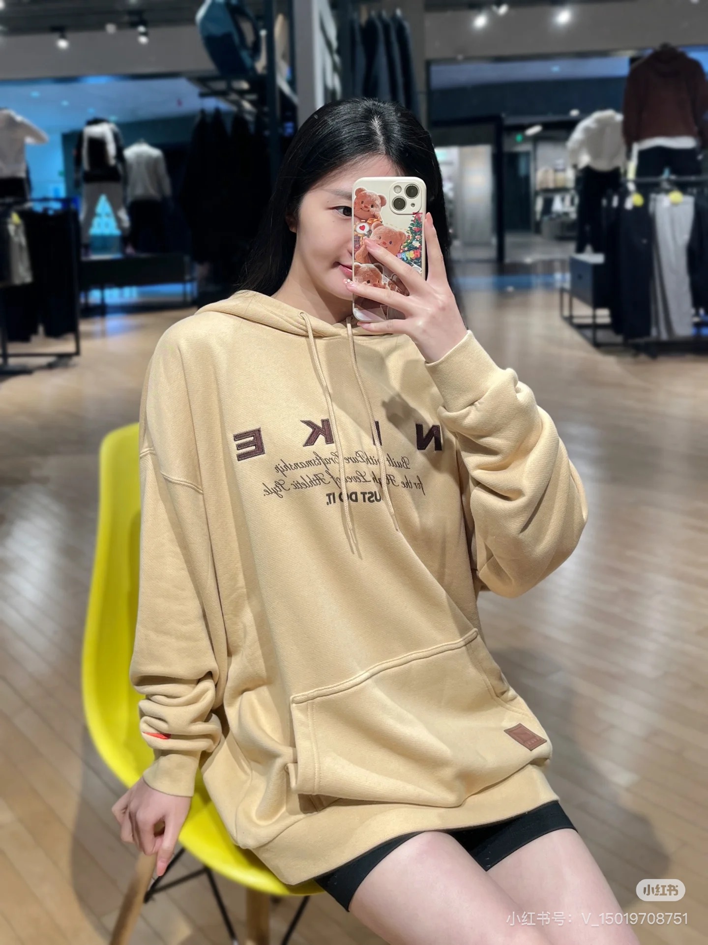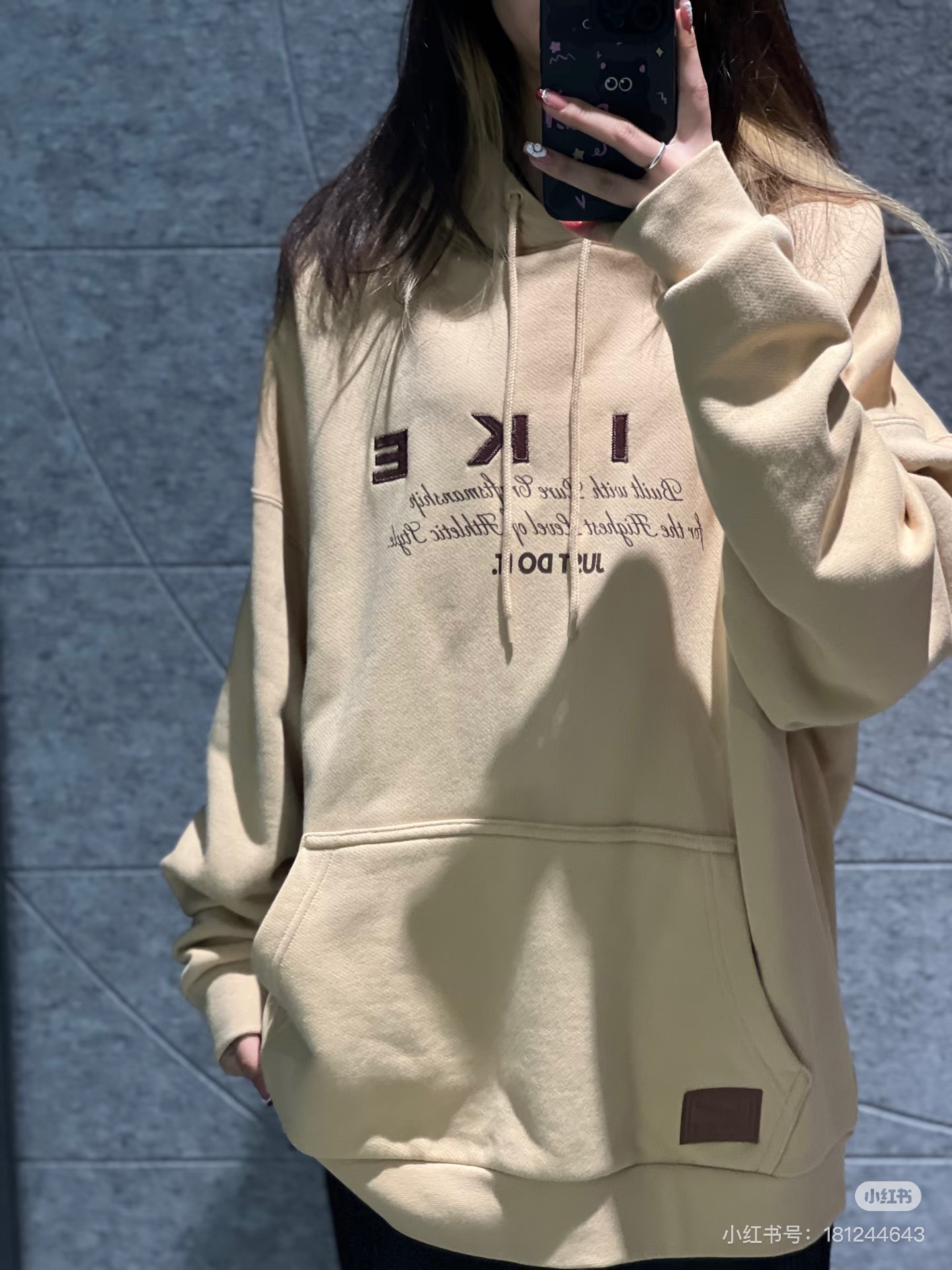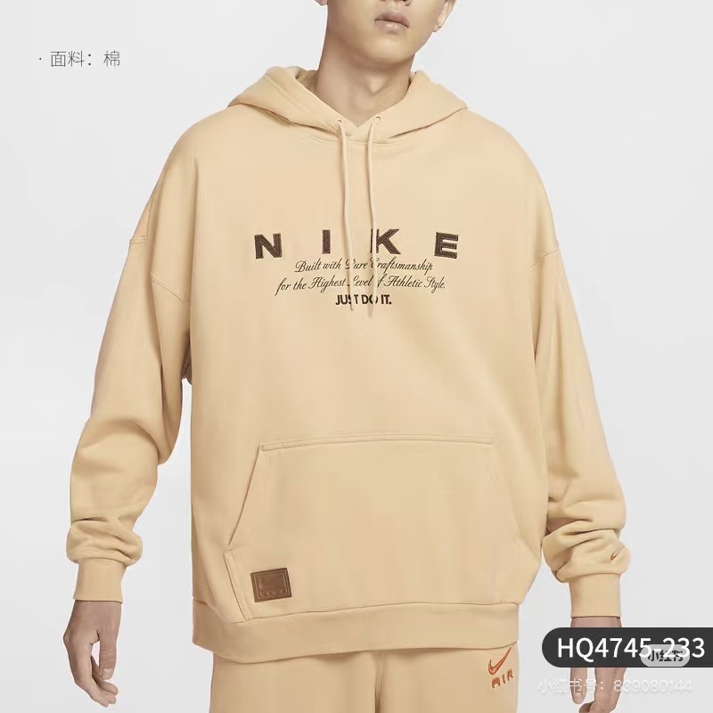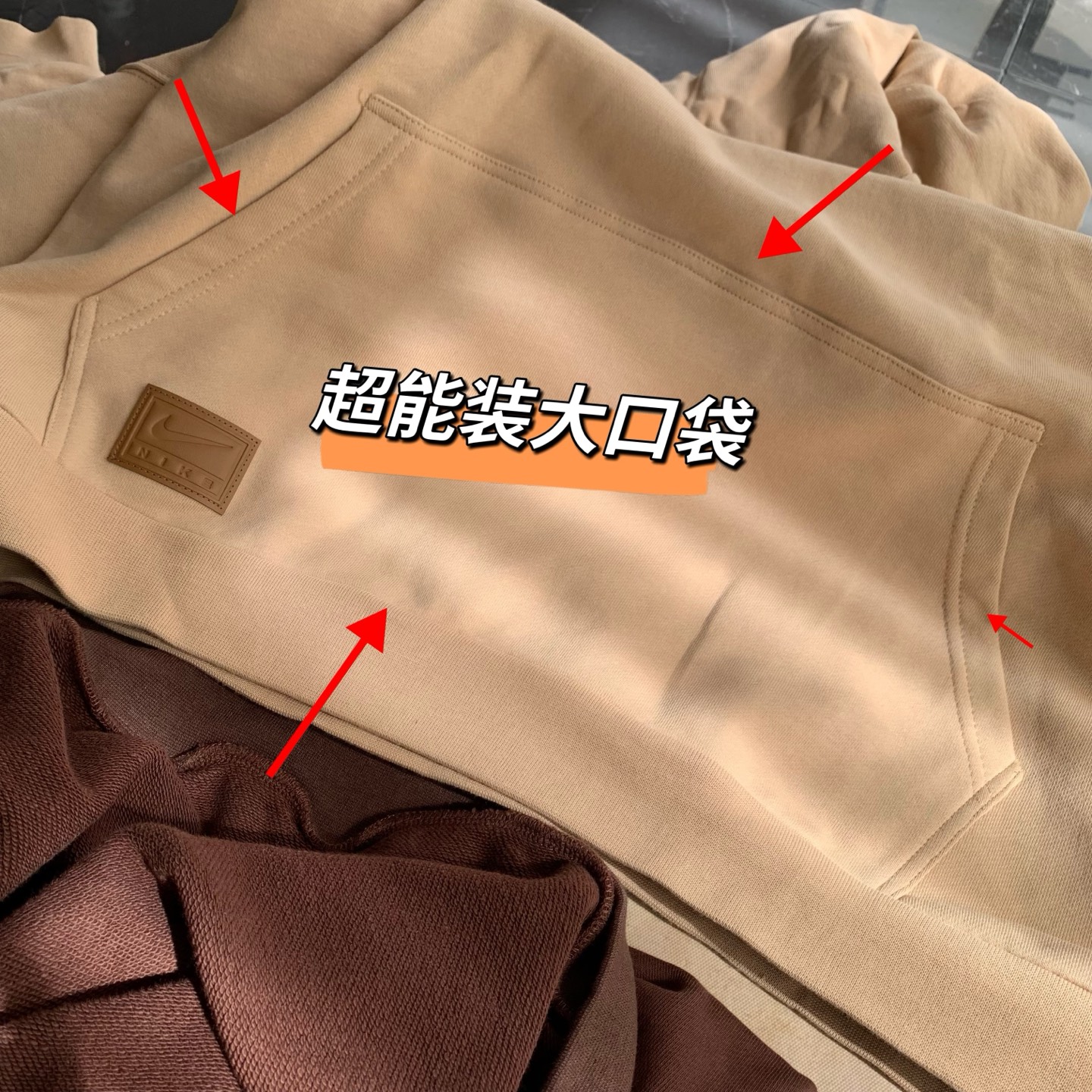 前侧袋鼠口袋边缘带有棕色皮革质感的Ni*ke标签 这款卫衣在官网马上断货了。如果你也喜欢这种"高级慵懒感",想要一件既有设计感又舒适百搭的卫衣,那这件Ni*ke米色复古连帽卫衣绝对是你的不二之选!