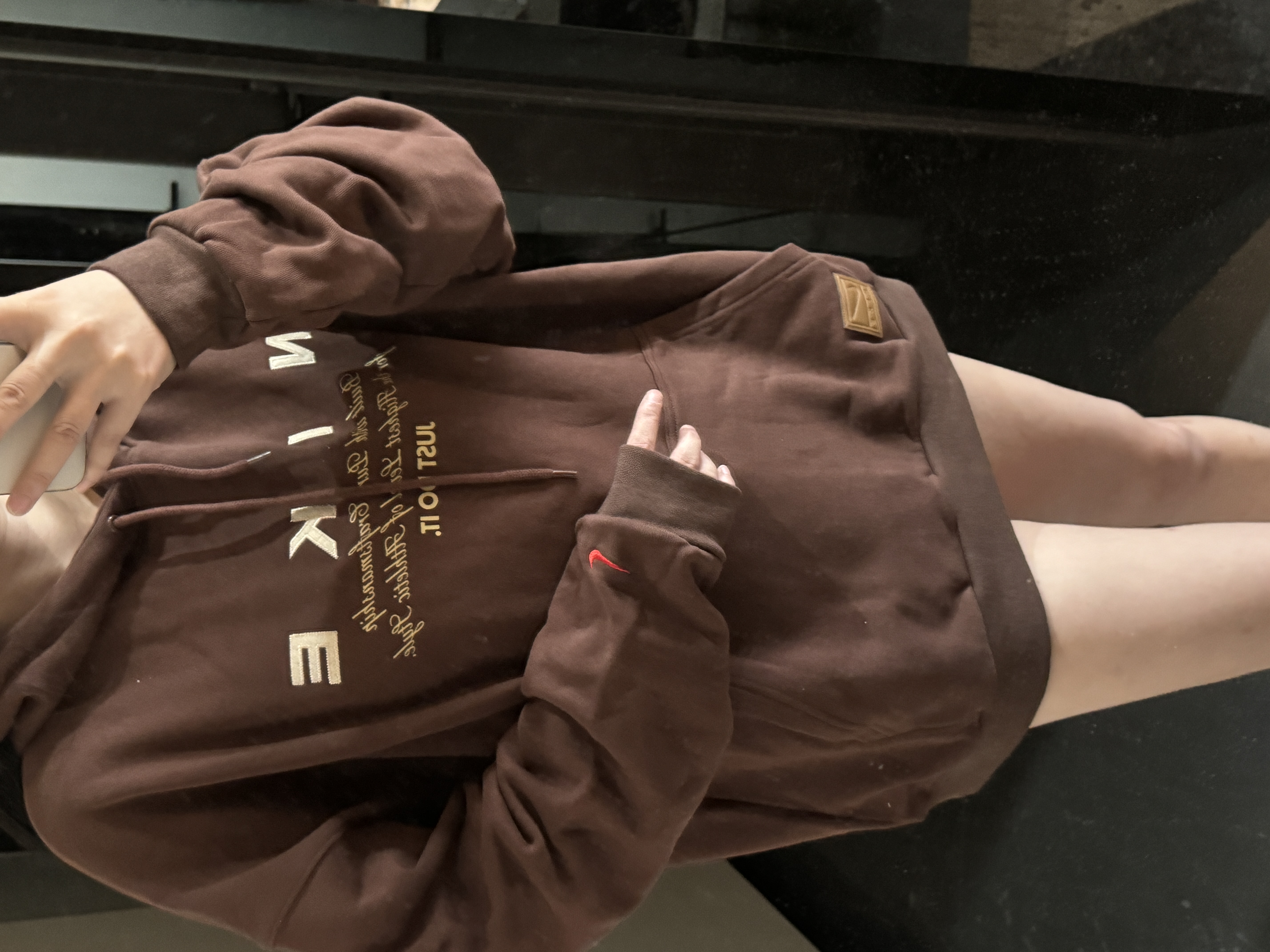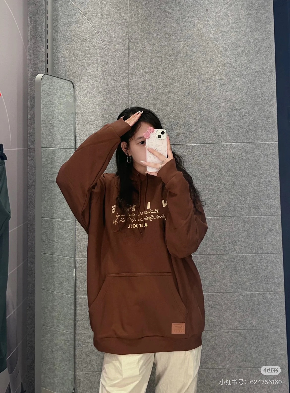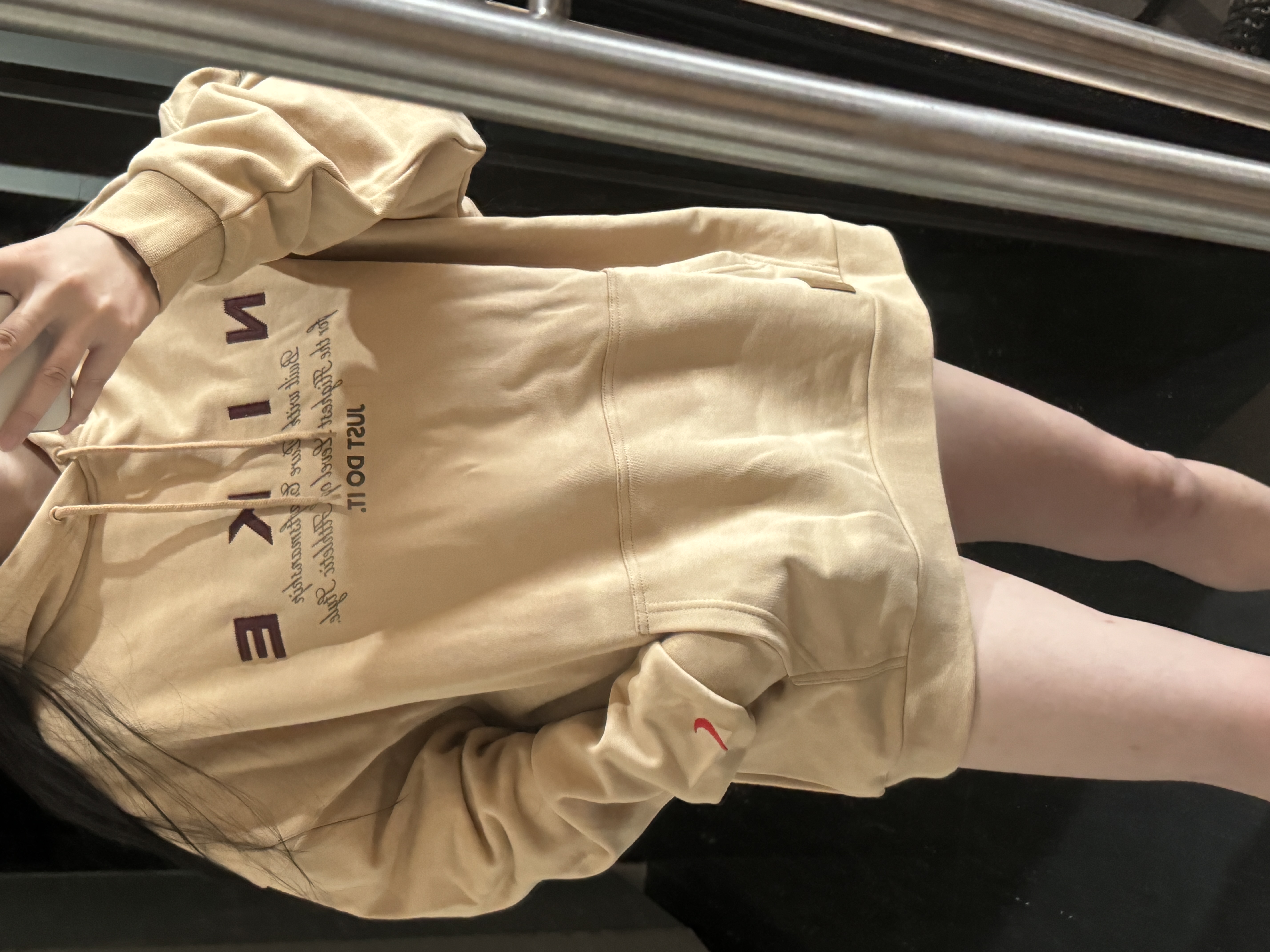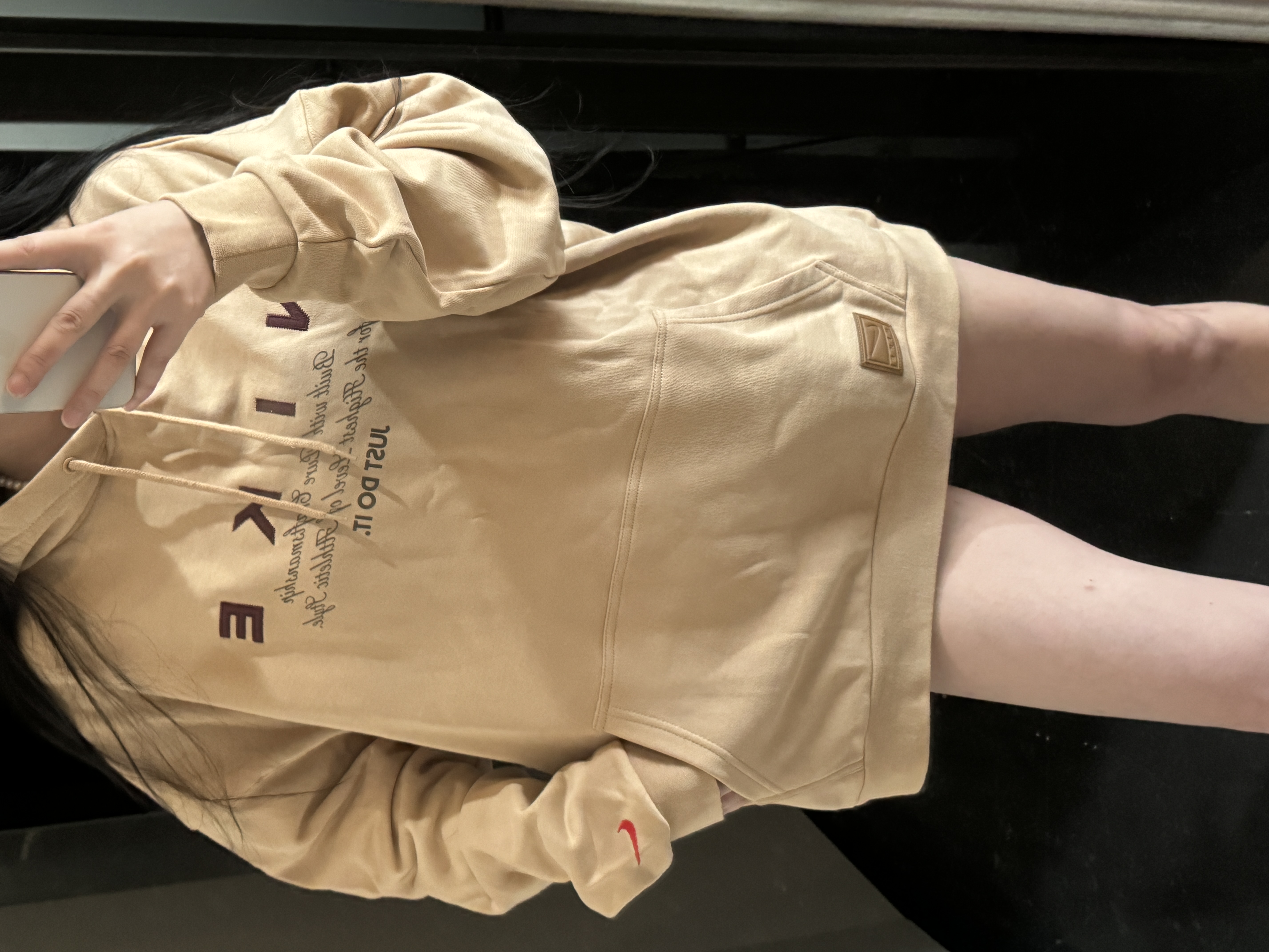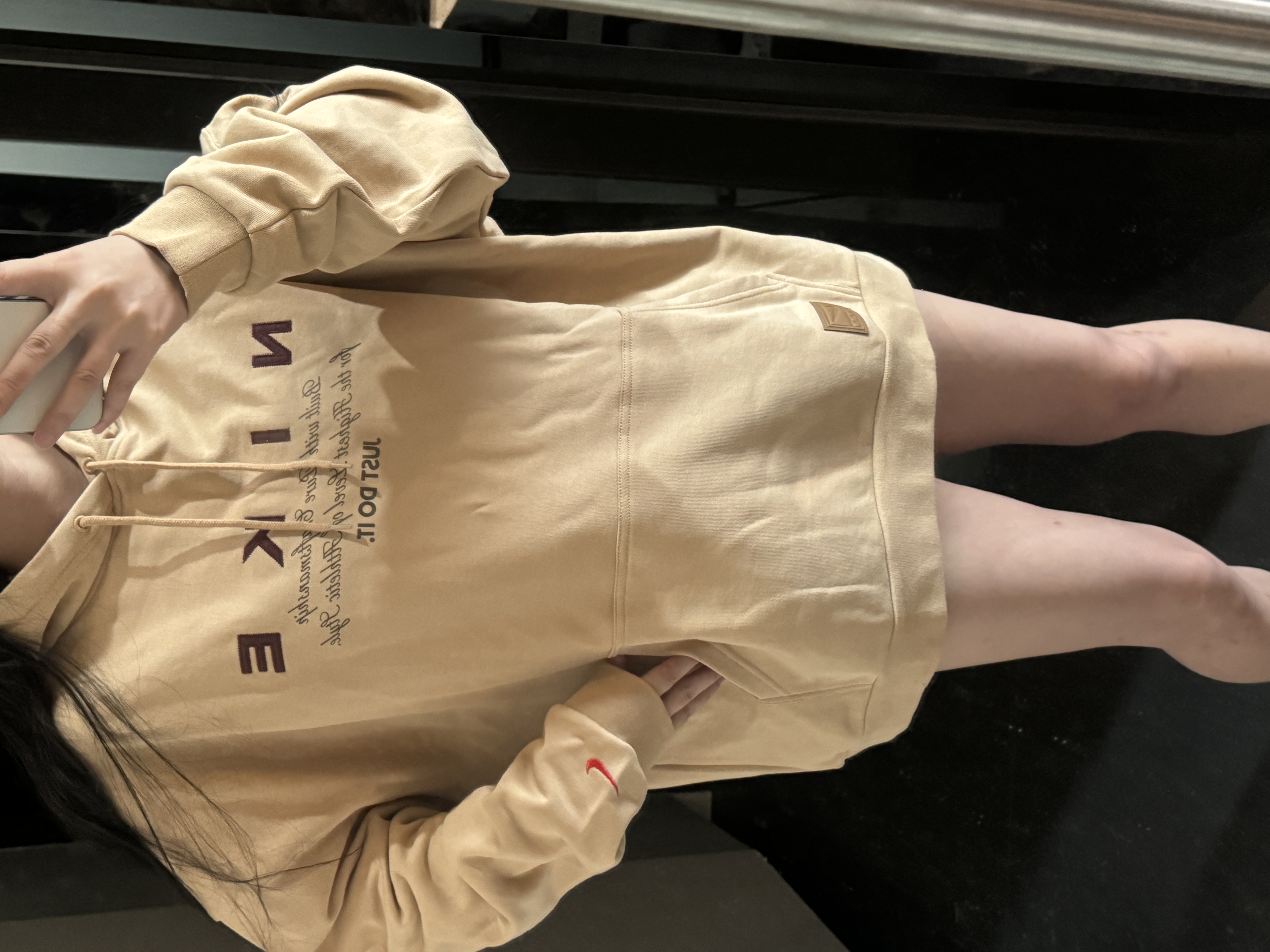 前侧袋鼠口袋边缘带有棕色皮革质感的Ni*ke标签 这款卫衣在官网马上断货了。如果你也喜欢这种"高级慵懒感",想要一件既有设计感又舒适百搭的卫衣,那这件Ni*ke米色复古连帽卫衣绝对是你的不二之选!