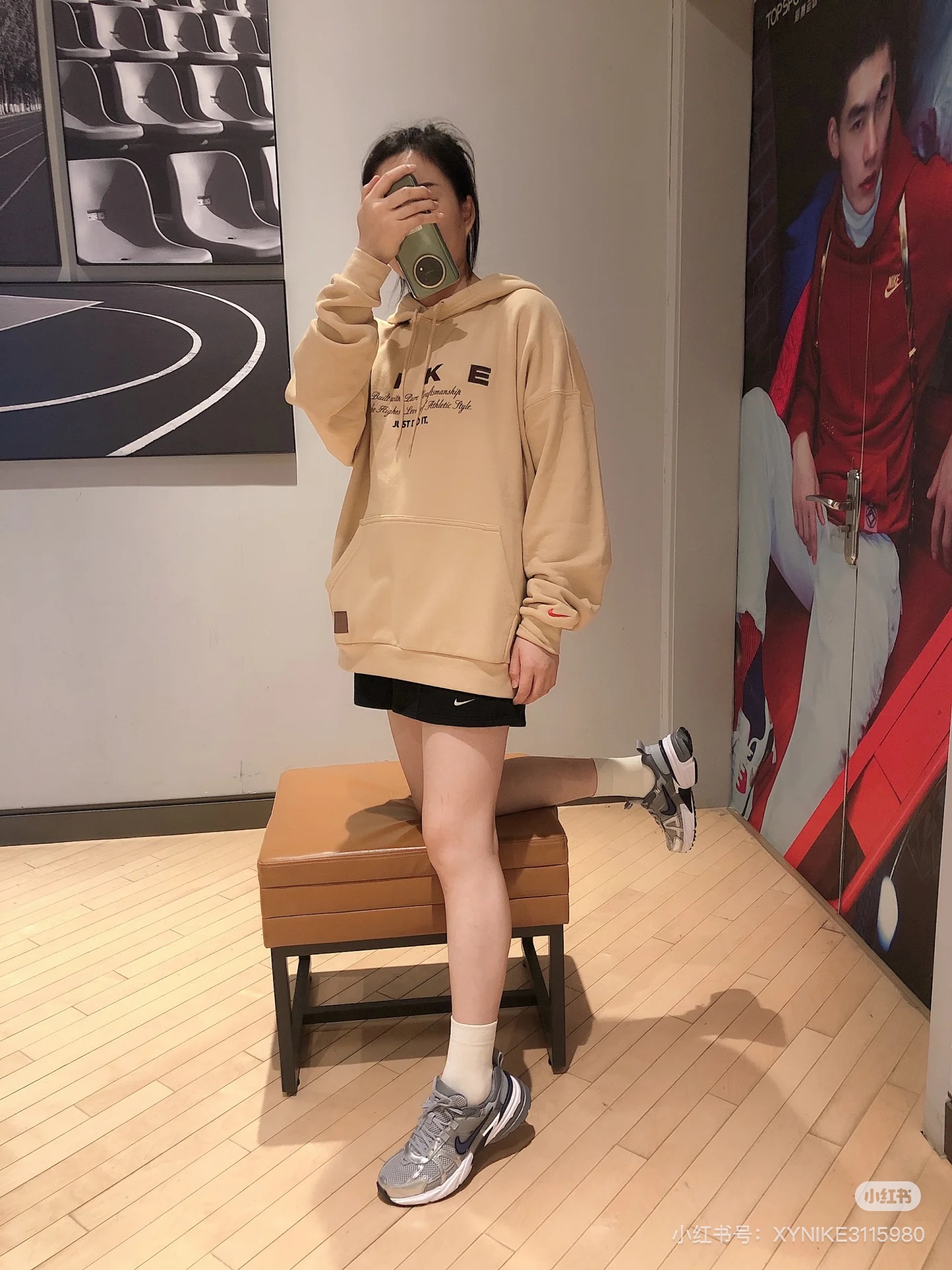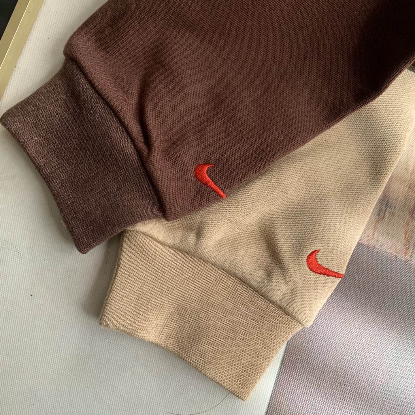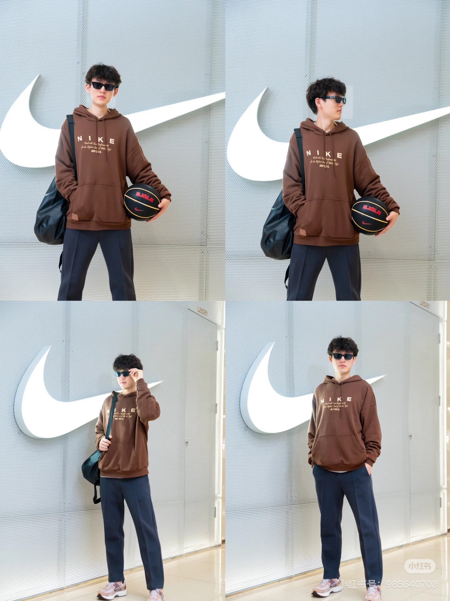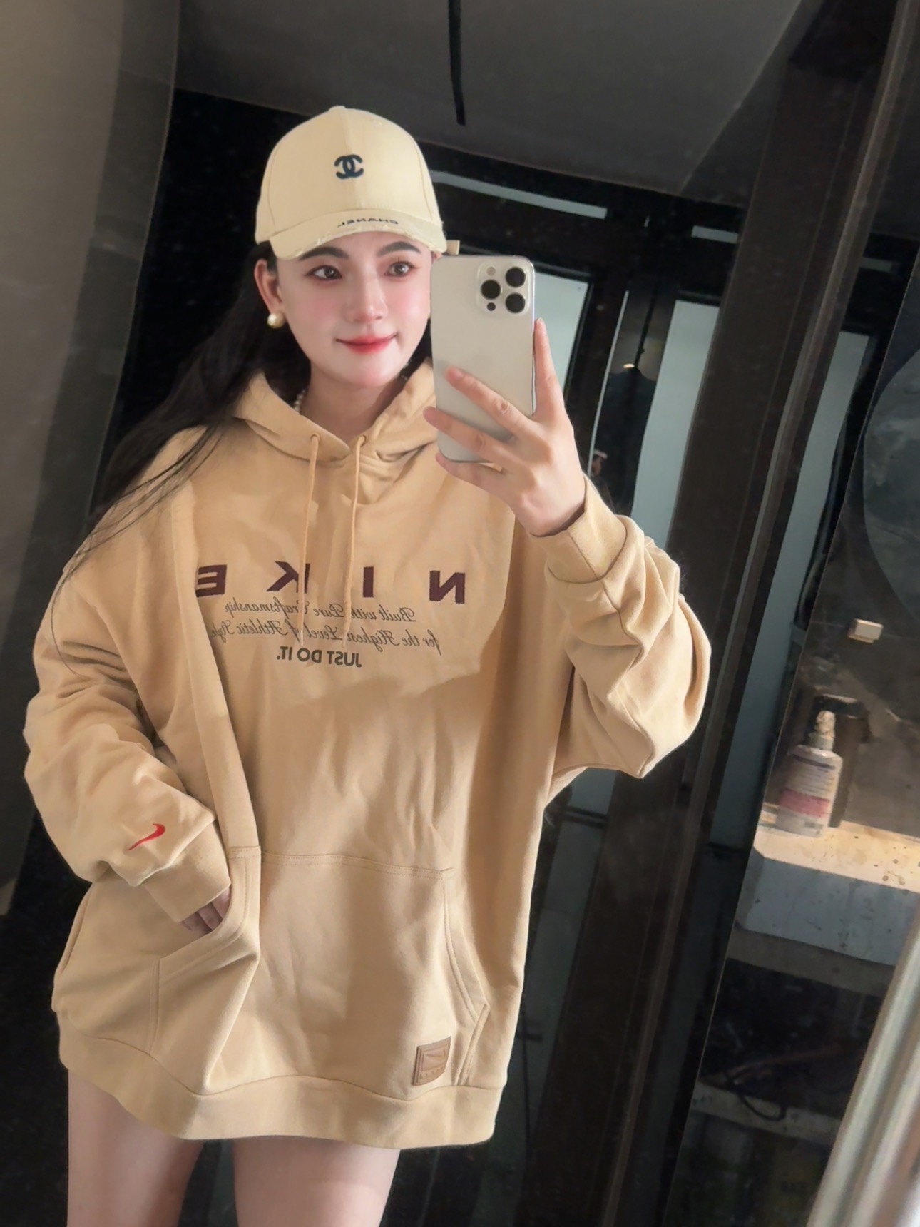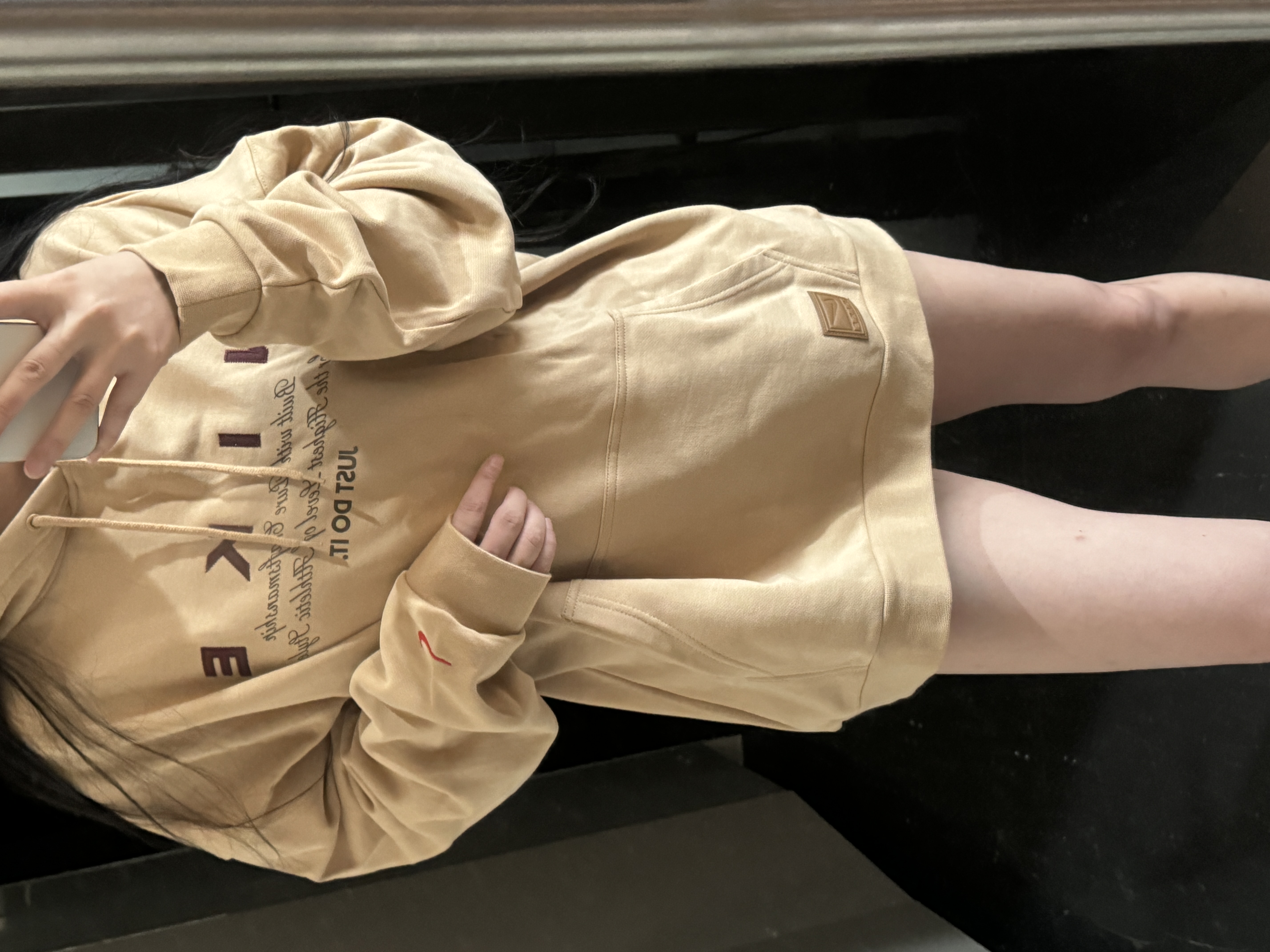 前侧袋鼠口袋边缘带有棕色皮革质感的Ni*ke标签 这款卫衣在官网马上断货了。如果你也喜欢这种"高级慵懒感",想要一件既有设计感又舒适百搭的卫衣,那这件Ni*ke米色复古连帽卫衣绝对是你的不二之选!
