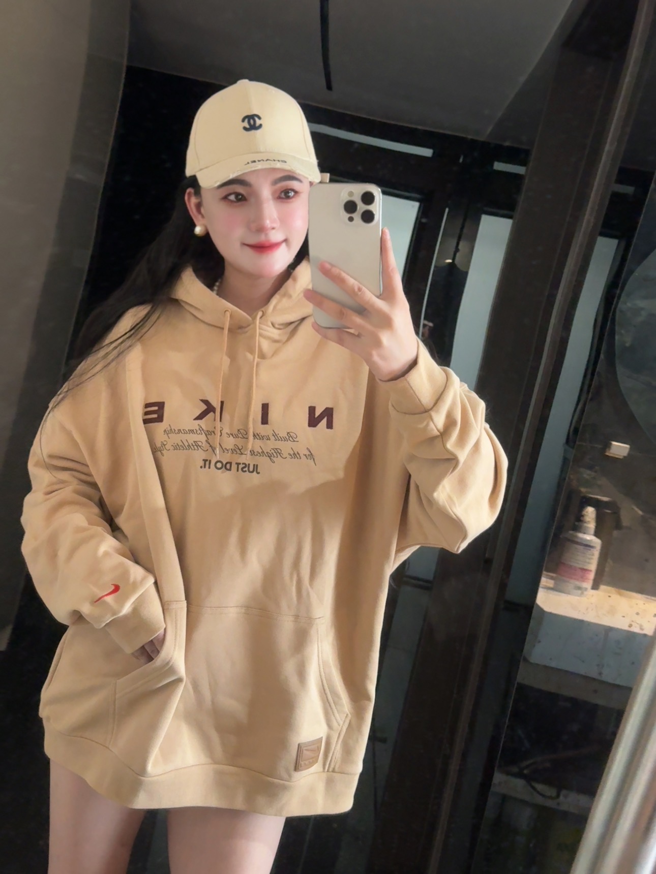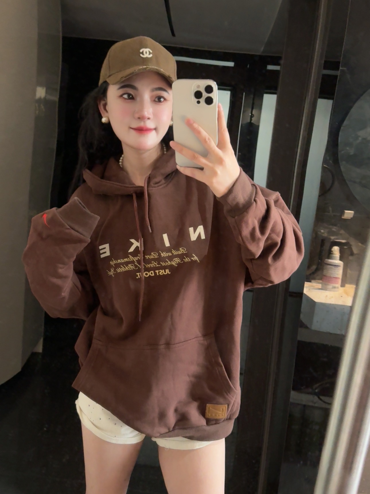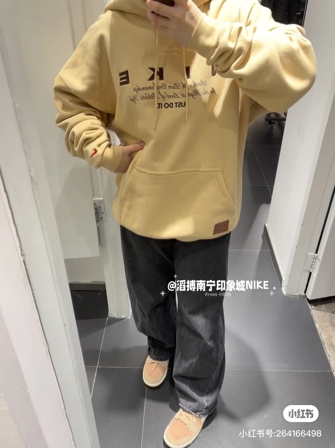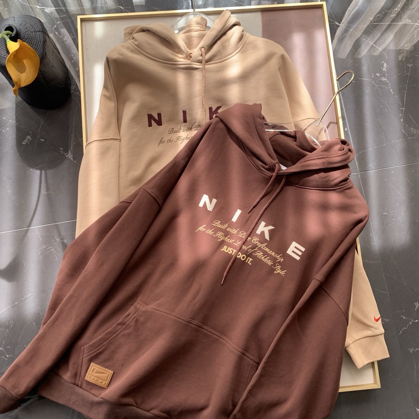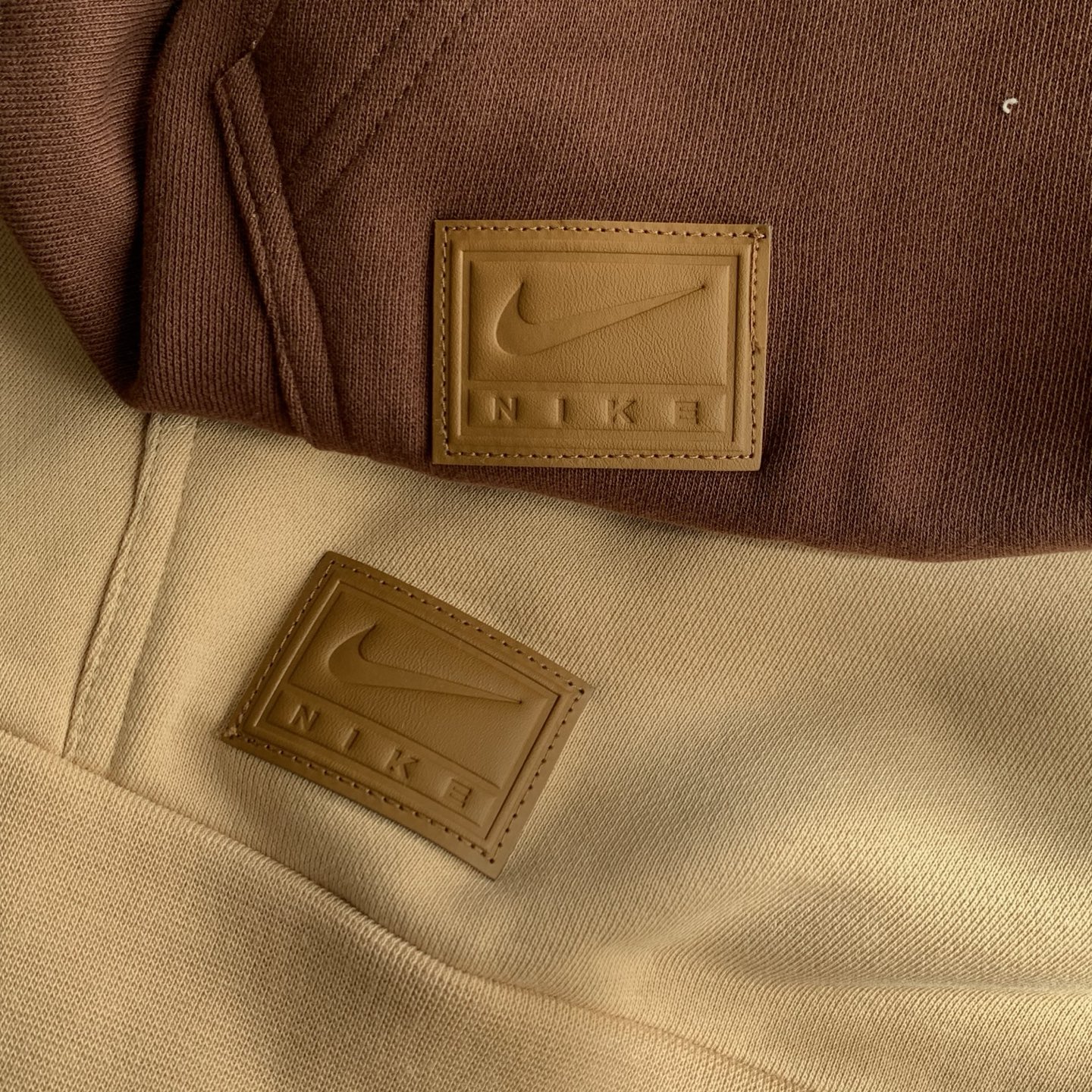 前侧袋鼠口袋边缘带有棕色皮革质感的Ni*ke标签 这款卫衣在官网马上断货了。如果你也喜欢这种"高级慵懒感",想要一件既有设计感又舒适百搭的卫衣,那这件Ni*ke米色复古连帽卫衣绝对是你的不二之选!