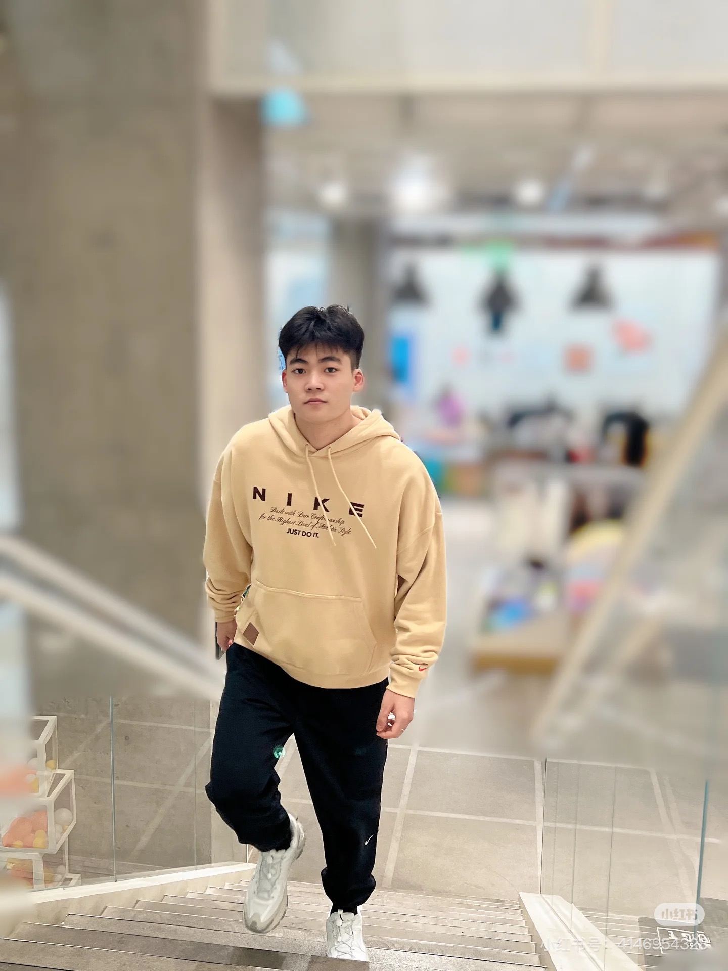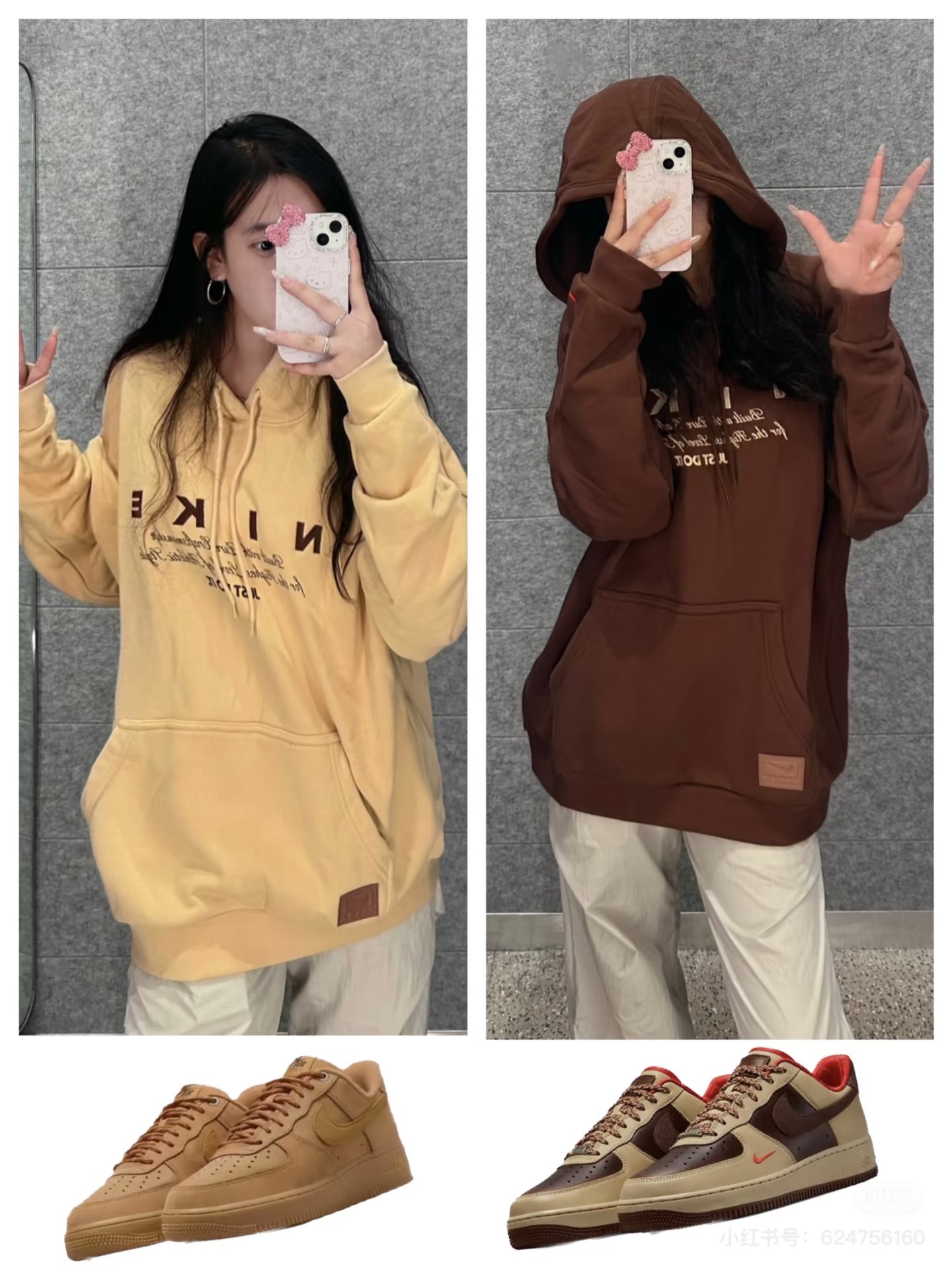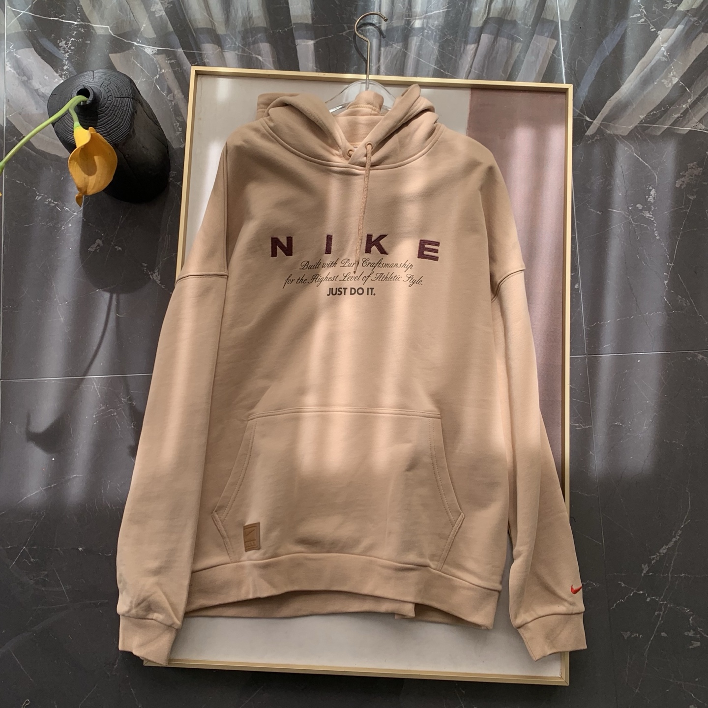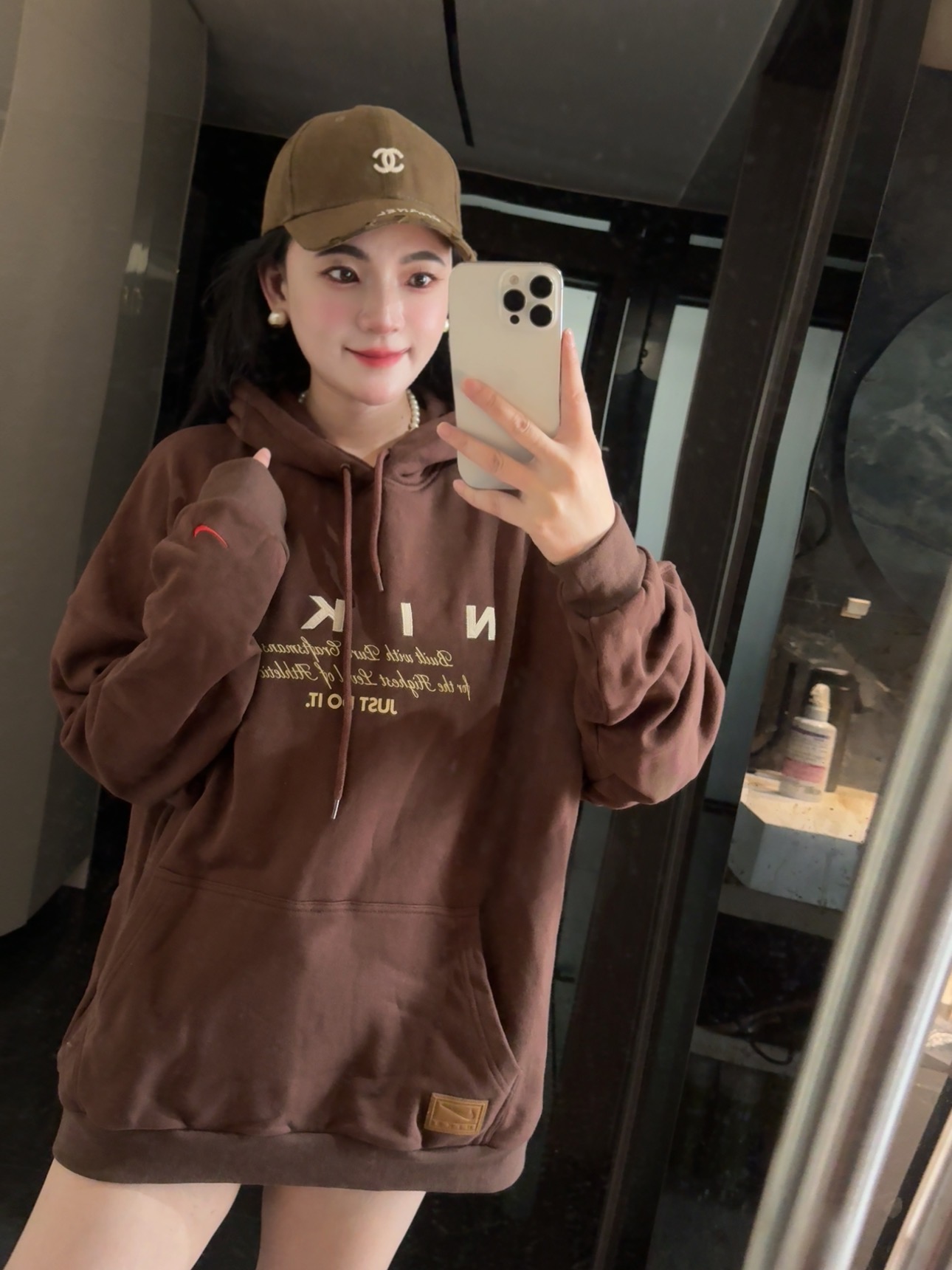 前侧袋鼠口袋边缘带有棕色皮革质感的Ni*ke标签 这款卫衣在官网马上断货了。如果你也喜欢这种"高级慵懒感",想要一件既有设计感又舒适百搭的卫衣,那这件Ni*ke米色复古连帽卫衣绝对是你的不二之选!
