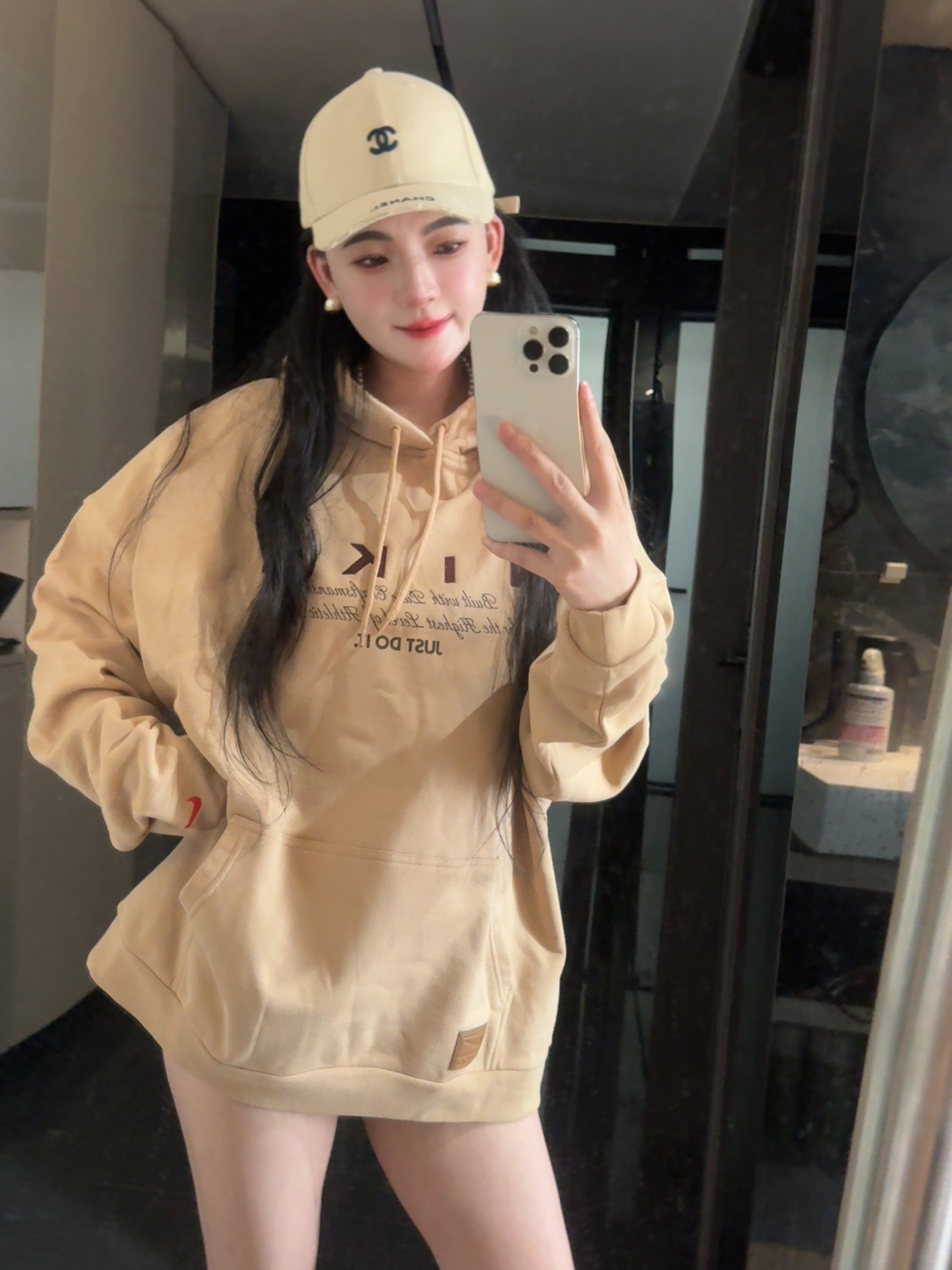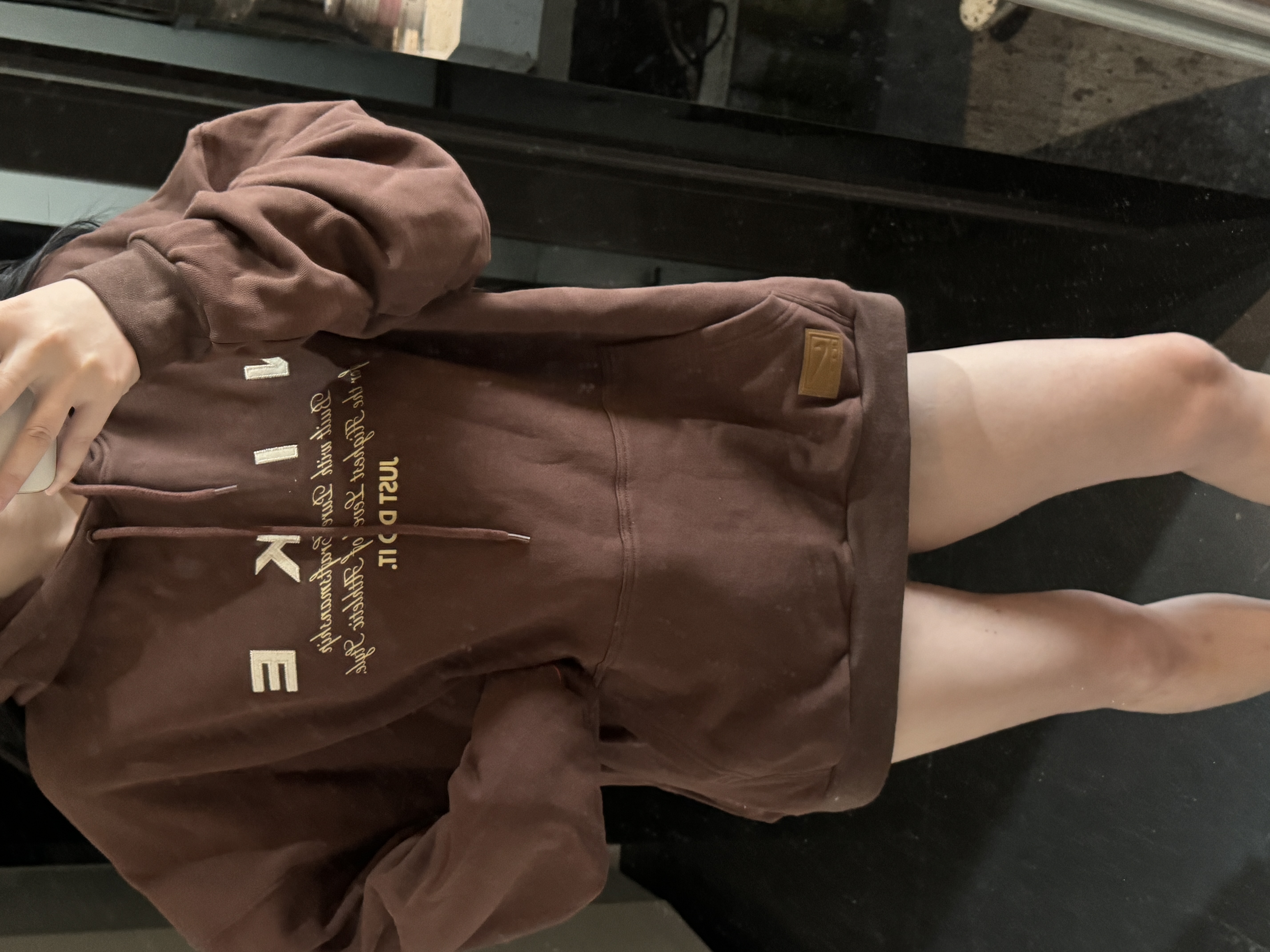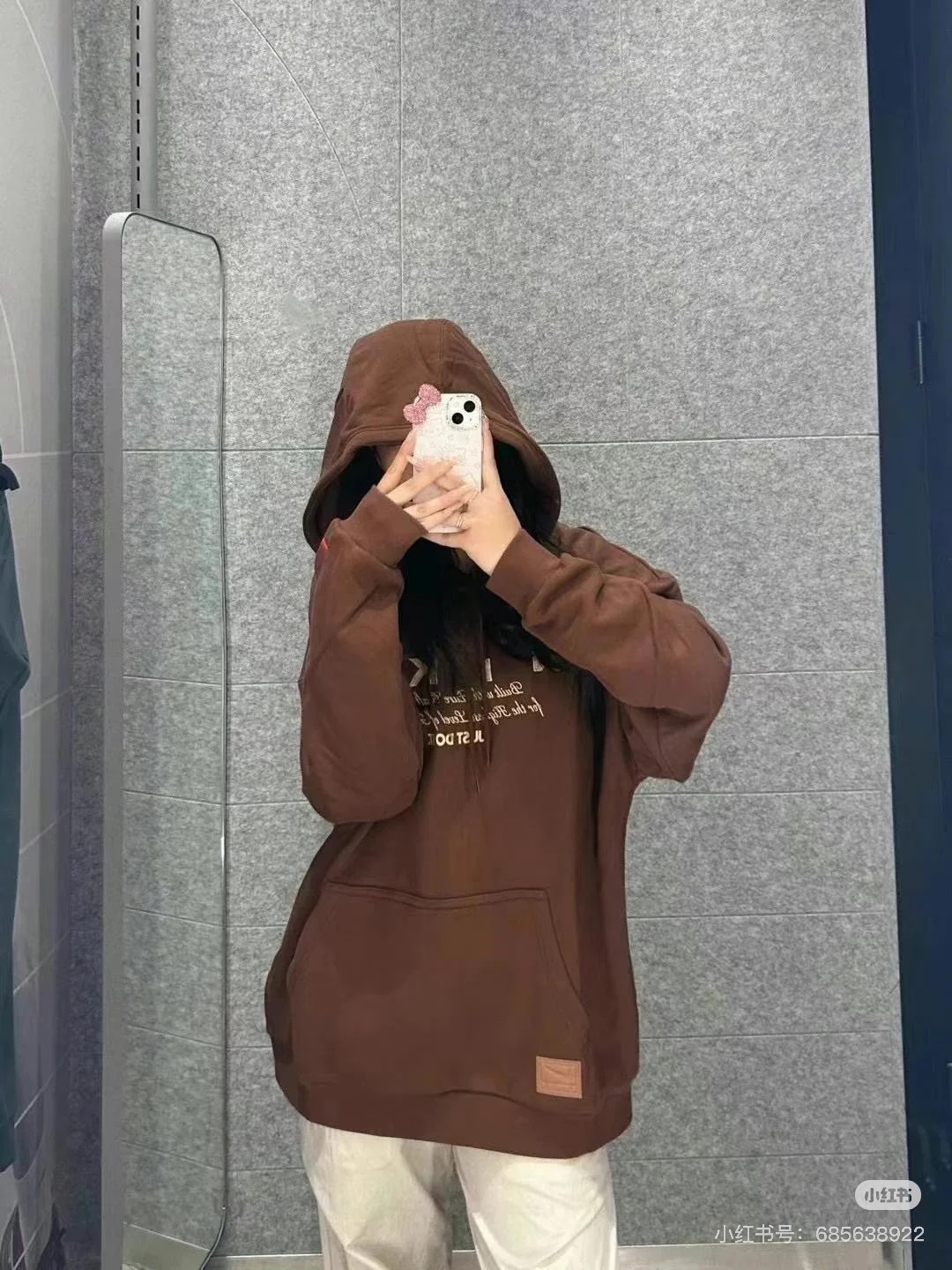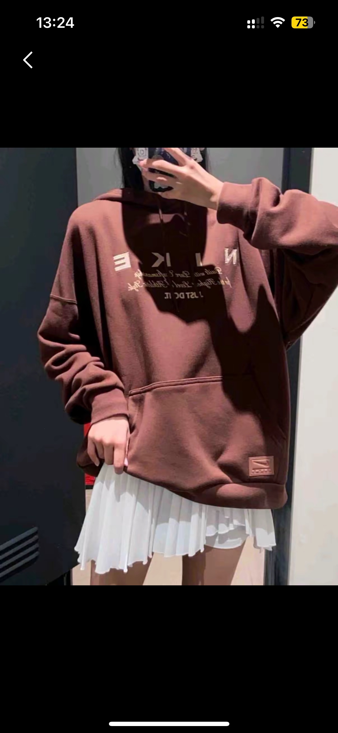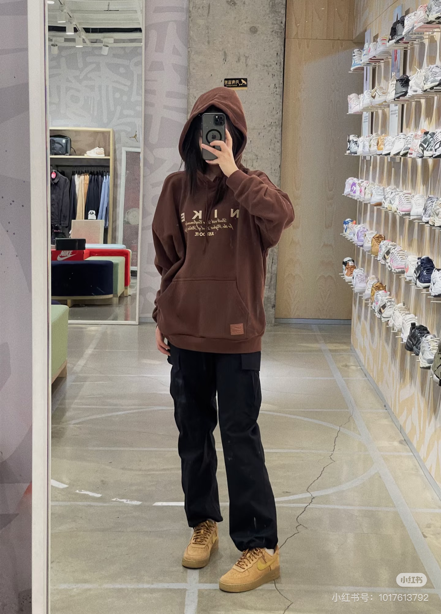 前侧袋鼠口袋边缘带有棕色皮革质感的Ni*ke标签 这款卫衣在官网马上断货了。如果你也喜欢这种"高级慵懒感",想要一件既有设计感又舒适百搭的卫衣,那这件Ni*ke米色复古连帽卫衣绝对是你的不二之选!
