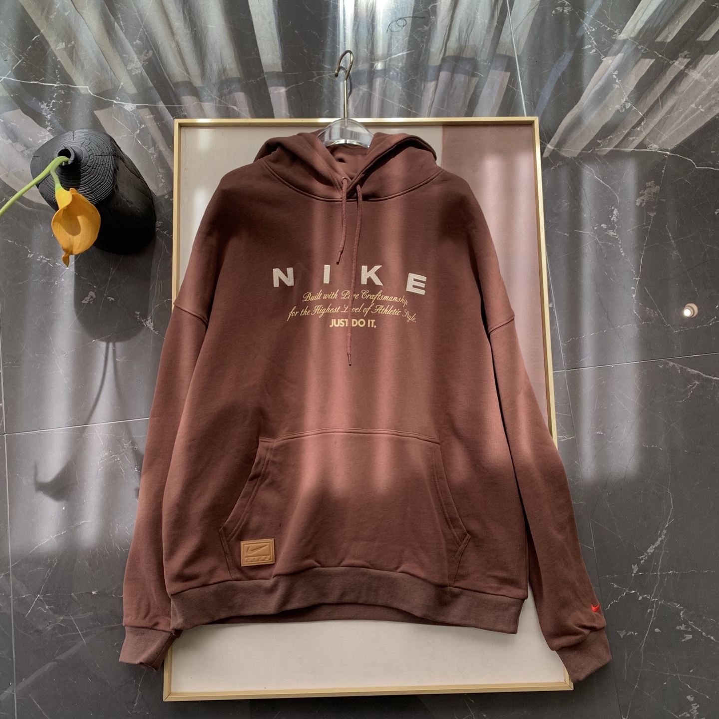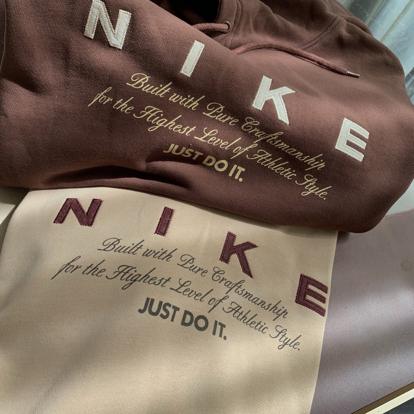 一眼沦陷的Nk复古卫衣,穿出高级慵懒感,100%纯棉面料,大号“NI*KE”字母采用刺绣工艺,下方配有英文标语:(意为“以纯粹工艺打造,成就更高水准的运动风格”)经典口号“JUST DO IT.”位于标语下方。左袖口处有红色迷你Swoosh标志。