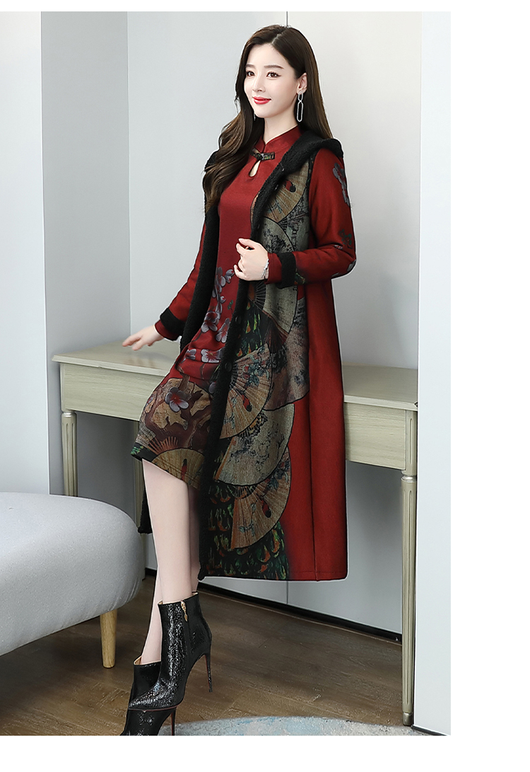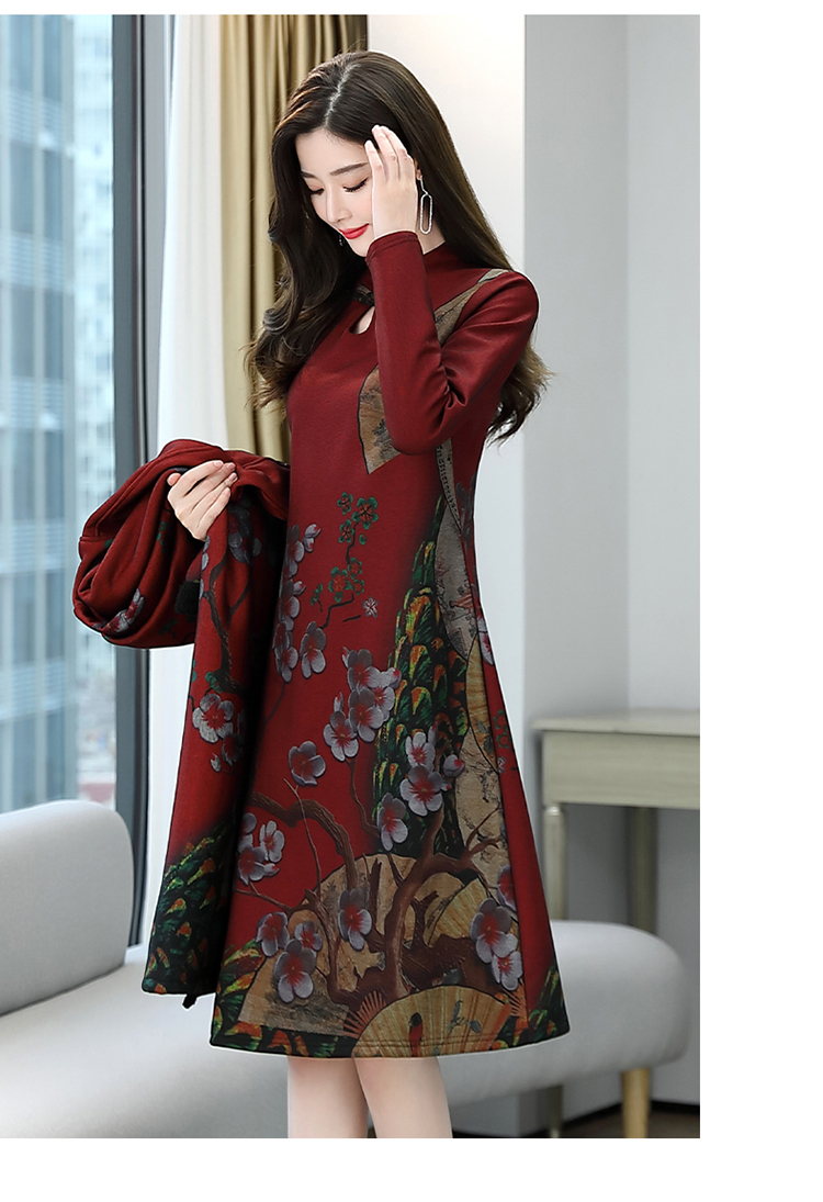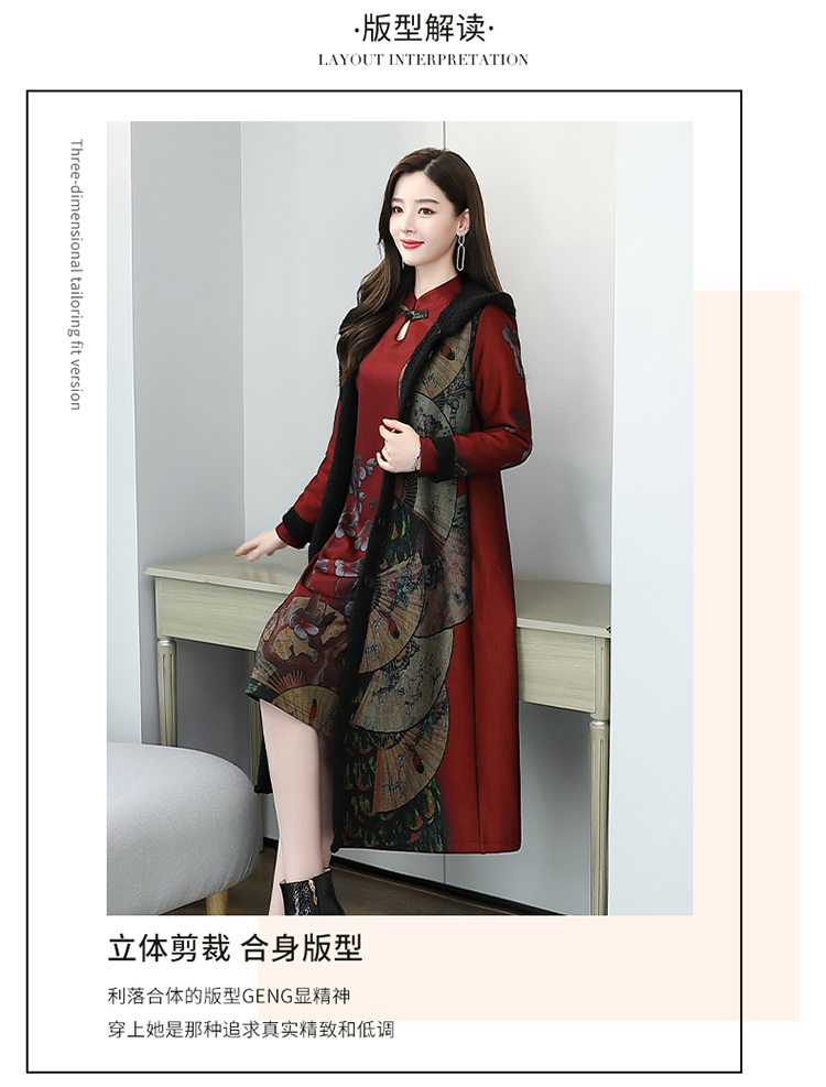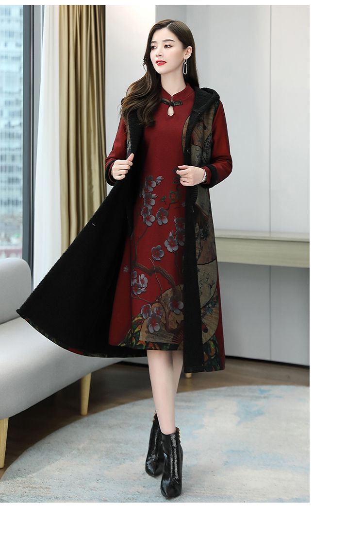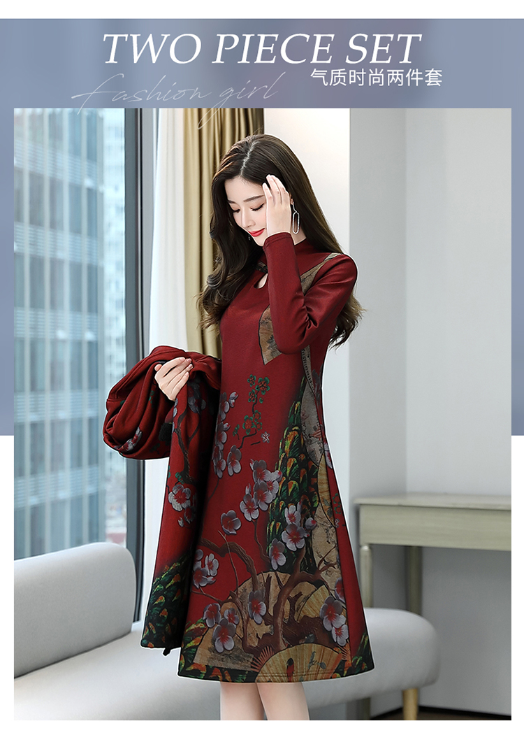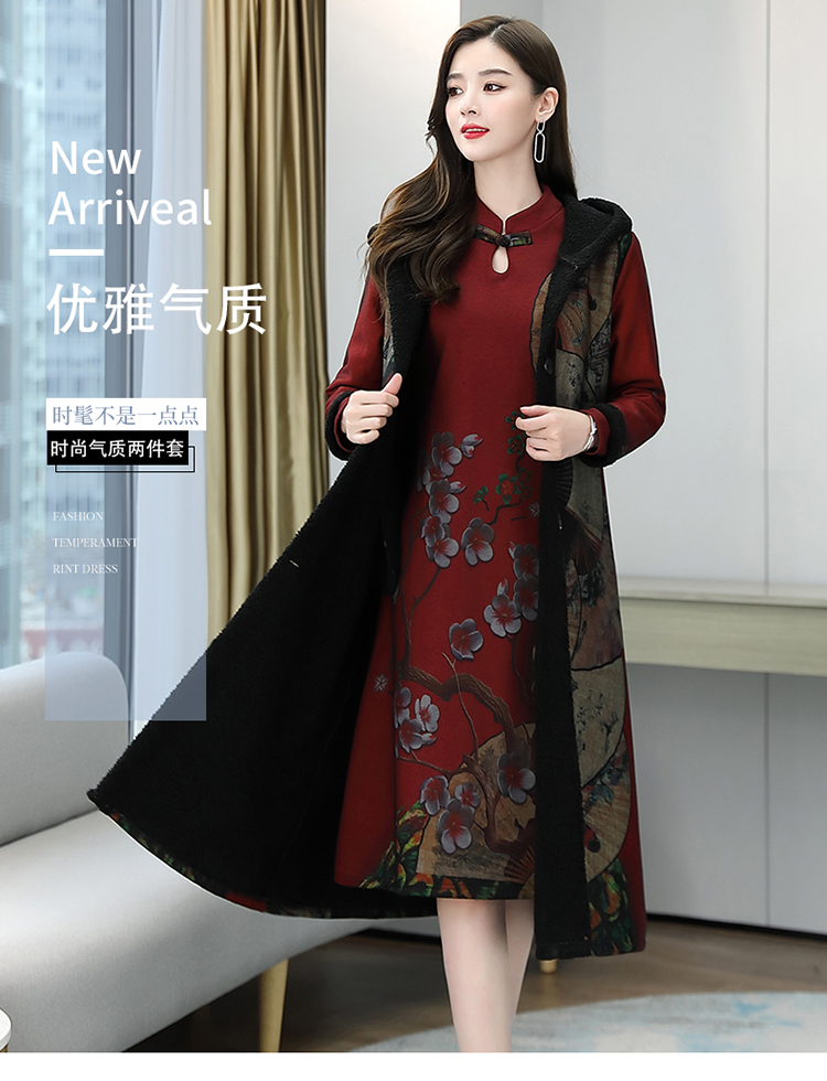 WZNH-HRYZ7172冬季时尚气质优雅印花长款连衣裙配马甲外套