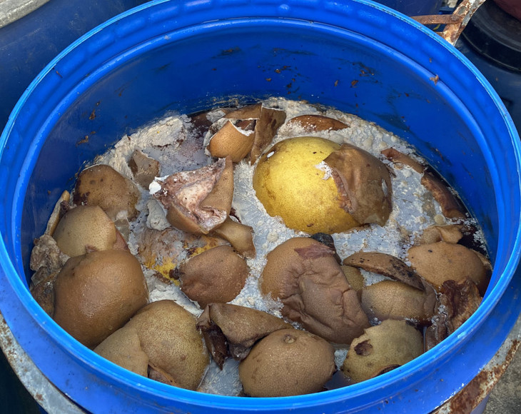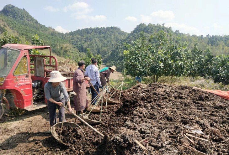 施肥:从沼气池淋水肥,收集次果和柚子皮自制柚子酵素、花生麸、鱼和糖蜜发酵液体肥,牛粪和玉米杆制做堆肥。