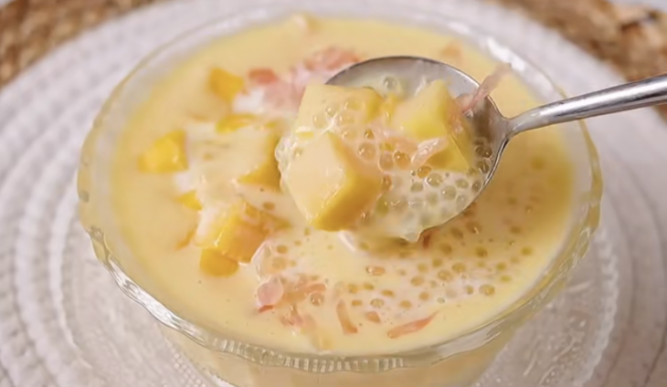 ♥ 姜芒打泥,将小西米、芒果肉和部分蜜柚粒放入盛器里倒入椰浆搅拌均匀,可以根据自己的喜好加入牛奶、椰奶