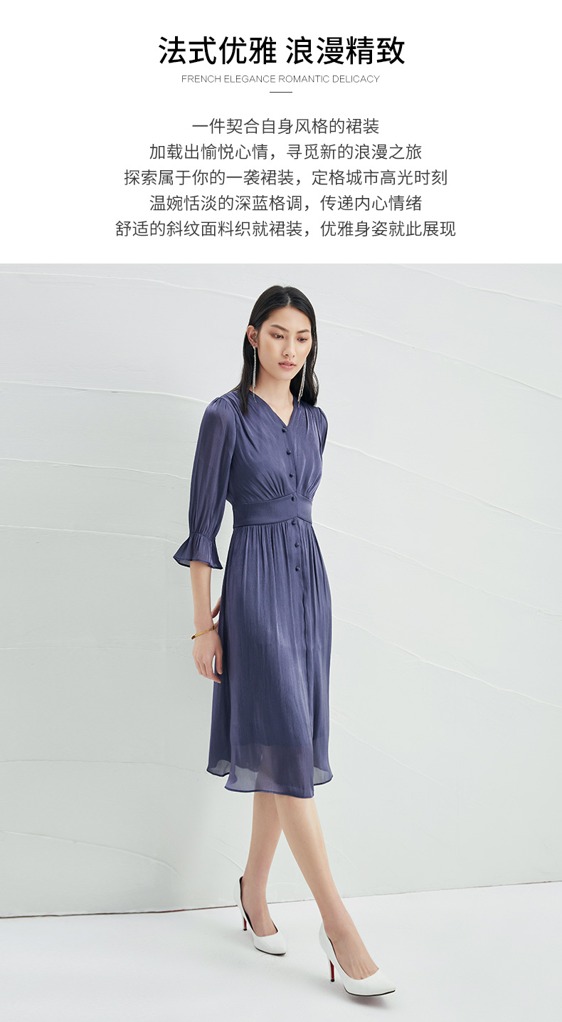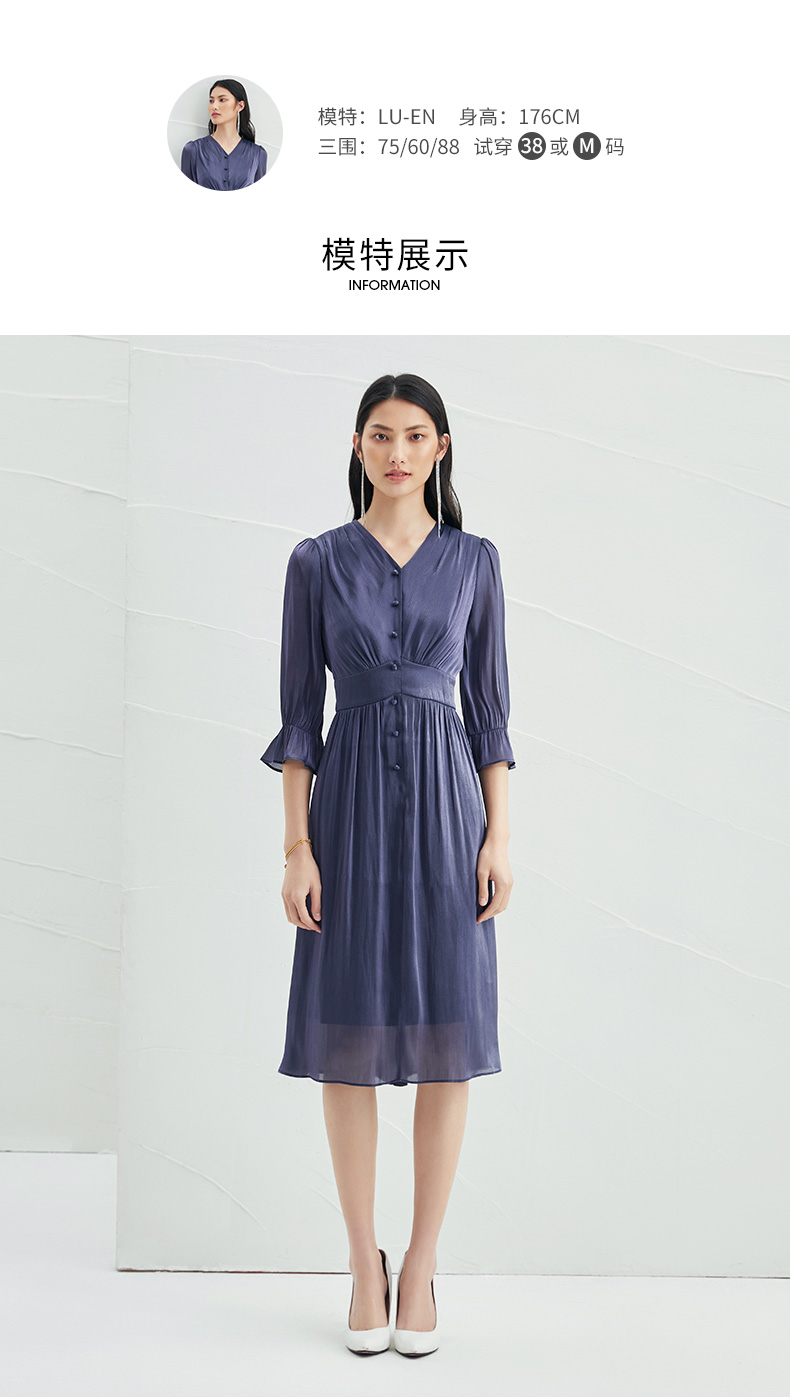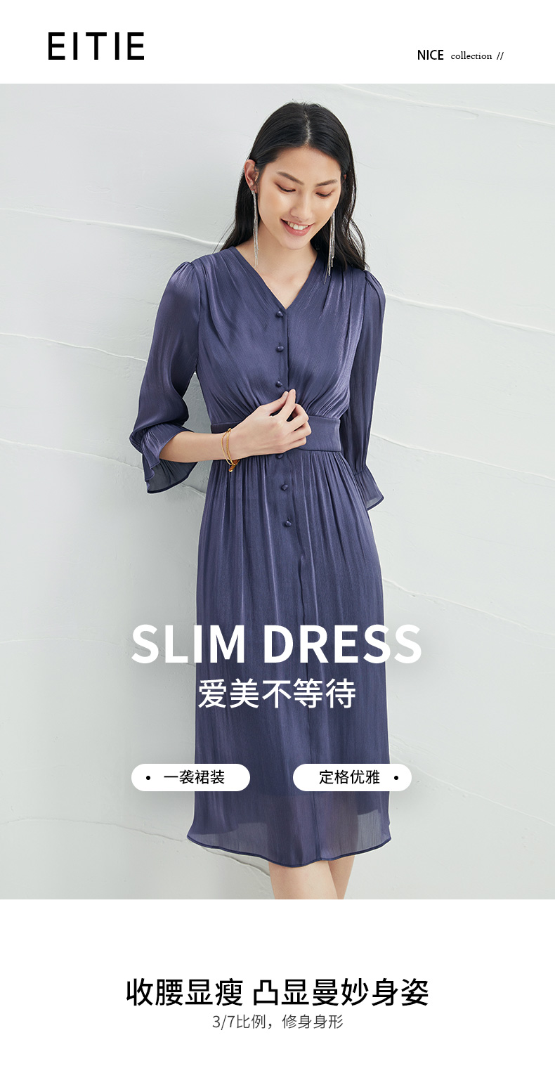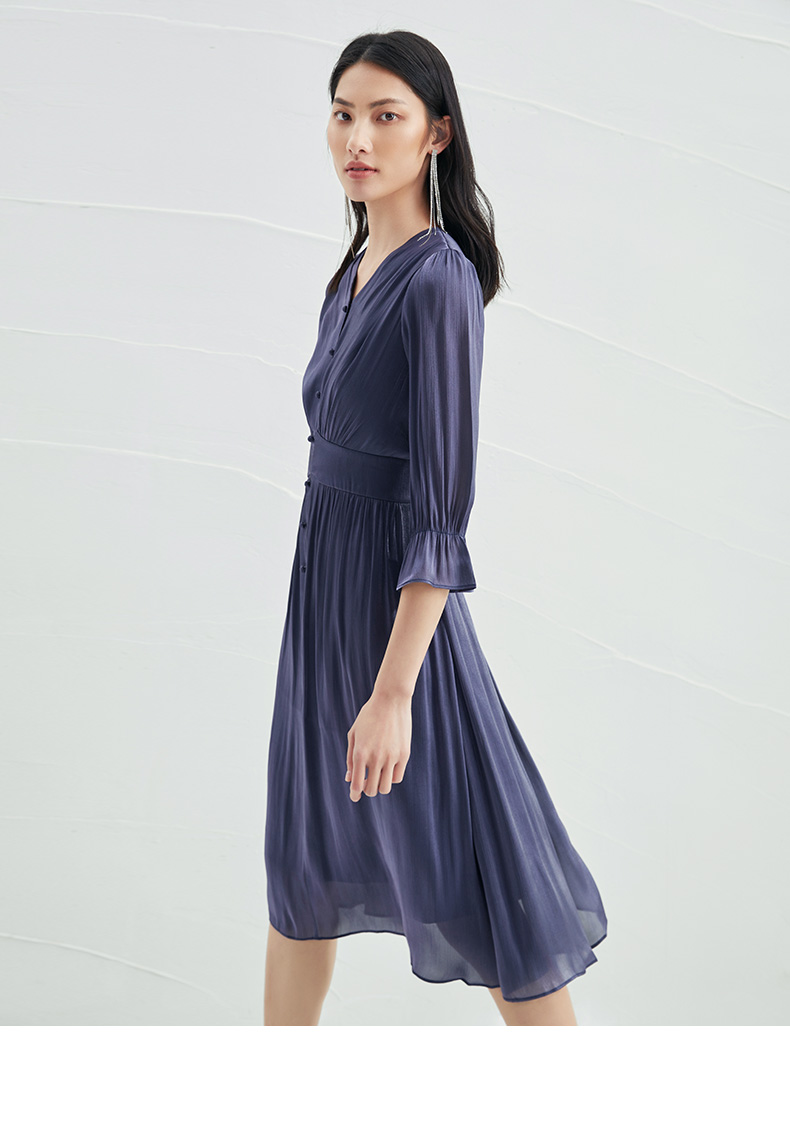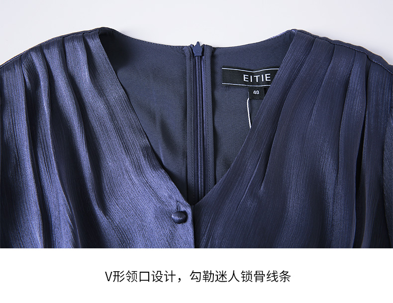 EITIE爱特爱春夏新款V领五分喇叭袖优雅纯色A连衣裙6607355