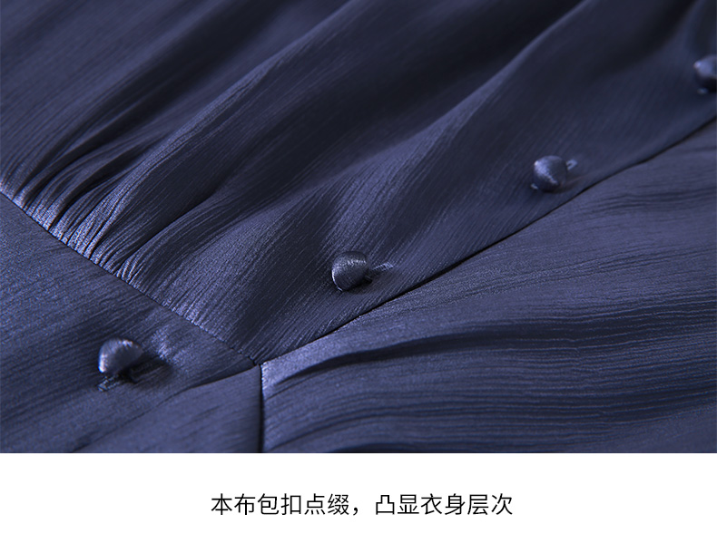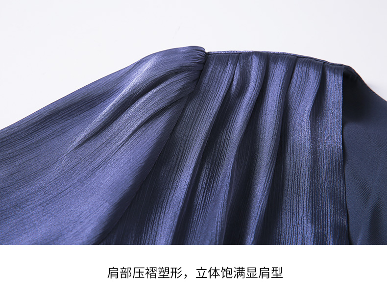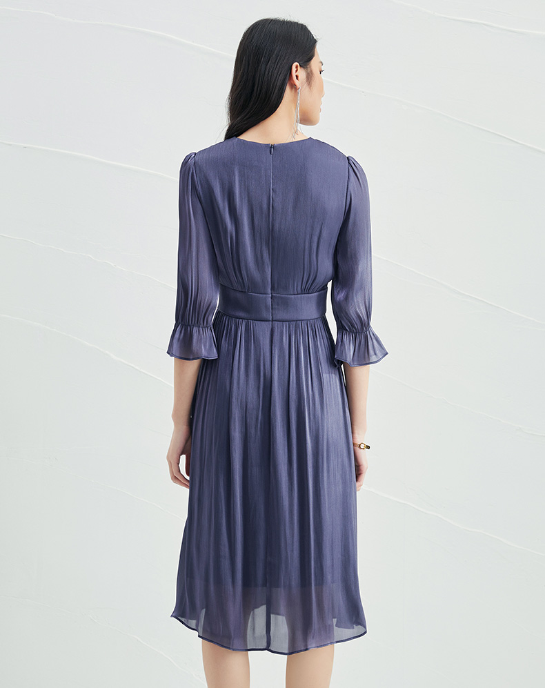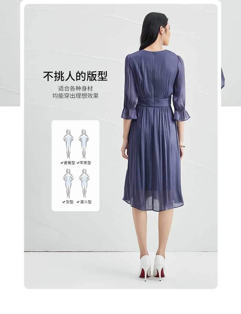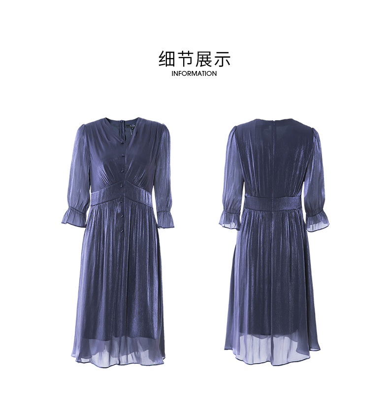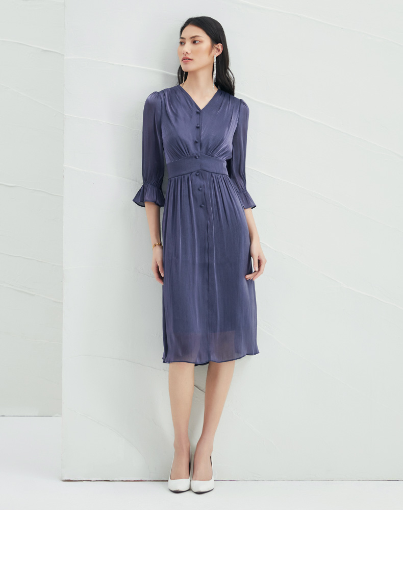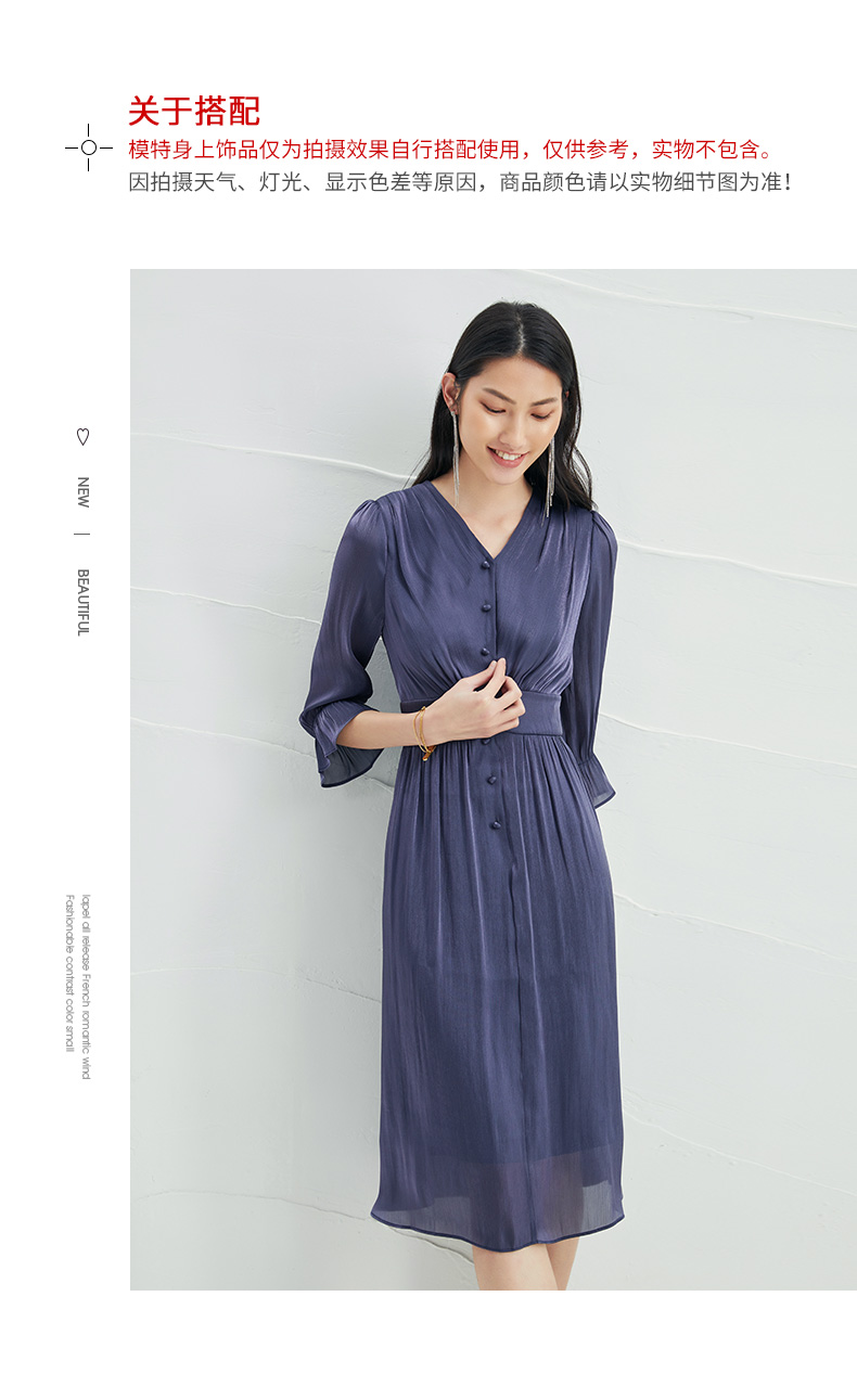 EITIE爱特爱春夏新款V领五分喇叭袖优雅纯色A连衣裙6607355