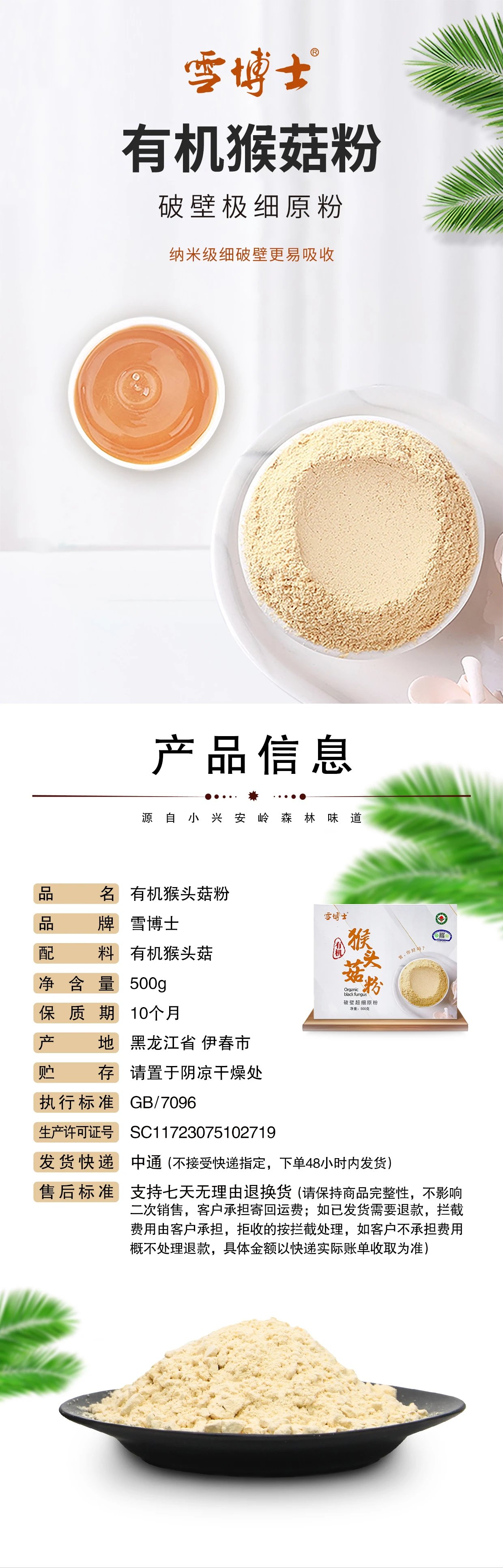 【有机猴头菇粉】【全系列最高满减80每单赠10元全场券】雪博士有机猴头菇粉500g盒装【基地直邮】