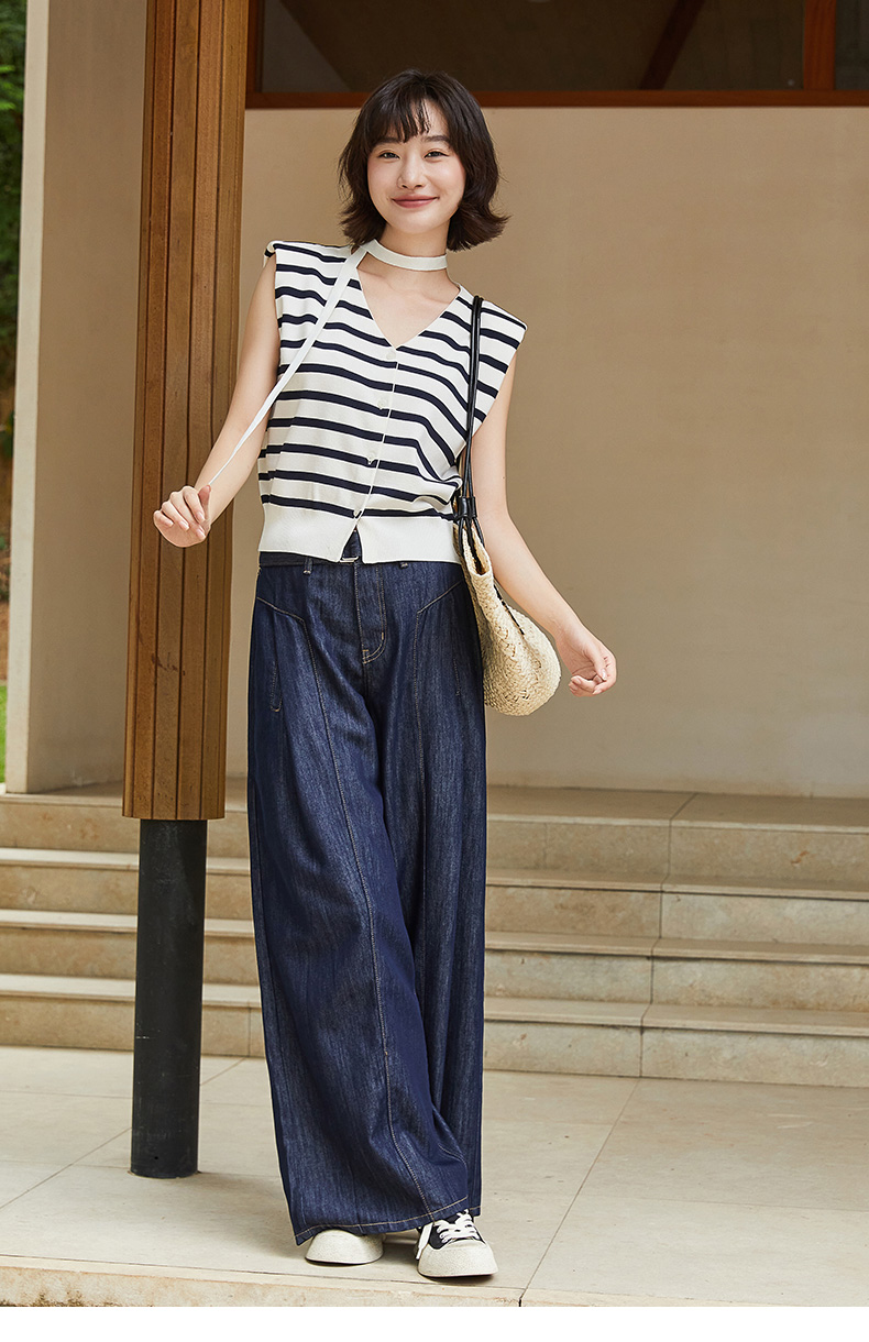 韩系松弛感条纹针织马甲女 黑白撞色 V 领挂脖系带单排扣开衫 小个子通勤百搭无袖上衣