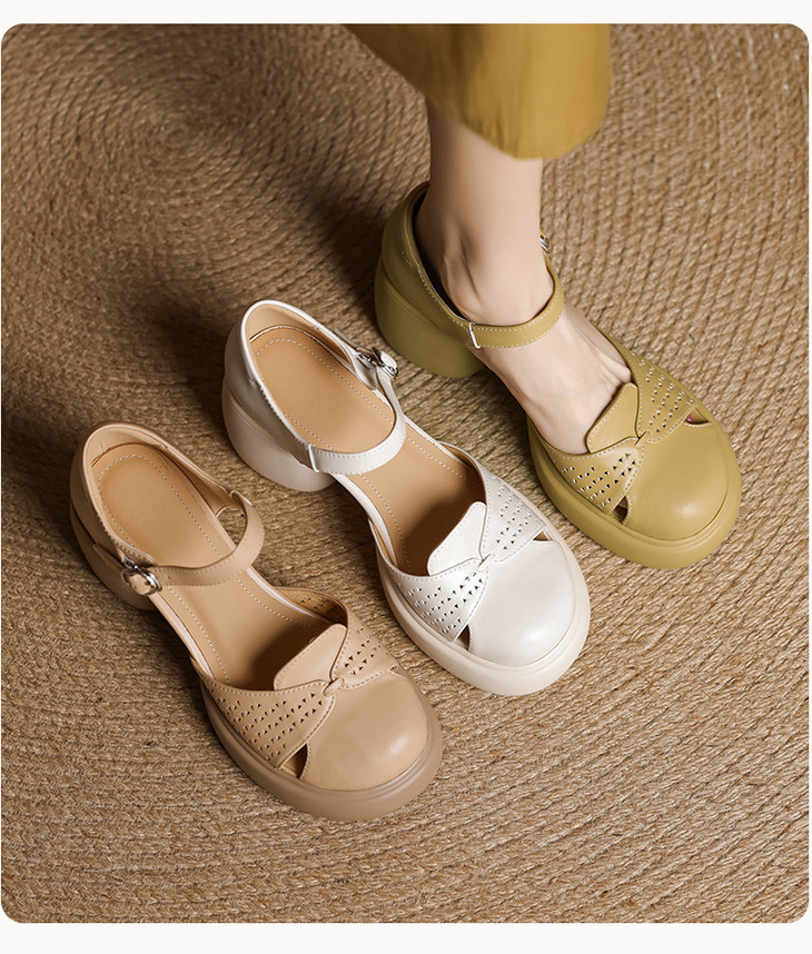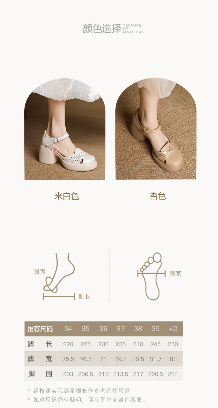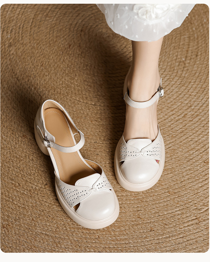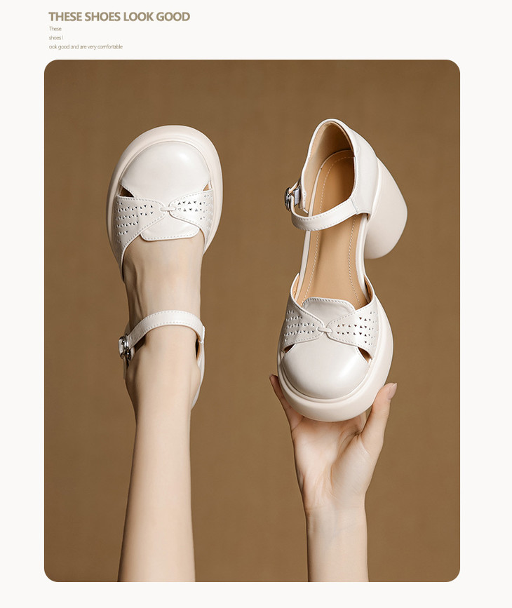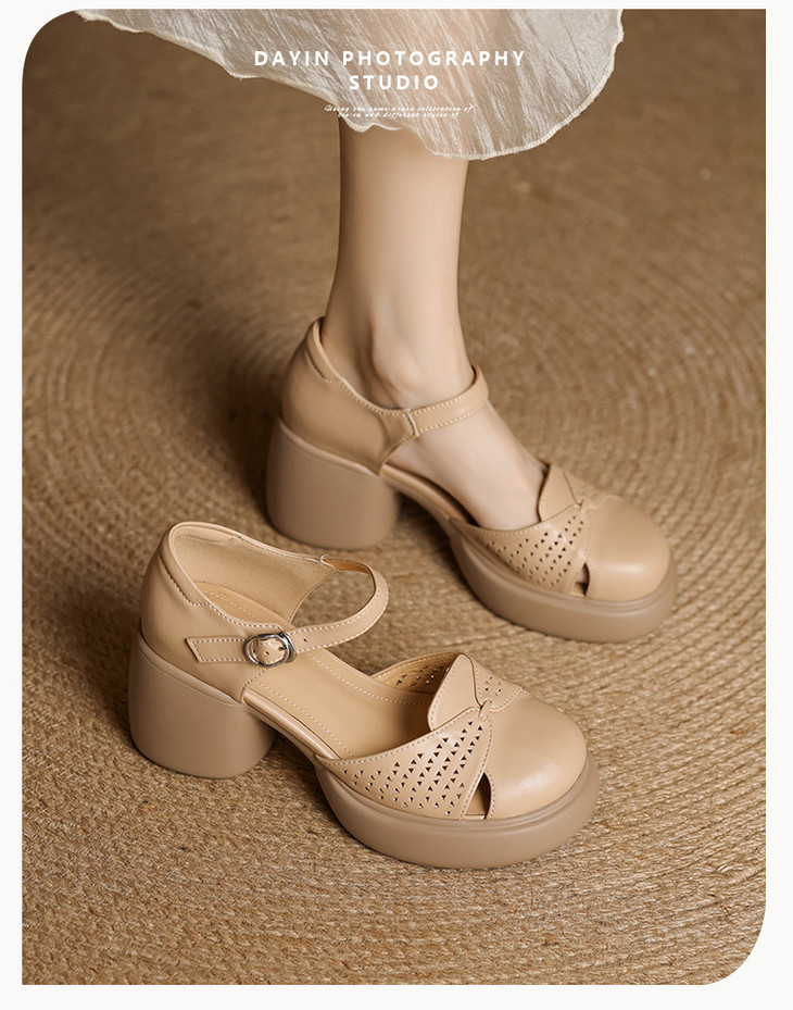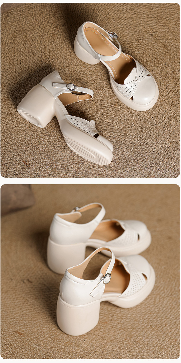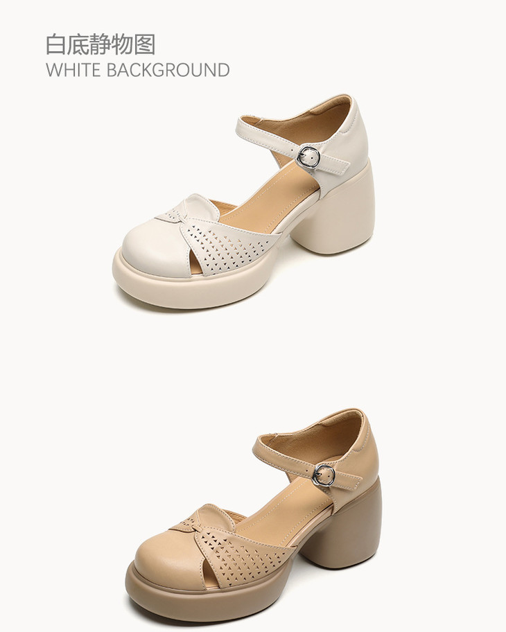 【预售5天】真皮粗跟凉鞋一字扣高跟鞋防水台包头新款春夏镂空米女鞋&1681211