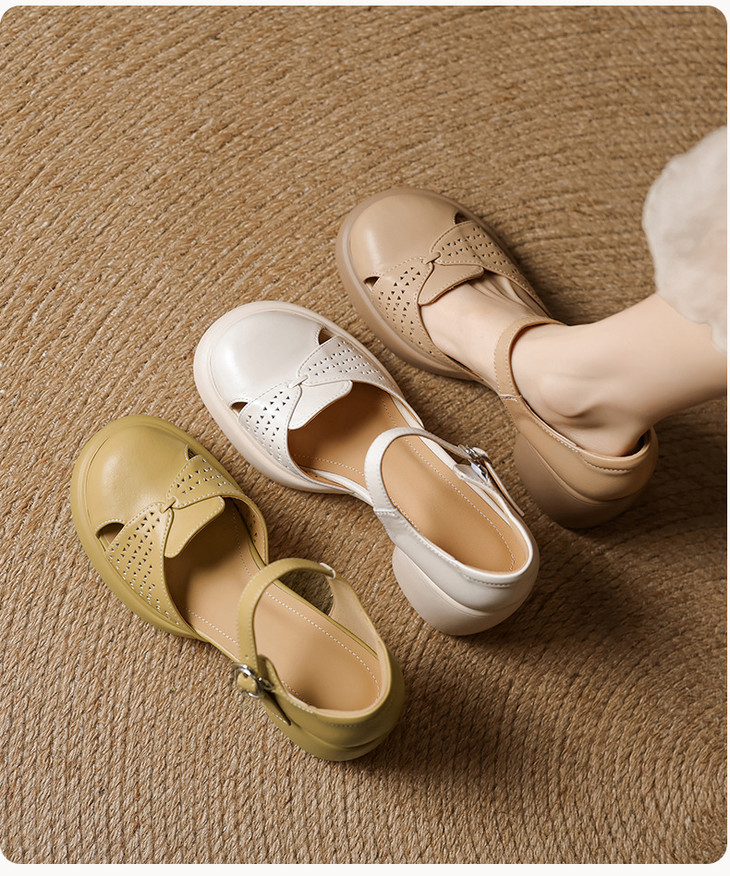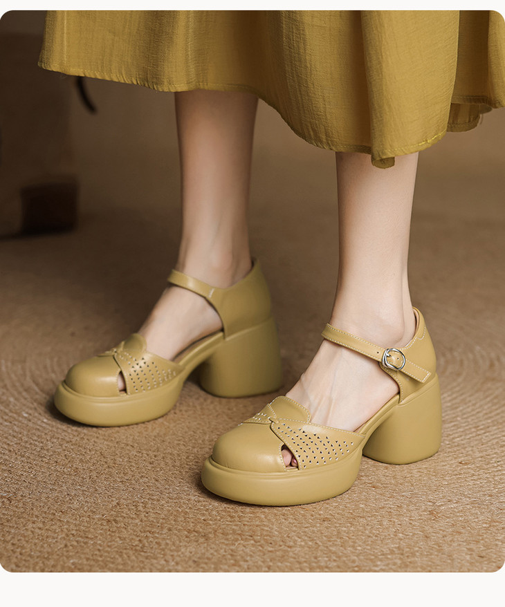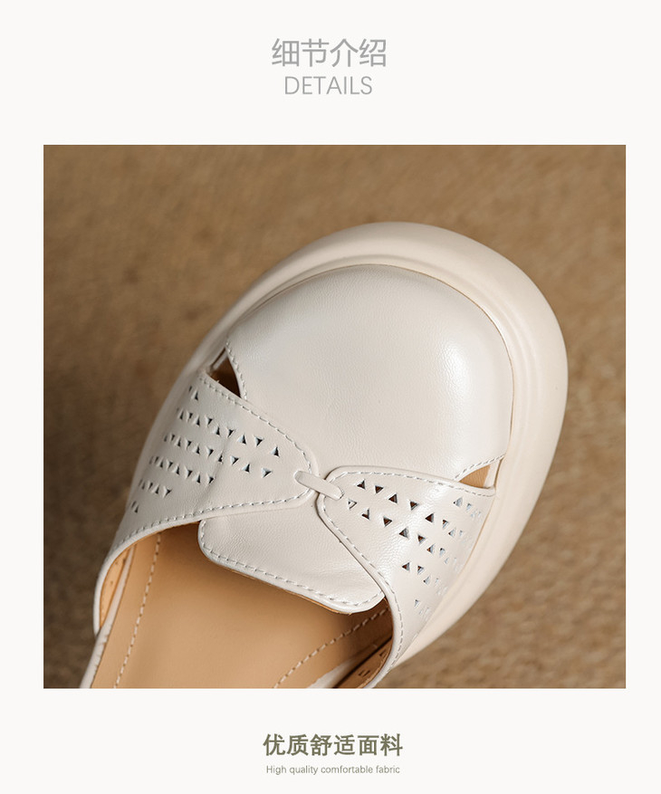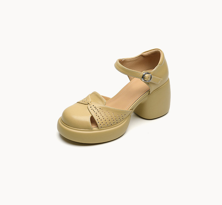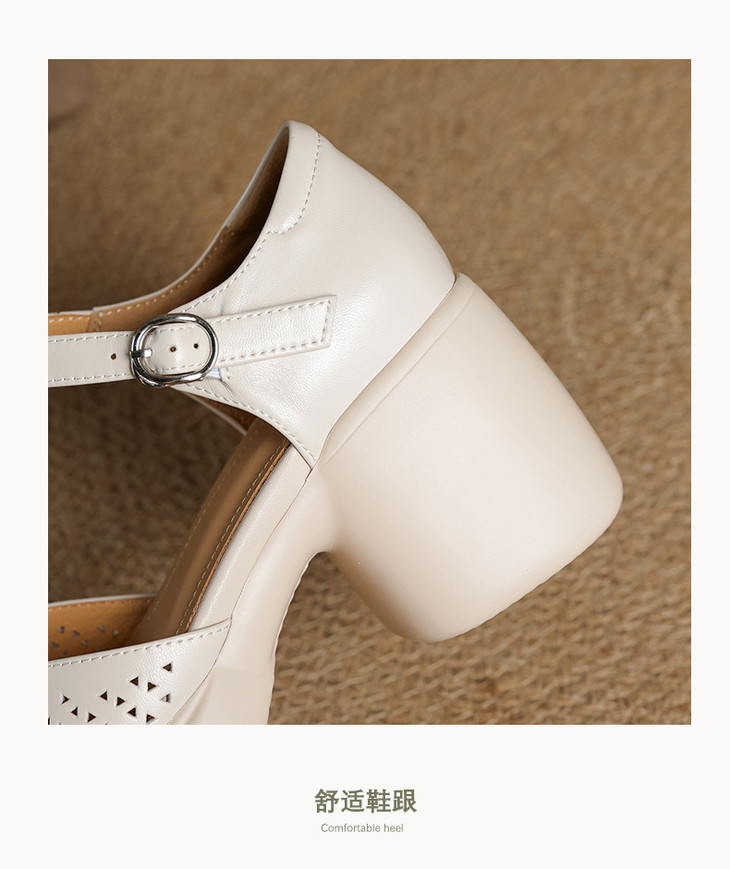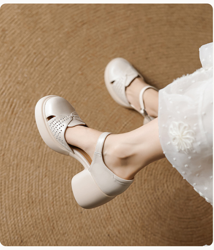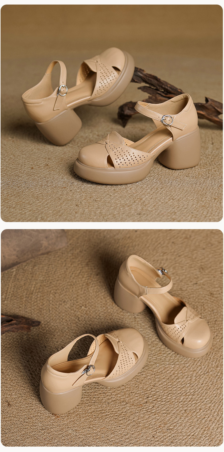 【预售5天】真皮粗跟凉鞋一字扣高跟鞋防水台包头新款春夏镂空米女鞋&1681211