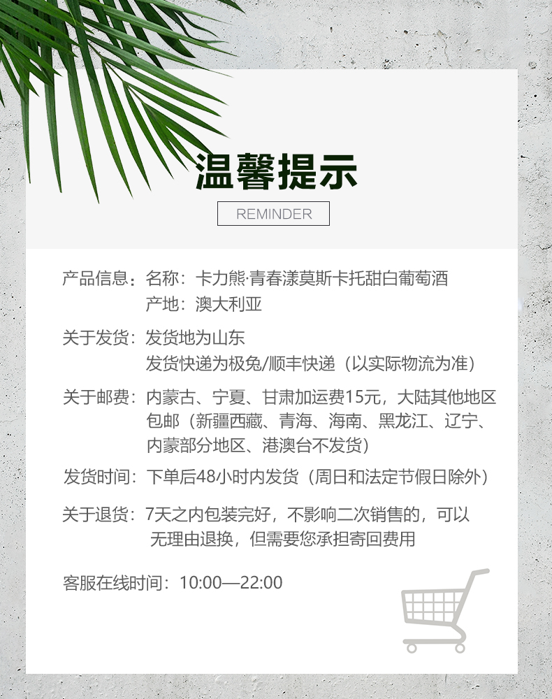 热卖中!!【天猫超市 | 澳大利亚原瓶进口】卡力熊·青春漾莫斯卡托甜白葡萄酒 10度甜型