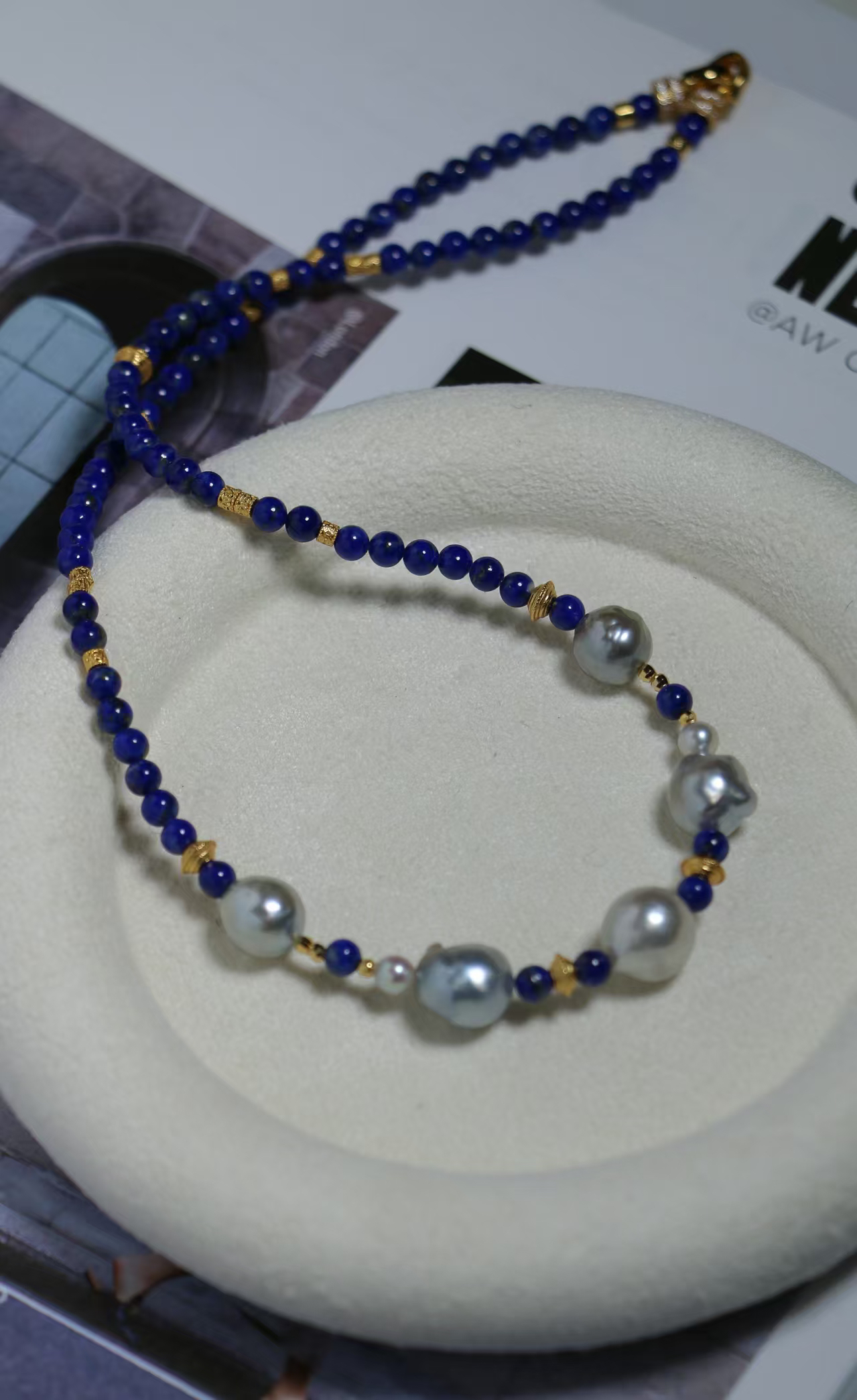 《钴蓝山海》大溪地黑珍珠铂金灰巴洛克+青金石+纯银配件,珠子约9-10mm