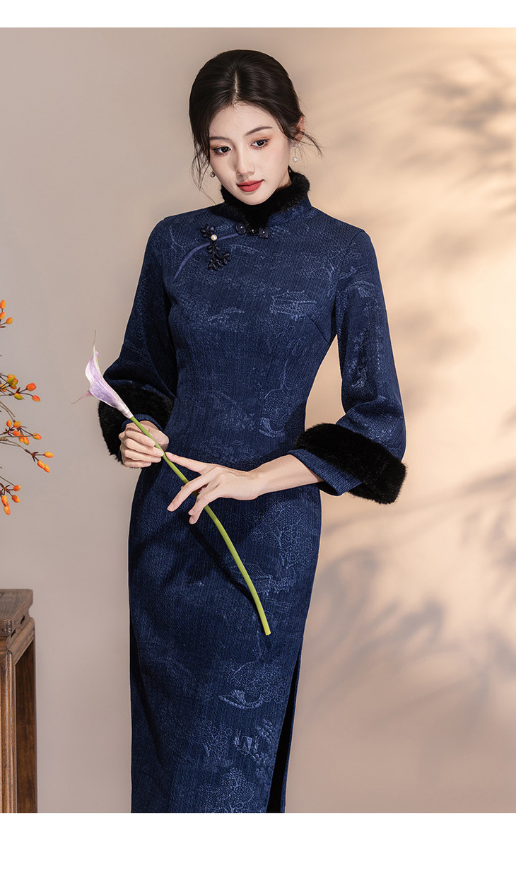 深蓝色加绒加厚新中式连衣裙日常可穿LSB4166 商品图4