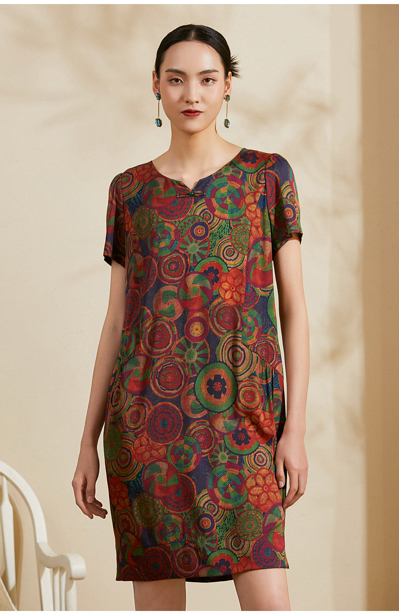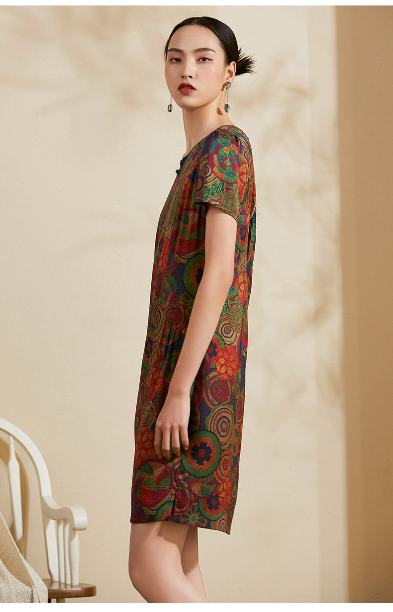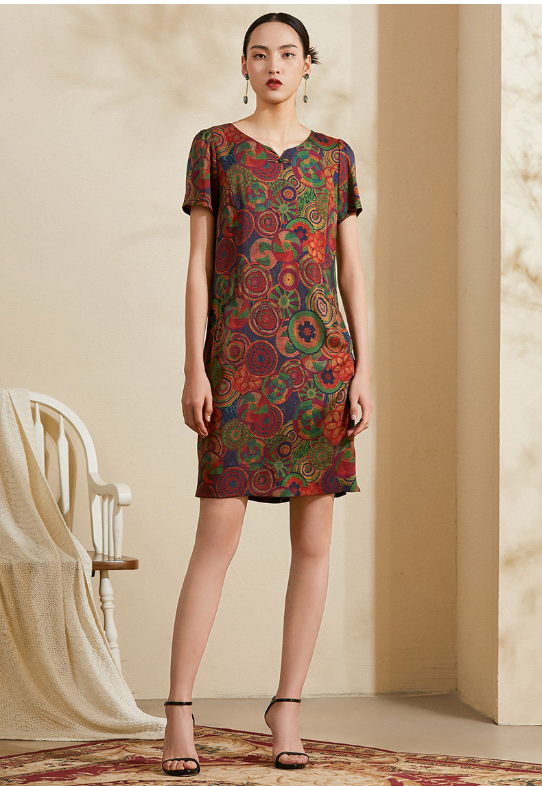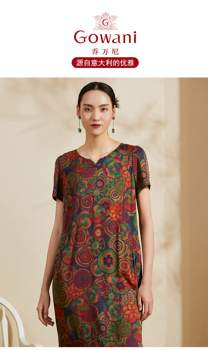 乔万尼新款夏桑蚕丝印花宽松直筒休闲真丝连衣裙女中长款ES2E128
