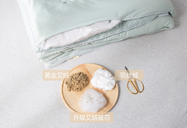 800g艾绒+羽丝绒,黄金配比,既温暖养身,又蓬松好睡。