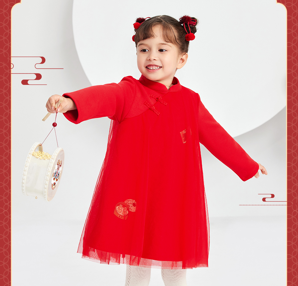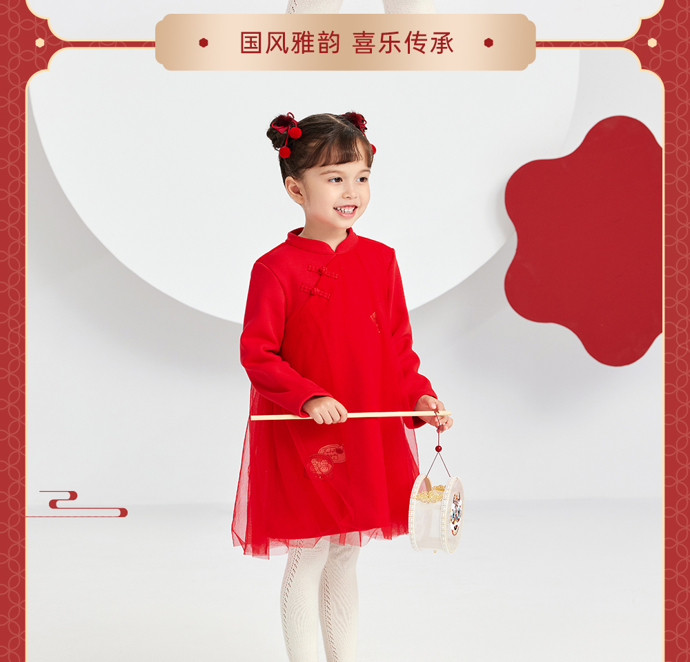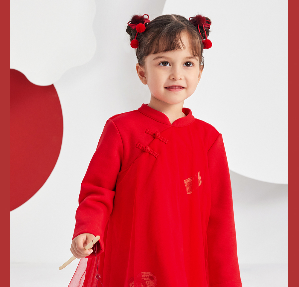 英氏新中式暖感加绒连衣裙女童秋装国风喜庆裙子