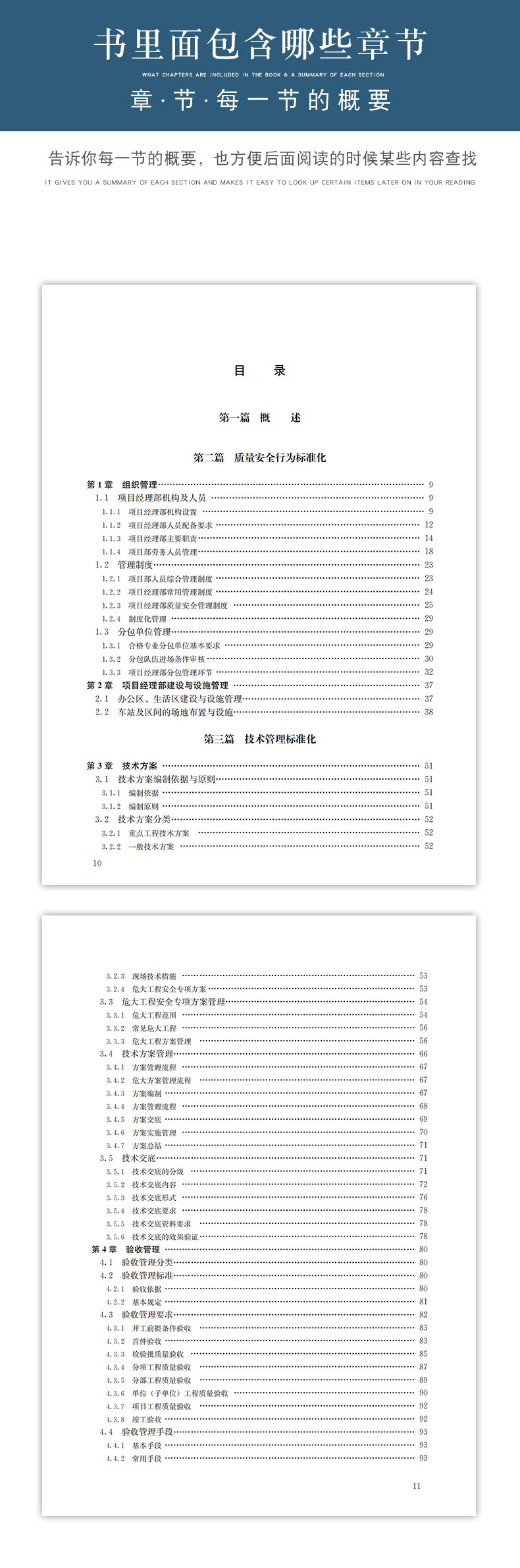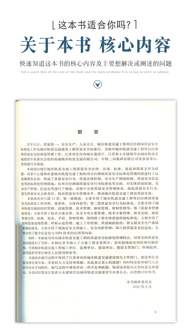 本指南共分5篇12章。第一篇为概述,主要介绍了城市轨道交通工程项目经理部质量安全标准化工作历程、重要性、主要内容等;第二篇质量安全行为标准化,主要介绍了城市轨道交通的组织管理、设施管理、技术管理、验收管理、资料管理等;第三篇工程质量实体控制标准化,主要介绍了材料设备进场管理、样板示范管理、施工工序控制、质量缺陷整改;第四篇安全生产现场控制标准化,主要介绍了现场安全文明施工、安全风险管理;第五篇质量安全信息化,主要介绍了数字信息化与BIM技术的应用等内容。
