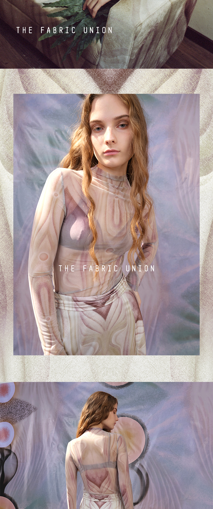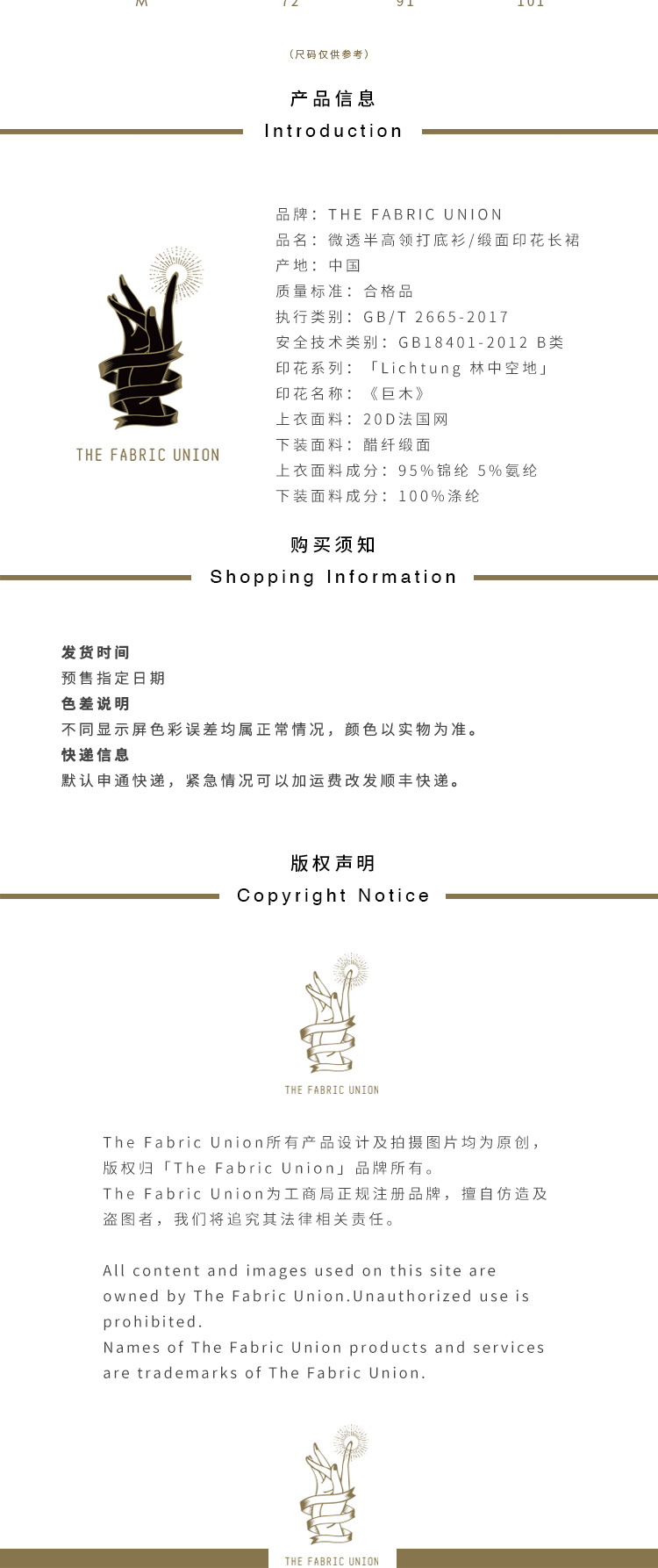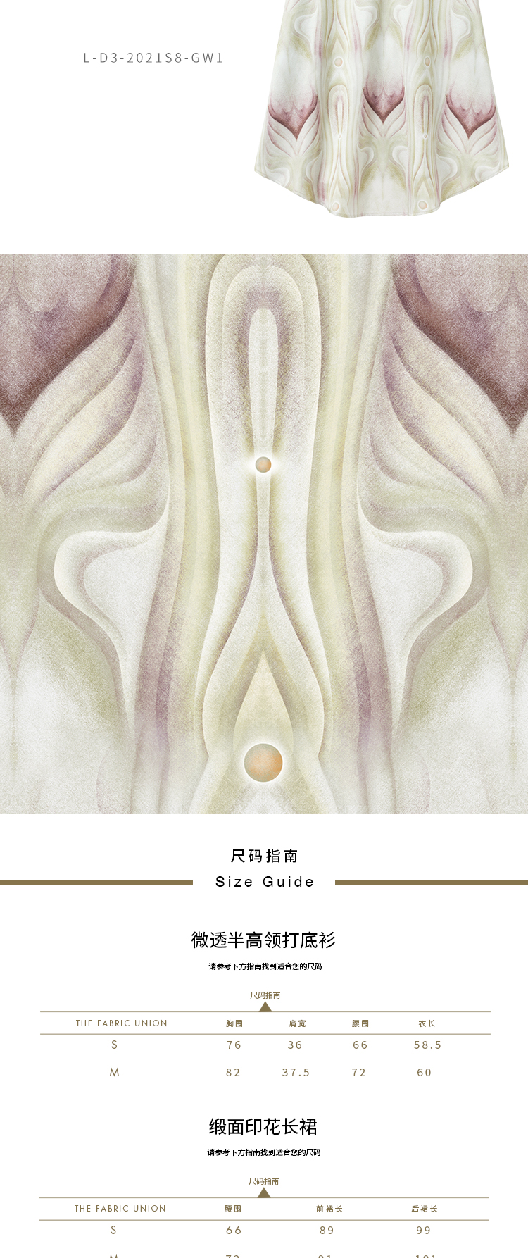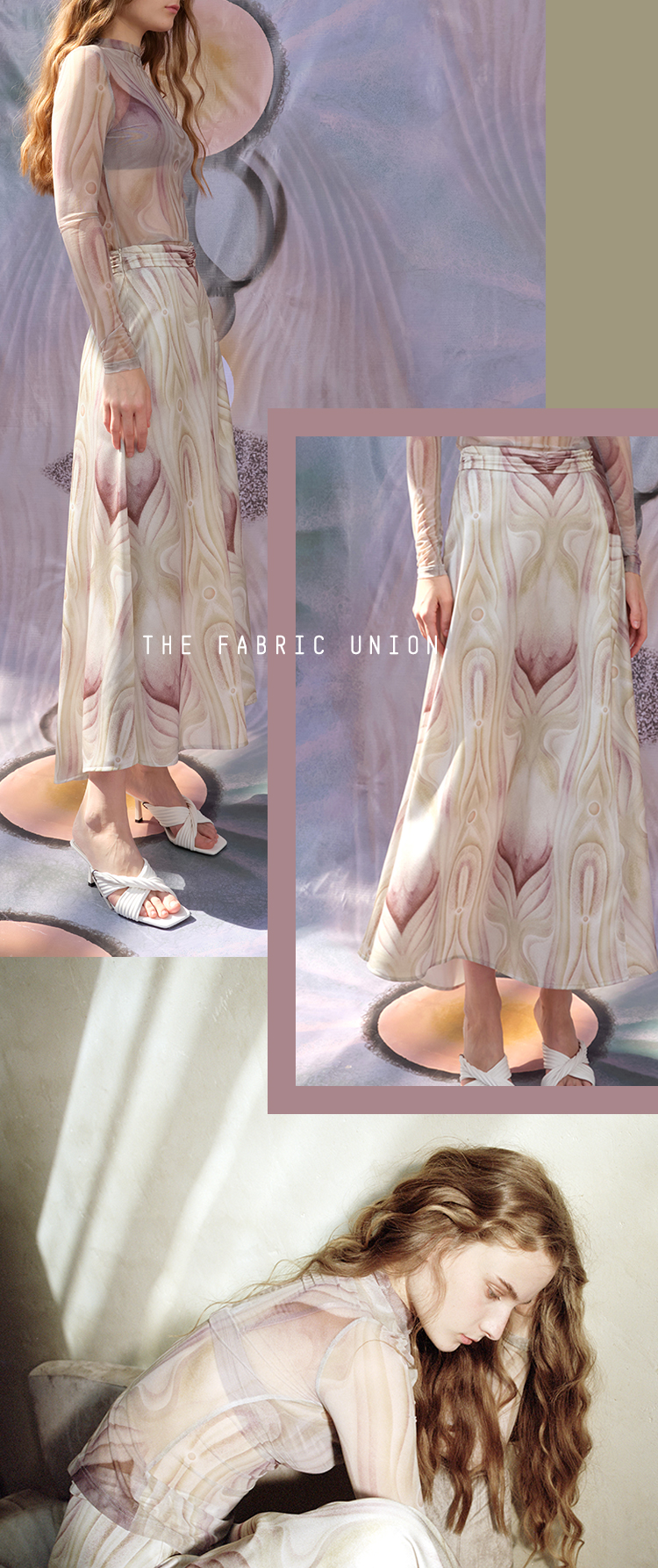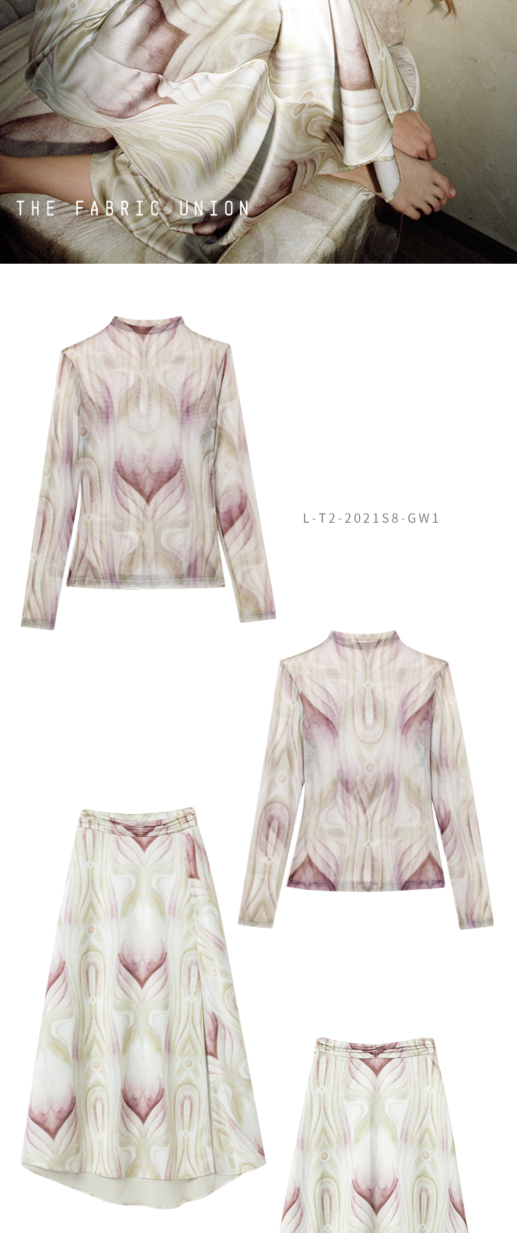 THE FABRIC UNION微透半高领打底衫缎面印花长裙
