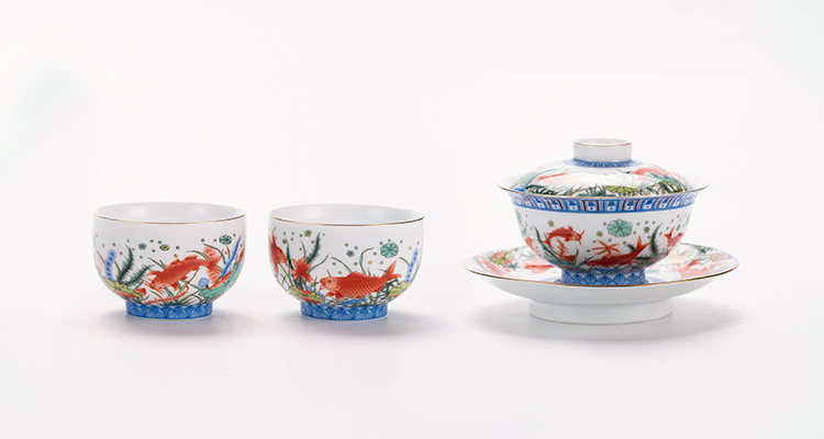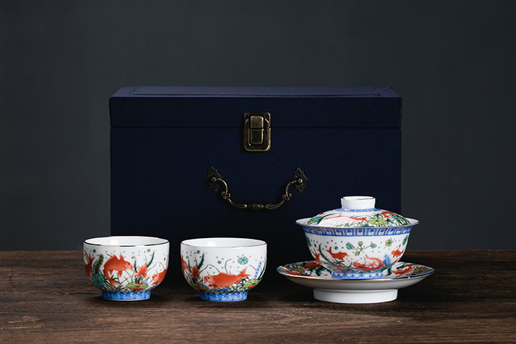 特别惊喜的是,与这只复刻版五彩鱼藻纹盖罐一起的,还有由他设计、监制的鱼藻纹缸杯和盖碗。