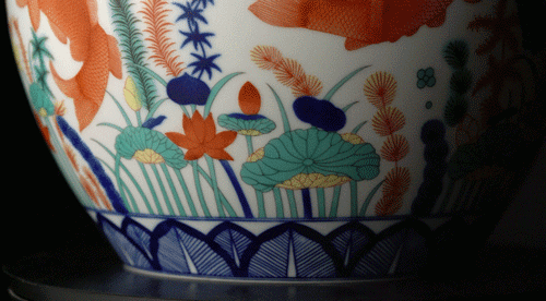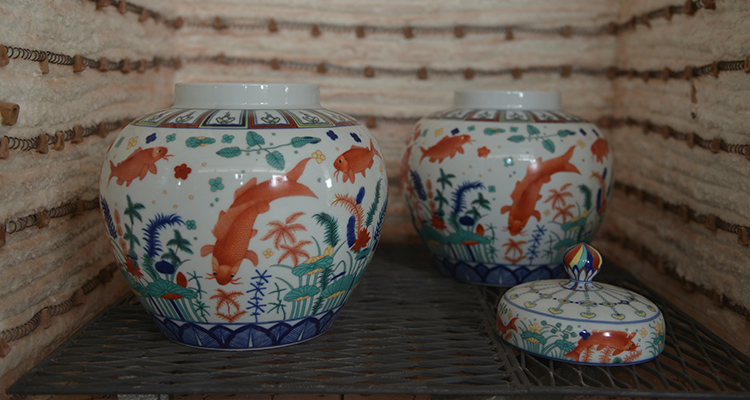 比如瓷罐上的鲤鱼,需先施以黄彩为底,再以红彩覆盖其上,用褐色勾画鱼的轮廓和鱼鳞,此法称为“黄上红”。
