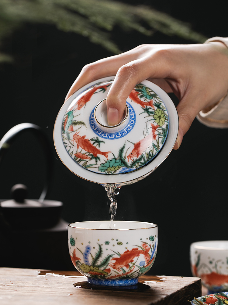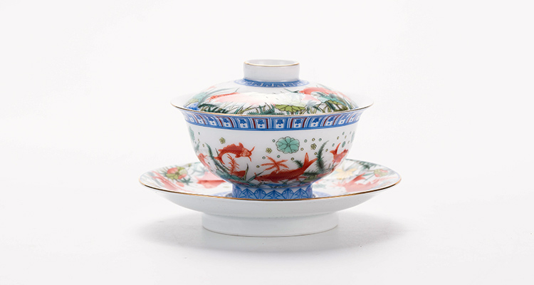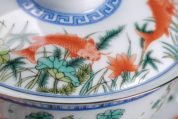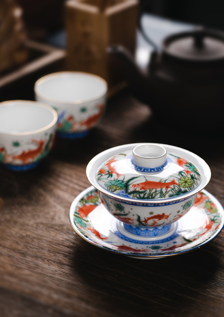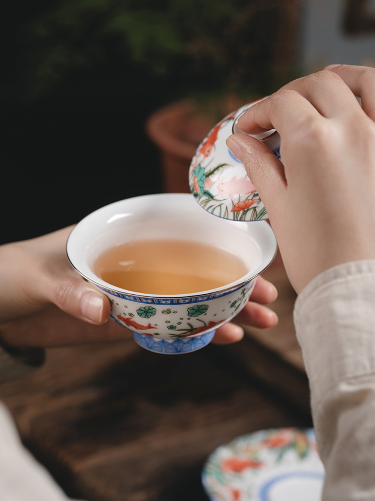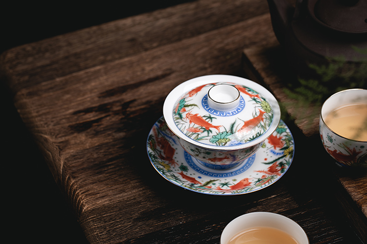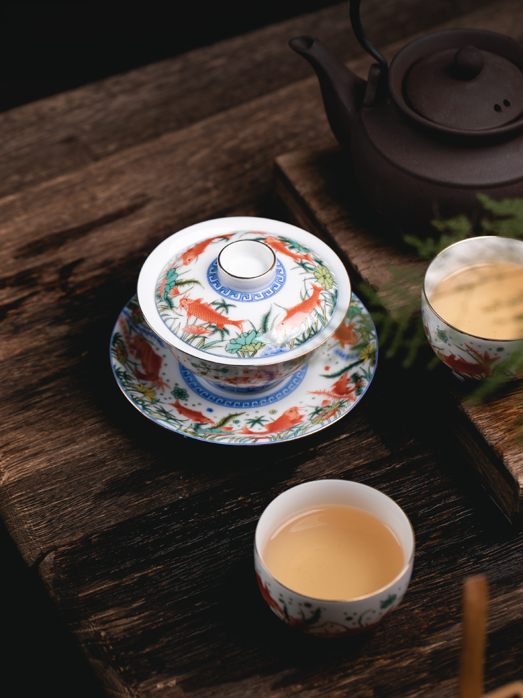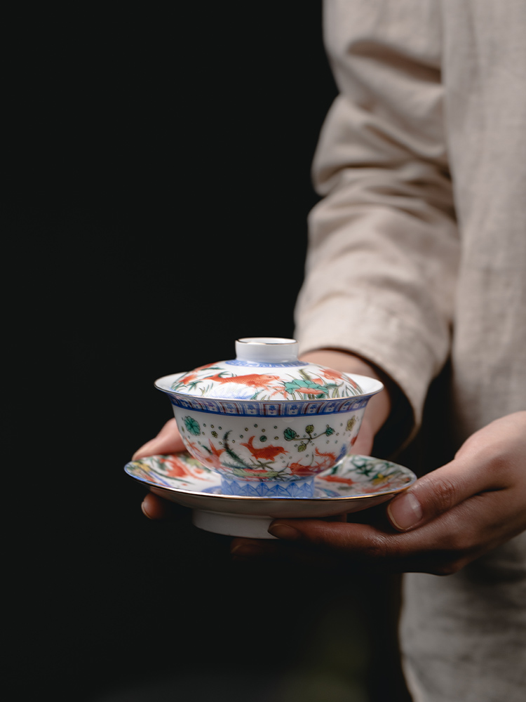 碗承、茶盖与碗身,均绘上鱼藻纹:鱼儿自然摇尾,神游于桌上,浮萍飘摇,一副安静相合之景。
