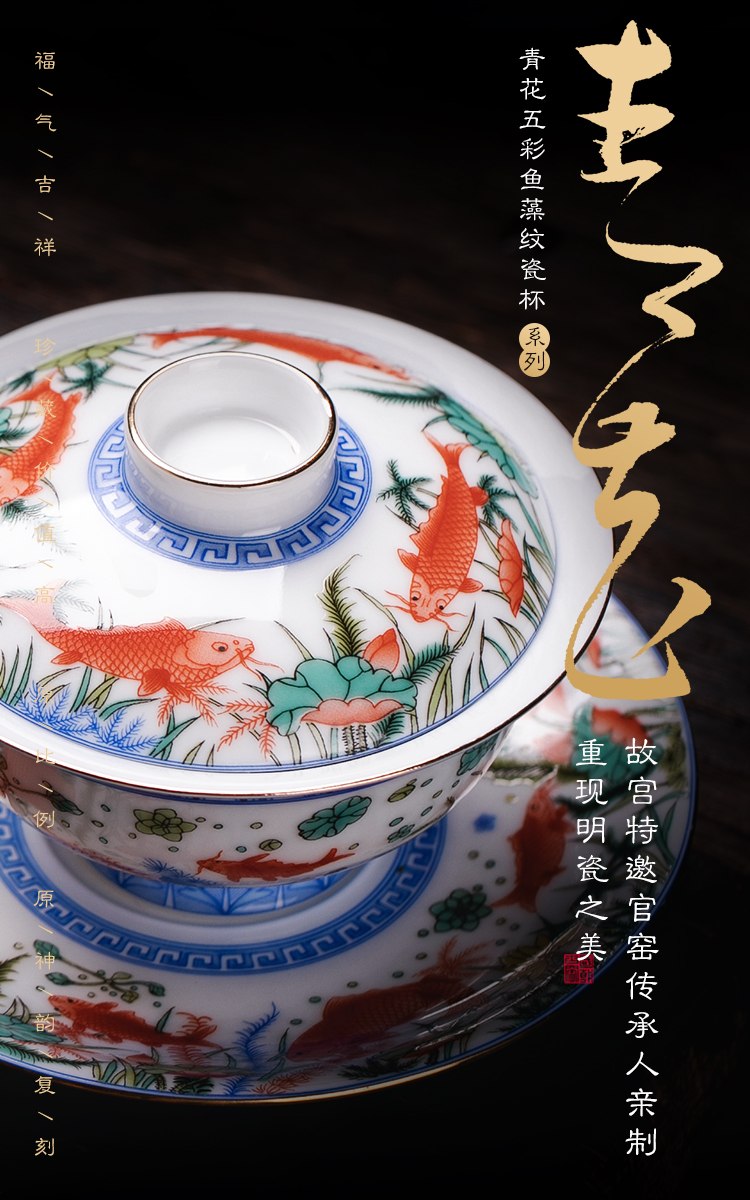 青花五彩鱼藻纹瓷杯[系列]│故宫特邀官窑传承人亲制,福气吉祥,珍藏价值高