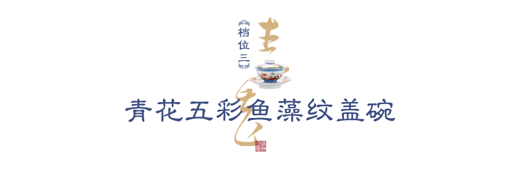 同样精妙的,还有这青花五彩鱼藻纹盖碗和品茗杯。