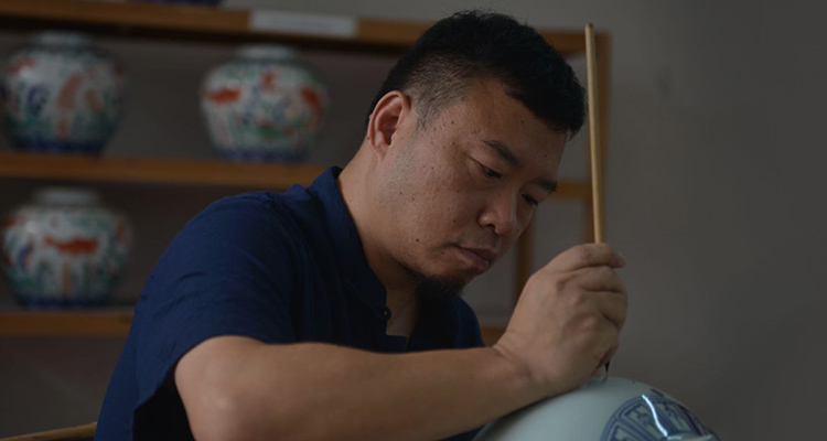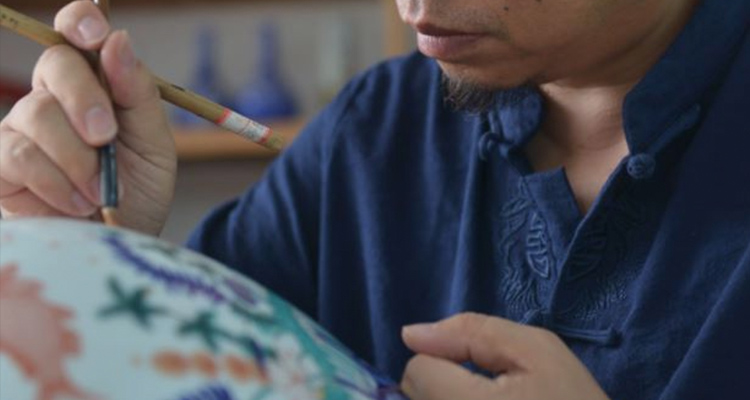 在青花的坯胎上勾线,细细勾画出轮廓。