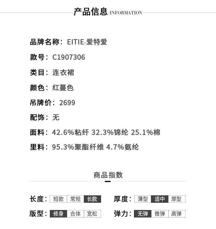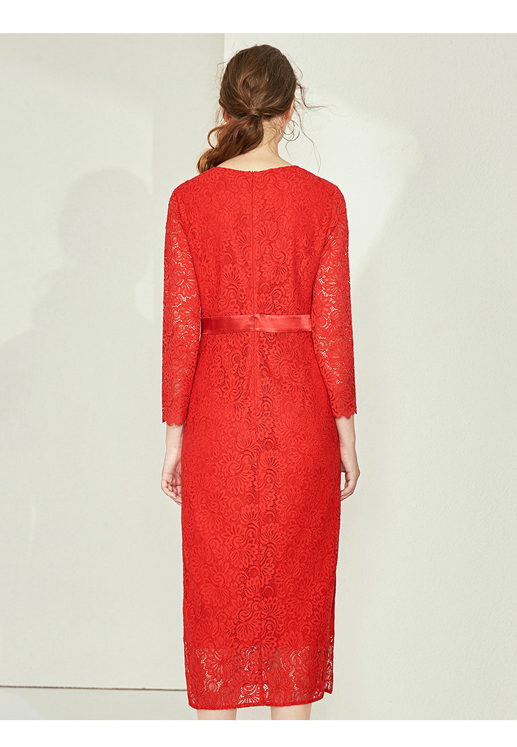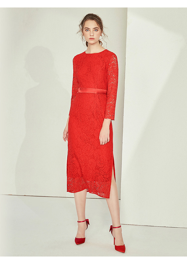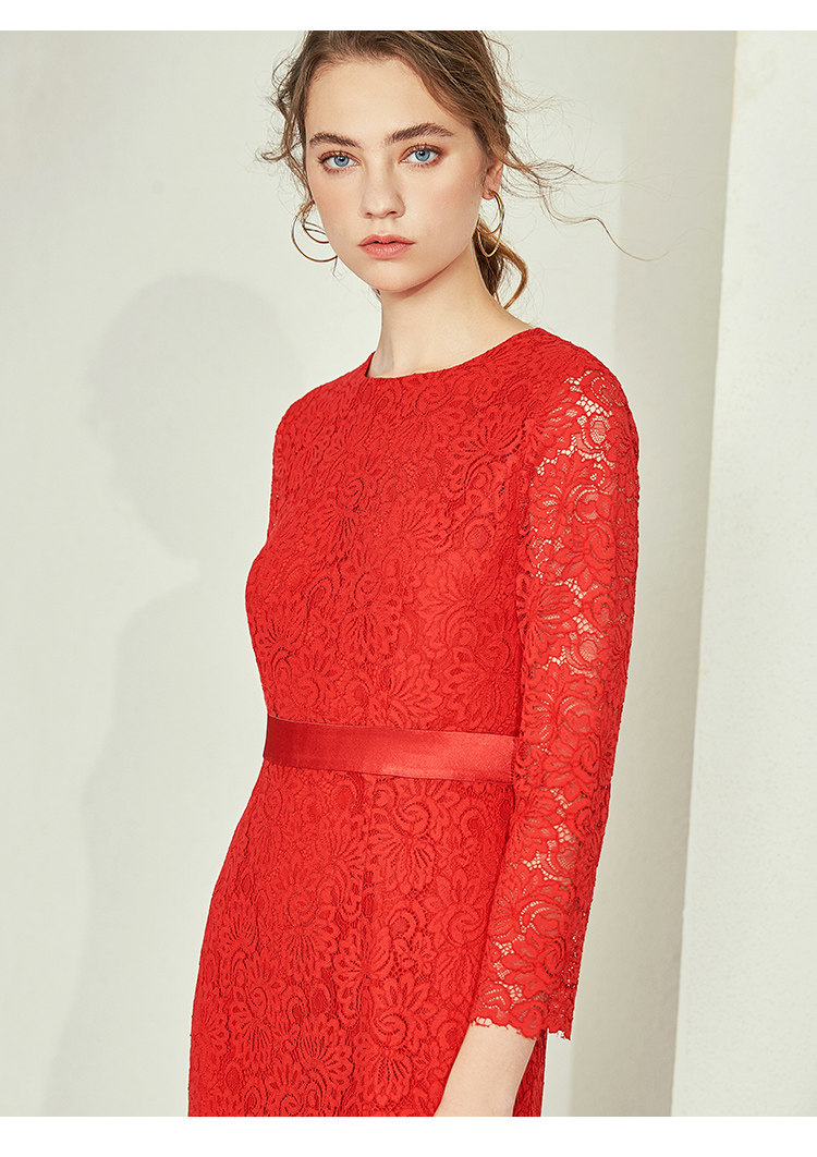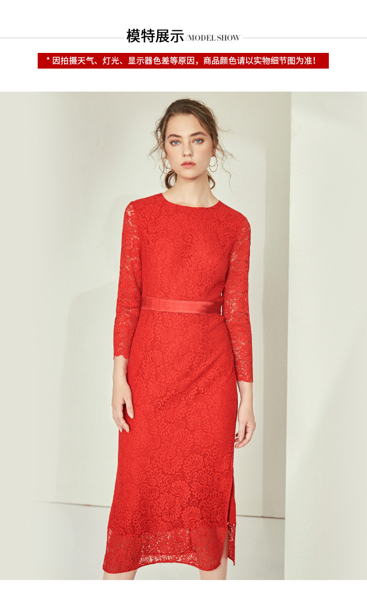EITIE爱特爱秋季九分袖收腰蕾丝茶卡盐湖红色礼服连衣裙中长C1907306